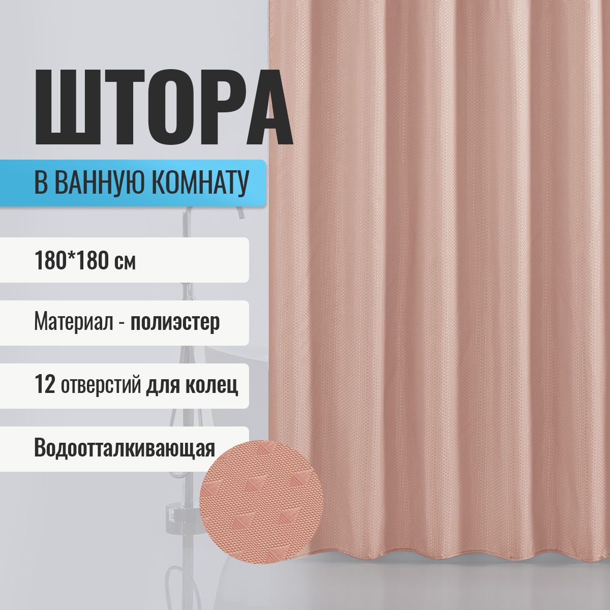 Штора однотонная - ПЕРСИК, в ванную комнату - полиэстэр 180х180