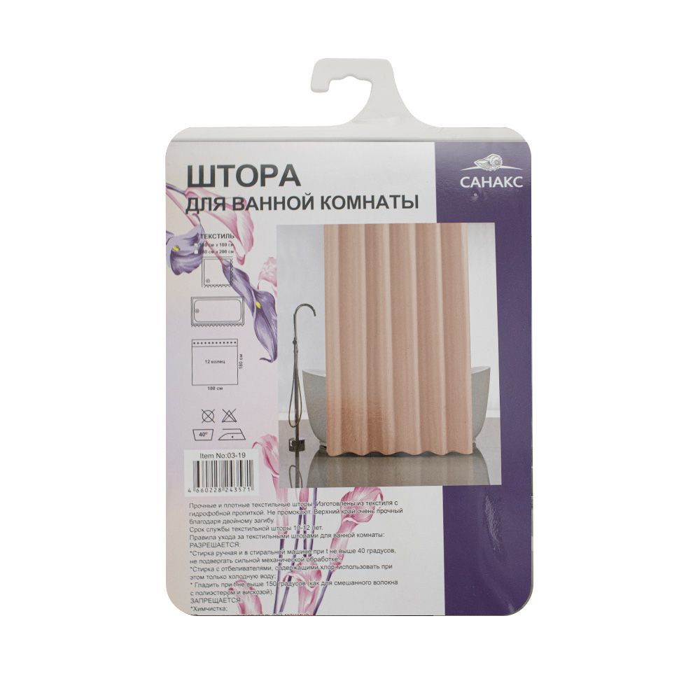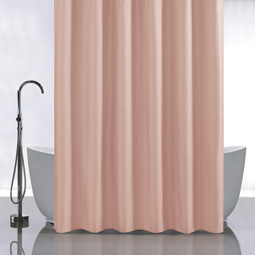 Красиво декорированная однотонная  шторка в ванную и душевую комнаты - текстурная, защищающая пол и оборудование ванной комнаты от брызг воды, изготовлена из полиэстера и обладает выраженными водоотталкивающими свойствами. Занавеска для ванной имеет в верхней части 12 отверстей обработанных на оверлоке. Такие шторки не боятся влаги и не смываются даже очень горячей водой. Водоотталкивающие шторы для ванной, пошитые из ткани плотностью 80 г/м2, не придется дополнительно утяжелять - они расправятся под своим весом и не будут липнуть к телу принимающего душ человека. При заказе данных изделий следует учесть, что яркость и оттенок рисунка на ткани могут несколько отличаться от изображения на экране монитора, а также допустимо отклонение в размерах полотна в пределах 5 см. Ширина шторы 180 см, высота 180 см. Вес - 0,500 кг, объём - 0,00166 м3