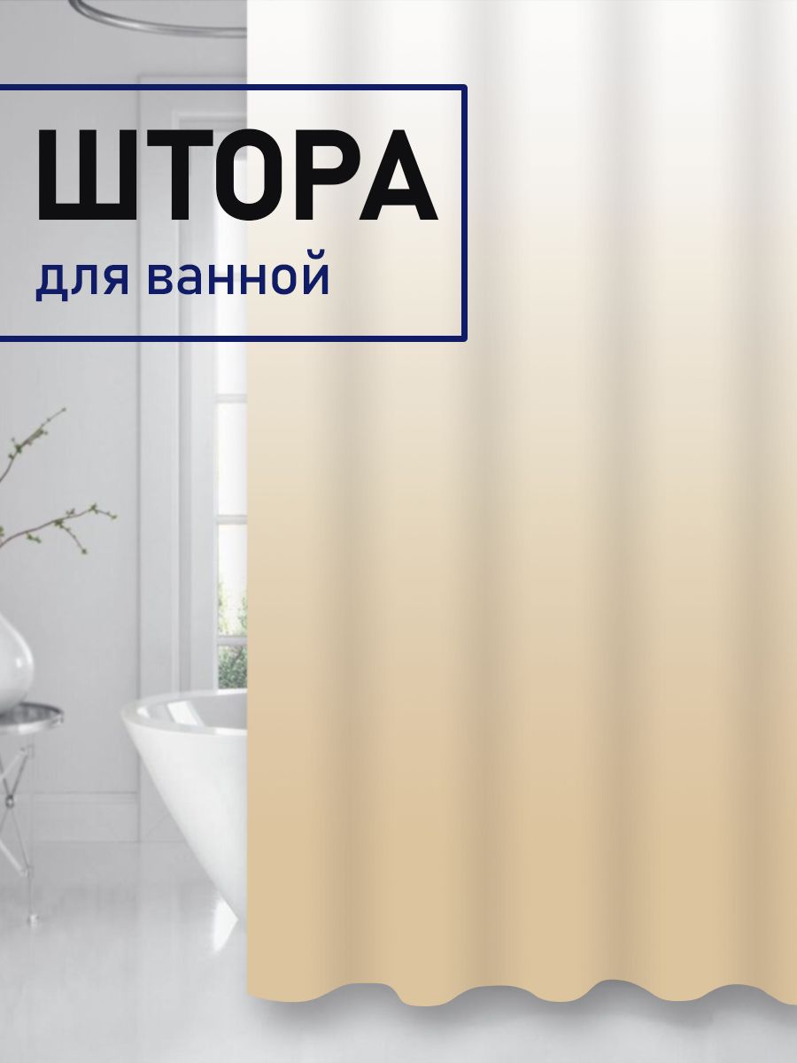 Штора для ванны бежевый переход, матовая. Штора подойдет для любого интерьера ванной комнаты, она полупрозрачная и зрительно увеличивает пространство, делает помещение светлым, а мебель и зеркало защищает от брызг. Шторка легкая, но достаточно плотная, водоотталкивающая, имеет стандартные размеры 180 х180 сантиметров. Верхний край шторы уплотнен, для более надежного крепления на кольца, отверстия для колец обрамлены металлическими люверсами из нержавеющей стали. В комплекте прочные пластиковые кольца в количестве 12 штук для крепления к штанге. Изготовлена из современного экологичного материала PEVA, который имеет ряд преимуществ перед другими материалами. В отличии от тканевой она абсолютно водонепроницаема и может не сразу приклеиться к ванне, чтобы улучшить прилипание, полейте бортик ванной водой из душевой лейки. В отличие от шторы из ПВХ, не имеет в составе вредных примесей, токсинов и хлора, гипоаллергенна и без запаха, материал, устойчивый к образованию грибка и плесени. Упакована в прочный пакет. Вес