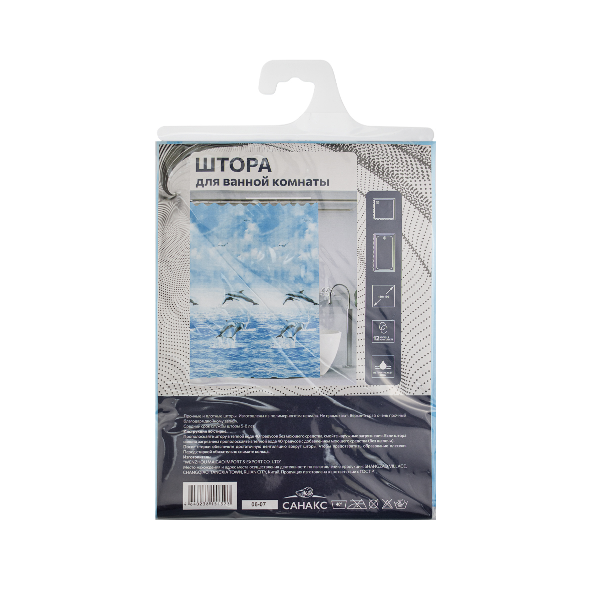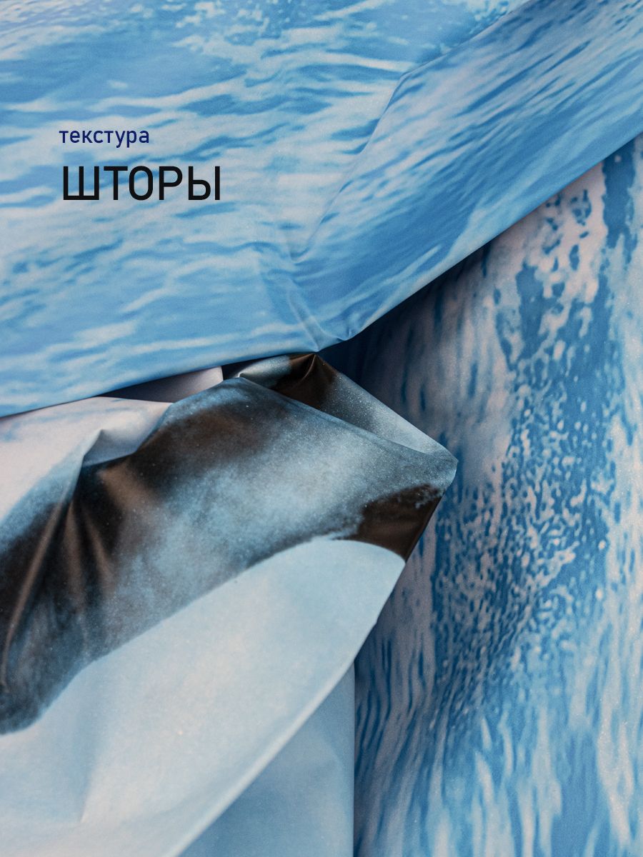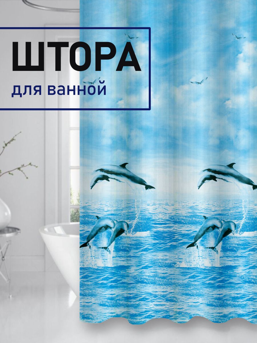 Штора с рисунком, дельфины, матовая, в ванную комнату, с кольцами, PEVA, 180 х 180 см.