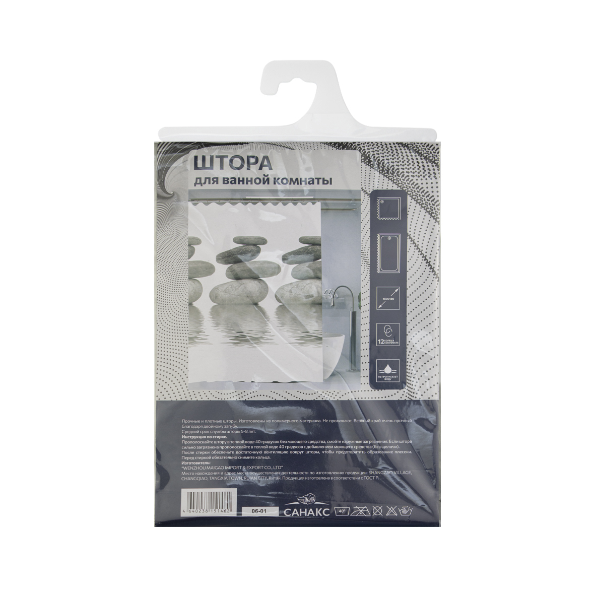 Штора для ванной комнаты, ЧЕРНАЯ матовая, рельефная, с кольцами, 180 х180 см, PEVA