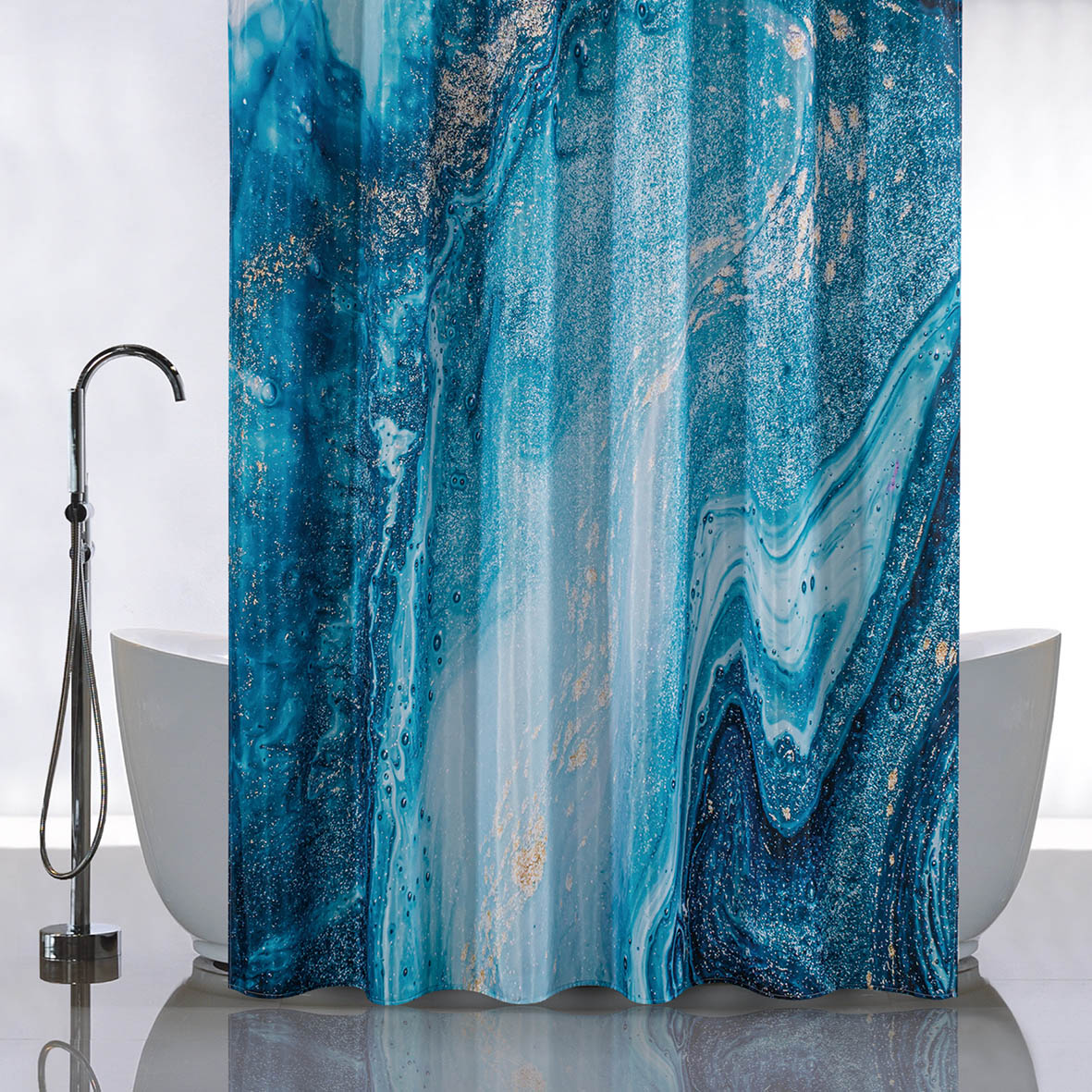 Штора с рисунком ГОЛУБОЙ МРАМОР с ЗОЛОТОМ, в ванную комнату, без колец - полиэстэр, 180 х 180 см.
