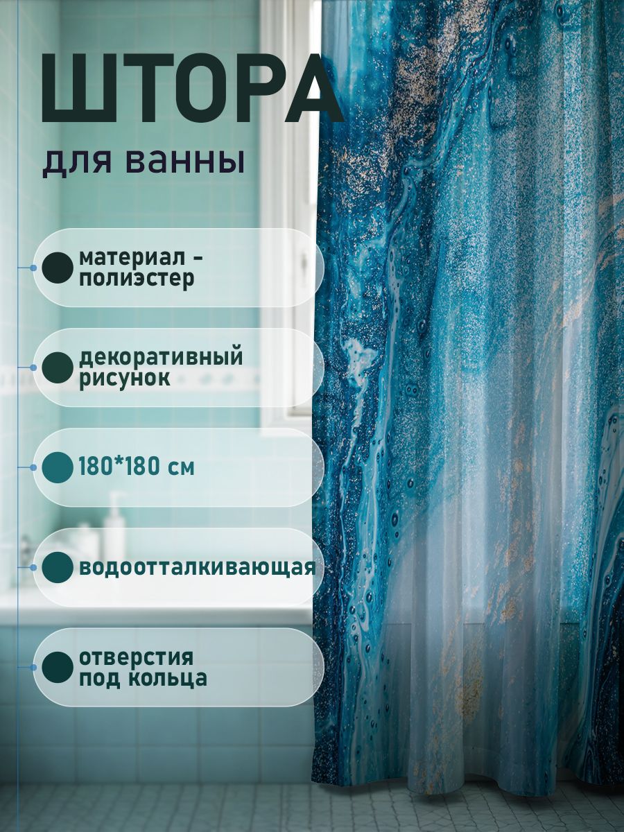 Штора с рисунком СИНИЙ МРАМОР с СЕРЕБРОМ, в ванную комнату, без колец - полиэстэр, 180 х 180 см.