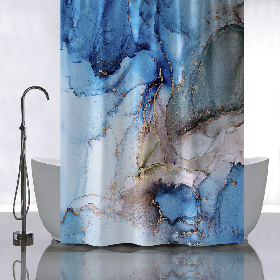 Штора с рисунком ГОЛУБОЙ МРАМОР с ЗОЛОТОМ, в ванную комнату, без колец - полиэстэр, 180 х 180 см.