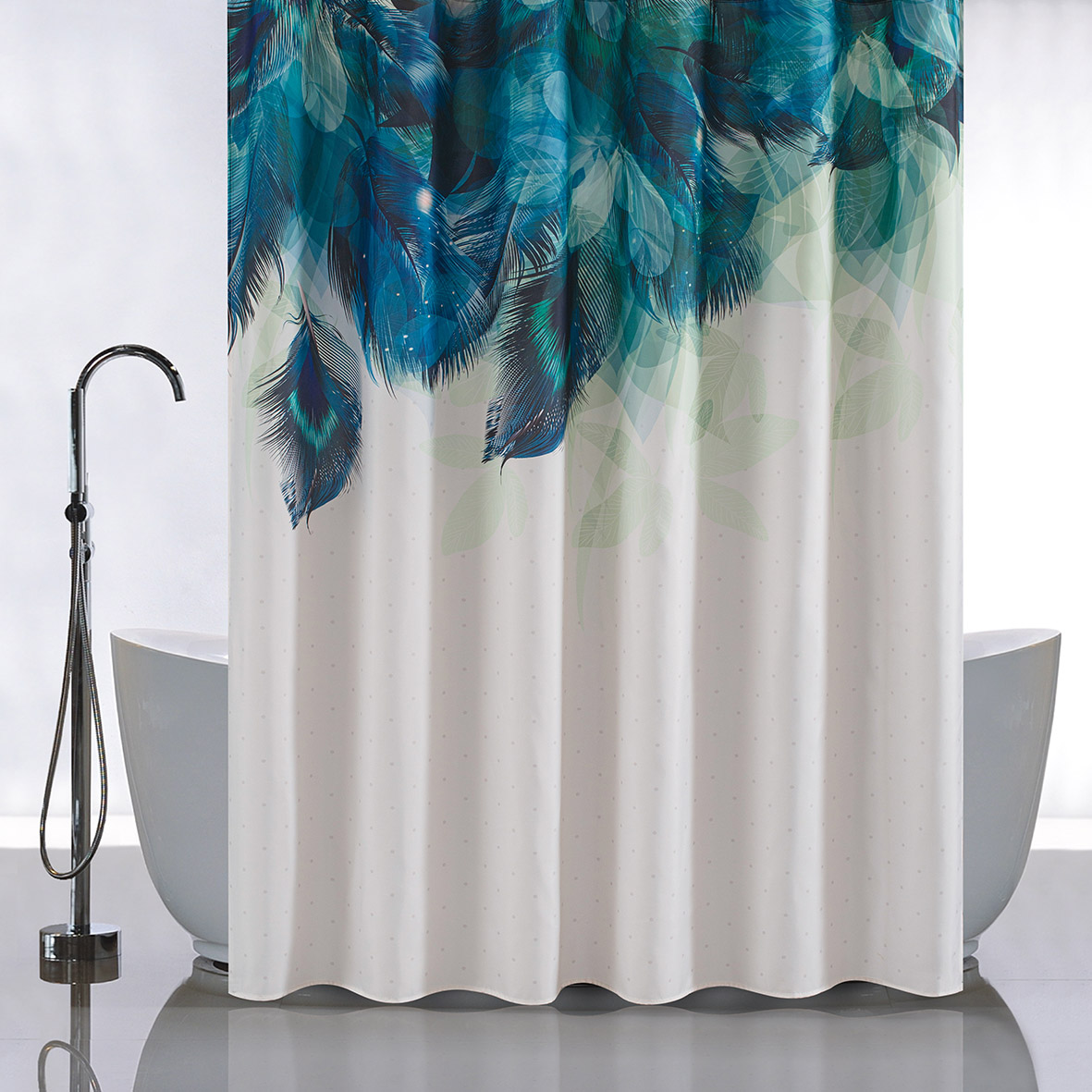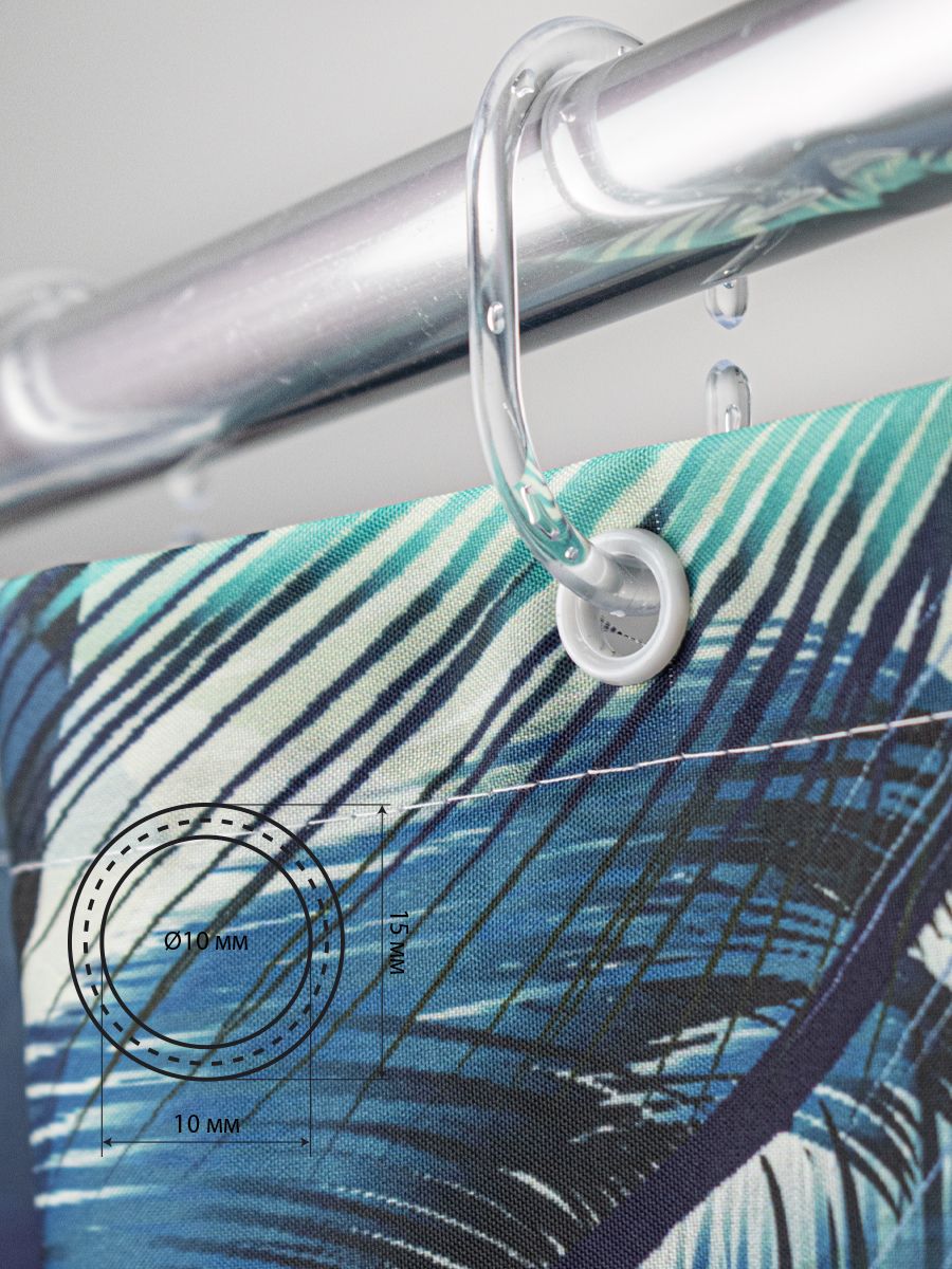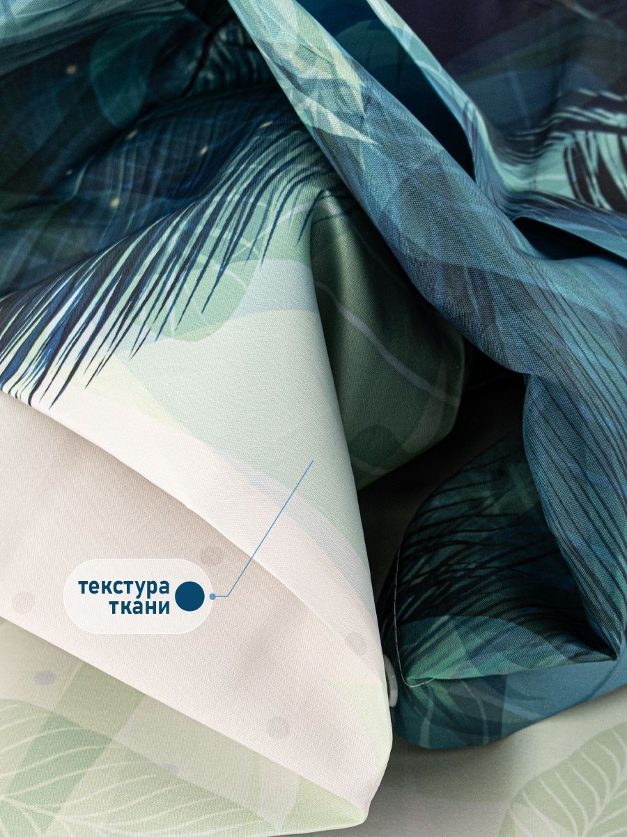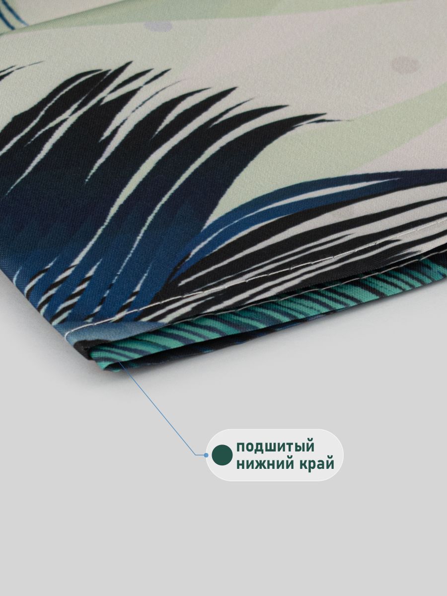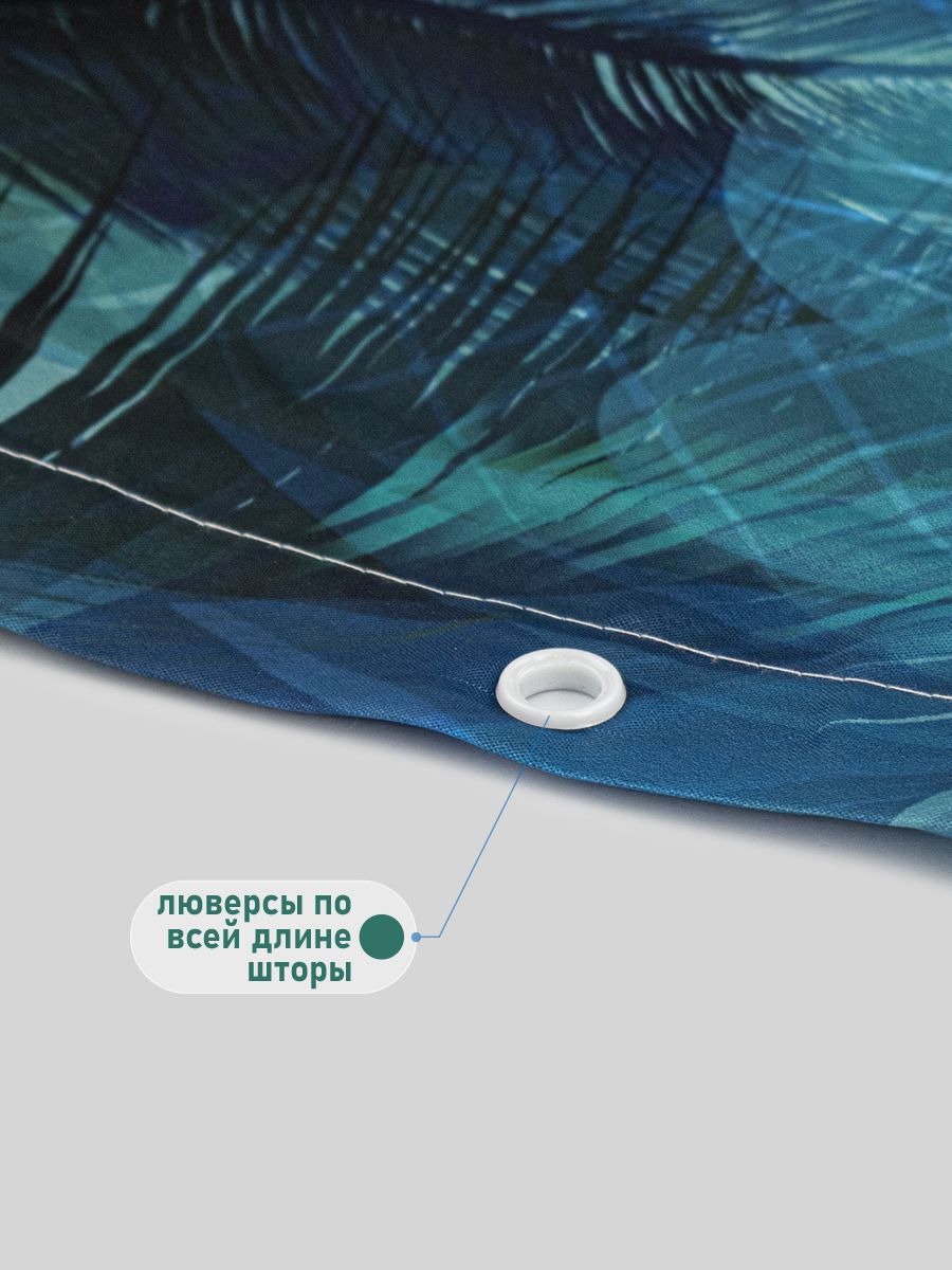 Штора с рисунком зелёные перья, в ванную комнату, без колец - полиэстэр