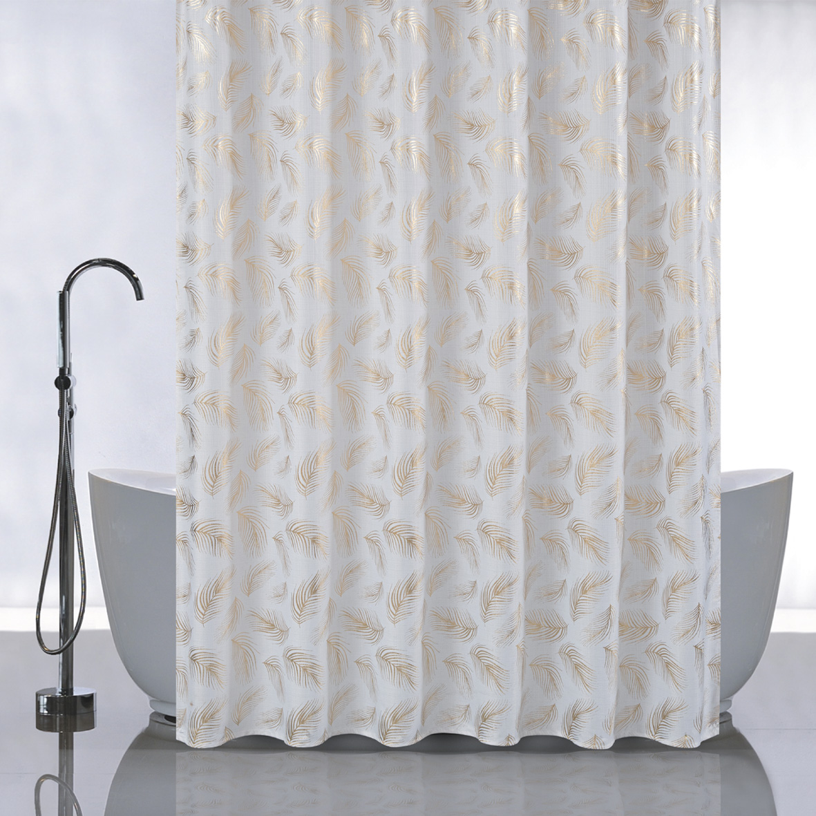 Штора с рисунком, золотые перья на белом, в ванную комнату, без колец - полиэстэр, 180 х 180 см