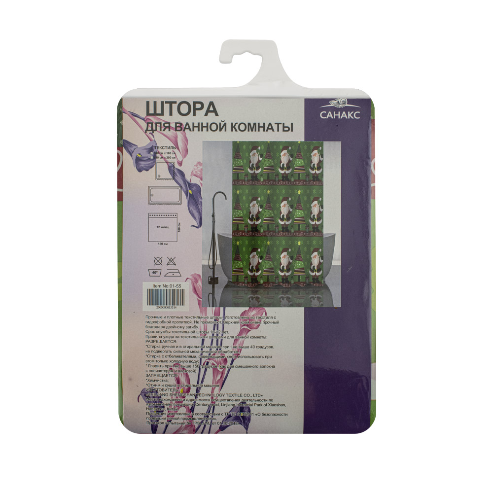 Штора с рисунком, ДЕД МОРОЗ, в ванную комнату, без колец, полиэстэр