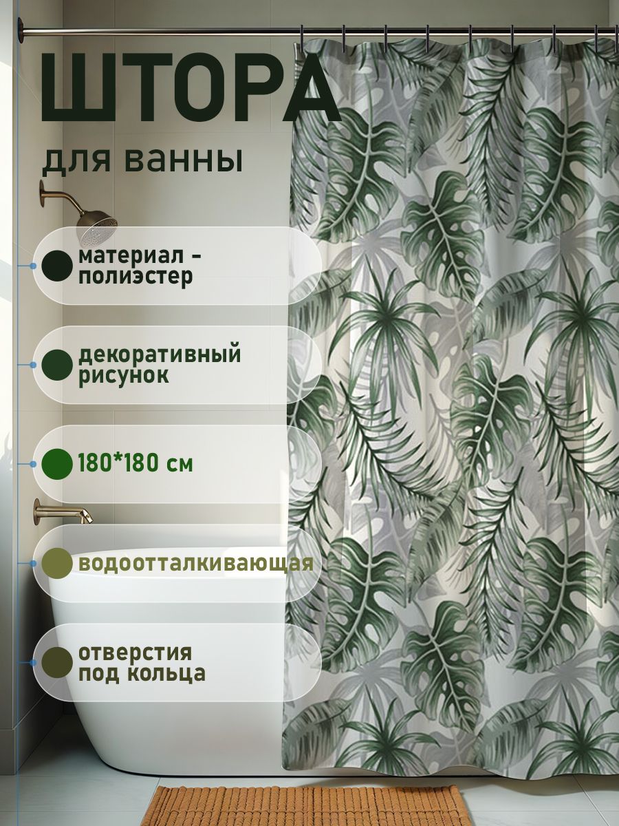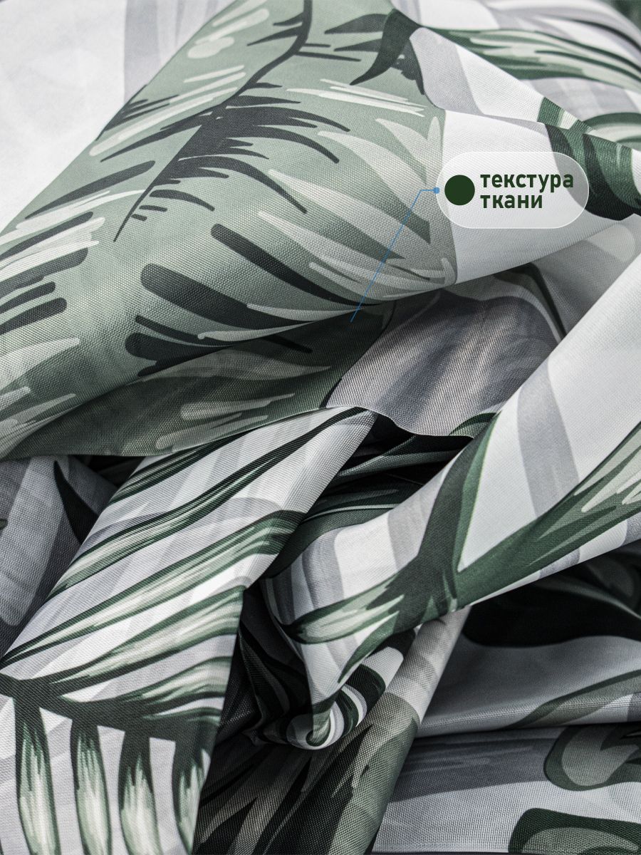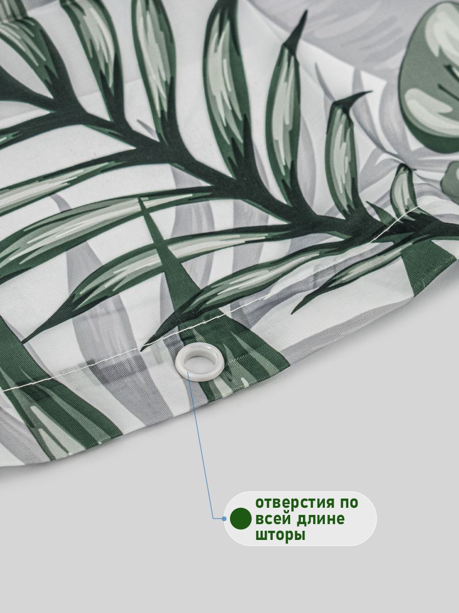 Штора с рисунком, МОНСТЕРА, в ванную комнату, без колец, полиэстэр