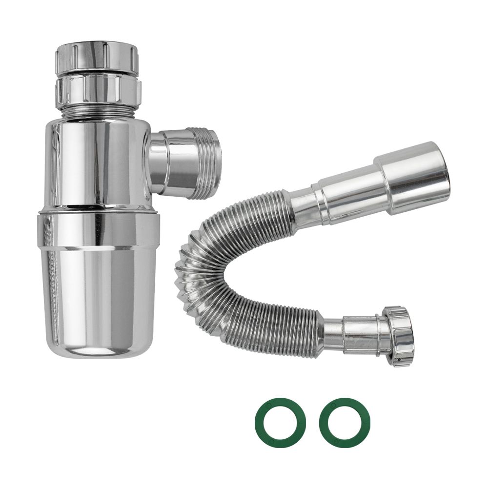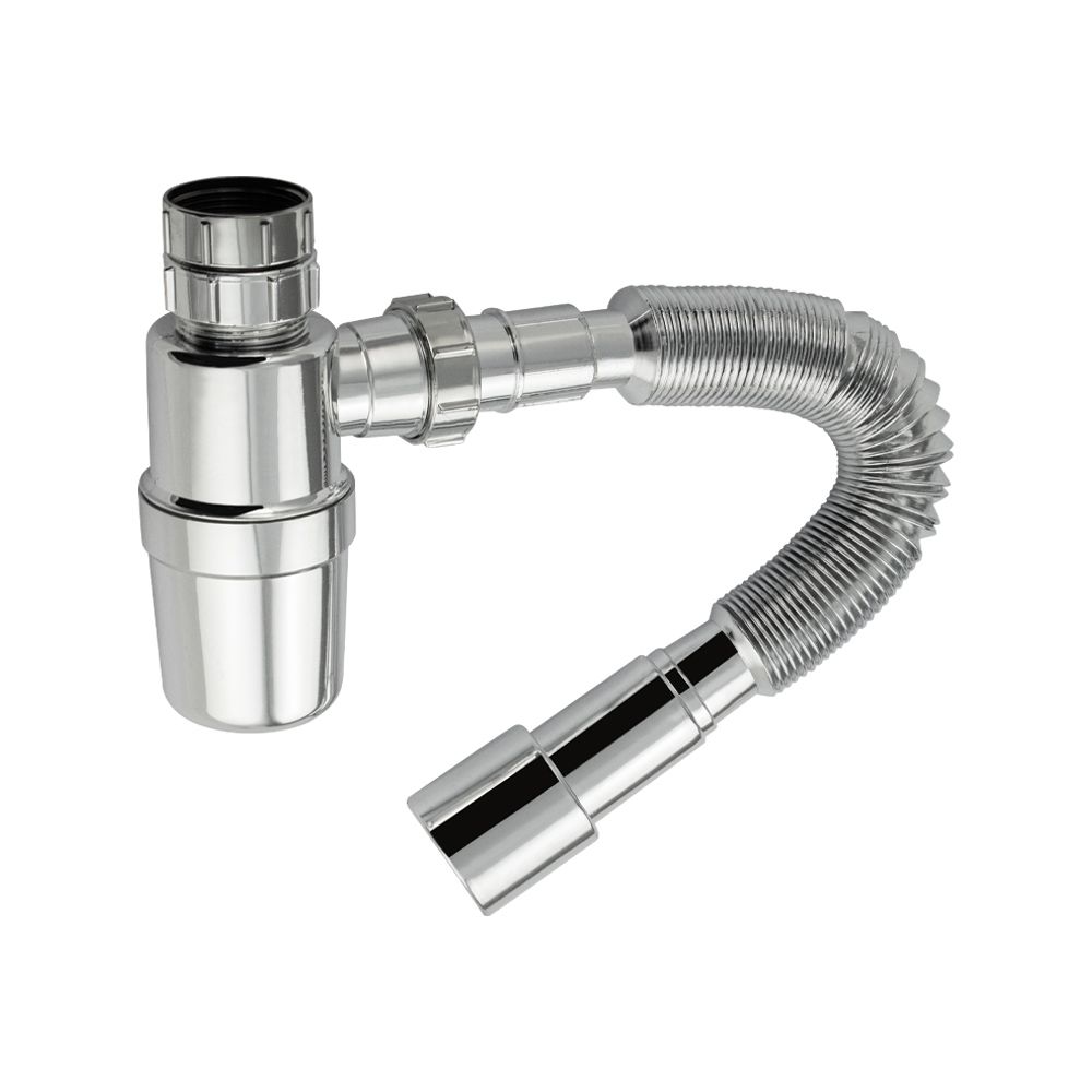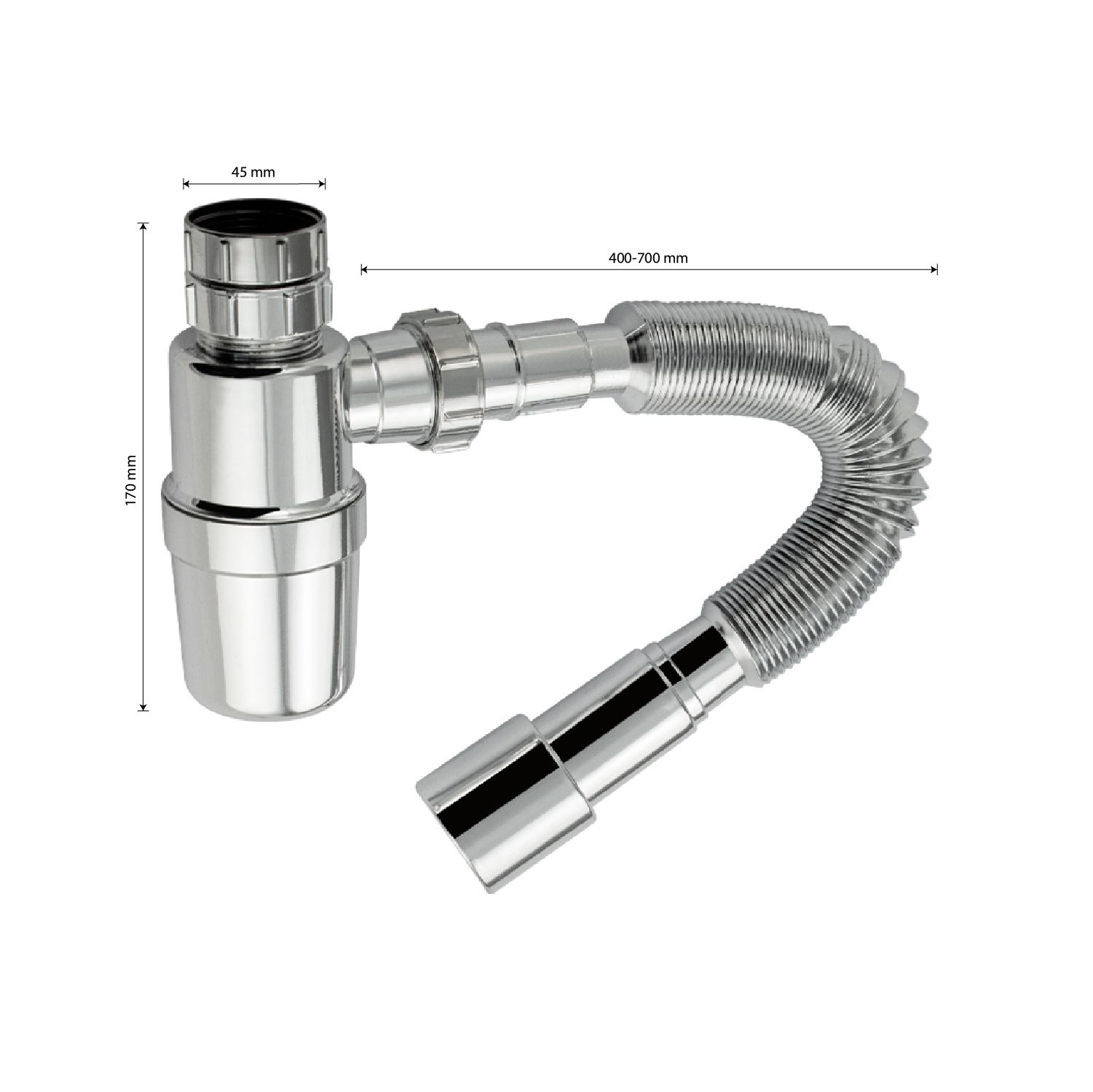 Сифон для кухонных моек и раковин, хромированный, бутылочного типа. С разборным выпуском без горловины, из высокопрочного пластика АБС с бутылочным гидрозатвором от проникновения запахов. Форма сифона позволяет поддерживать хорошую пропускную способность слива сточной воды, выполняя свою главную функцию - формирование гидрозатвора для отсечения неприятных запахов из канализации. Конструкция позволяет легко, без демонтажа, снять отстойник (стакан) и почистить сифон в случае засорения, достать случайно упавшие в слив раковины мелкие ценные вещи. Сифон прост в установке. Габаритные размеры: длина 400-700 мм, высота стакана 170 мм, верхняя крышка 45 мм. Комплект: сифон, уплотнения. Вес - 0.300 кг, объём - 0.00205 м3.