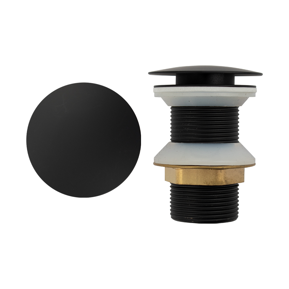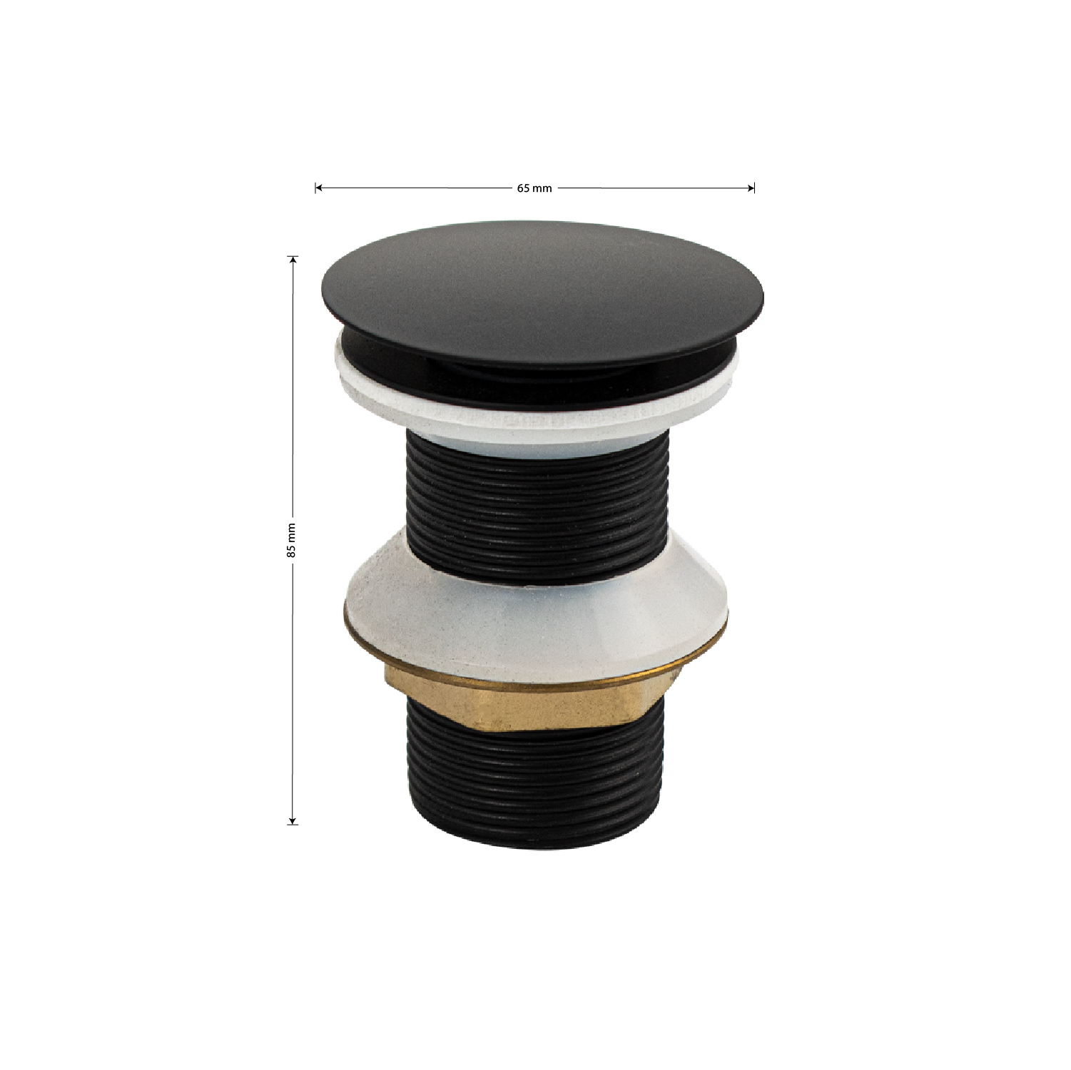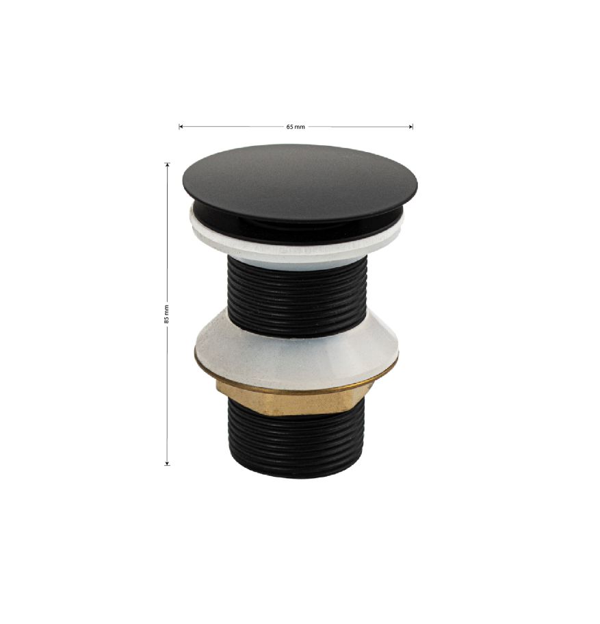 Донный клапан из нержавеющей стали чёрного цвета, без перелива, представляет собой несложный механизм, который устанавливается непосредственно в сливное отверстие раковины и работает как пробка, с системой “Клик-Клак” 1 ¼' и с большой заглушкой клапан надежно закроет сливное отверстие раковины. Нужно использовать для умывальников без перелива. Габариты и параметры: высота 85 мм, диаметр 65 мм. Вес - 0,25 кг, объём - 0,00053 м3