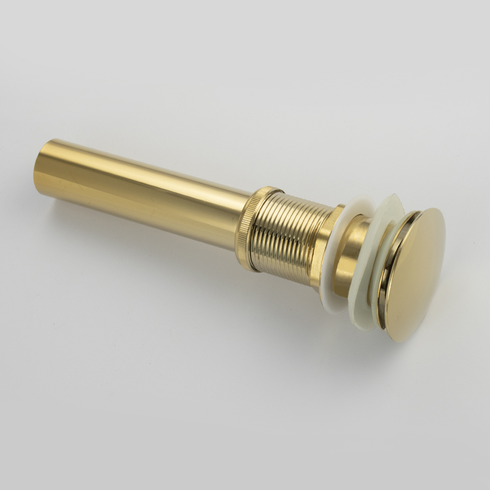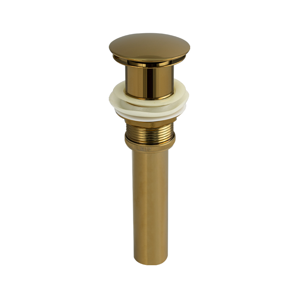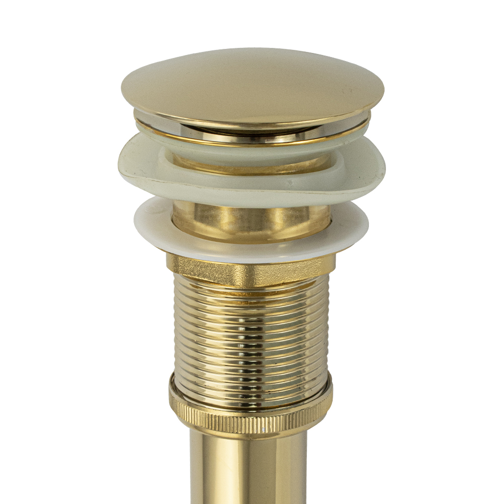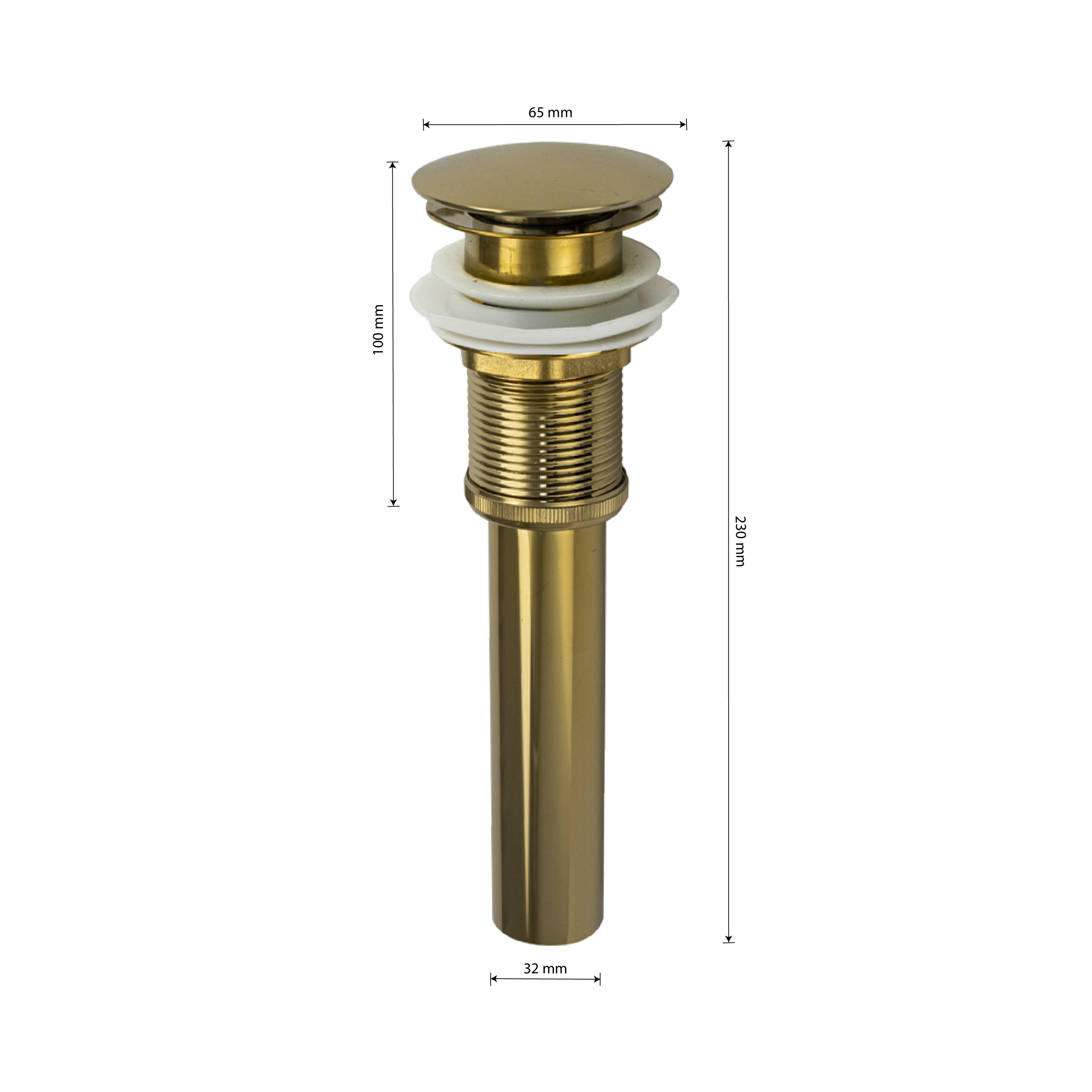 Донный клапан из нержавеющей стали, цвет золото, без перелива представляет собой несложный механизм, который устанавливается непосредственно в сливное отверстие раковины и работает как пробка, с системой “Клик-Клак” 1 ¼' и с большой заглушкой клапан надежно закроет сливное отверстие раковины. Нужно использовать для умывальников с переливом . Габаритные размеры: высота 230 мм, диаметр 65 мм. Вес - 0,400 кг, объём - 0,00125 м3.