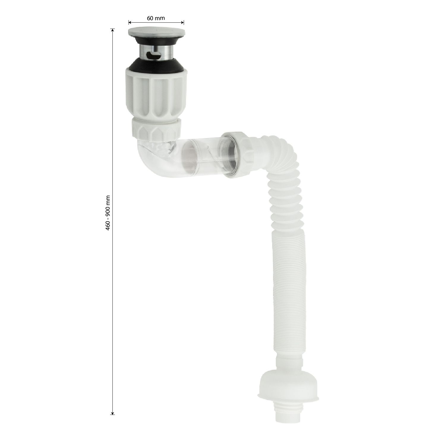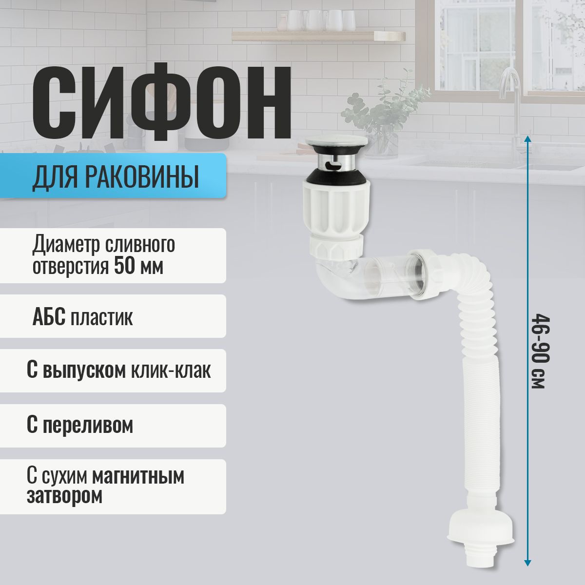 Сифон с гофрой для раковин ванной комнаты, душа или кухонной мойки, из высокопрочного пластика АБС предназначена для слива воды из мойки или раковины. Сифон комплектуется металлическим выпуском "клик-клак" с сеткой. В центре системы установлен чувствительный лепесток, который даже при незначительном попадании воды срабатывает на слив, а при отсутствии воды плотно перекрывает потоки запахов из канализации. Он герметично соединяет раковину с канализационной сетью. Гофрированный сифон блокирует неприятные запахи из канализации. В трубе всегда есть небольшое количество воды, которая и предотвращает появление неприятных запахов. Регулируемая длина гофры позволяет установить раковину на нужном расстоянии от канализации. Качественный водопровод — залог чистоты в ванной комнате. Габаритные размеры: диаметр присоединительного отверстия 50 мм, диаметр стока 60 мм, длина 400-900 мм. Вес - 0,600 кг, объём - 0,00400 м3.