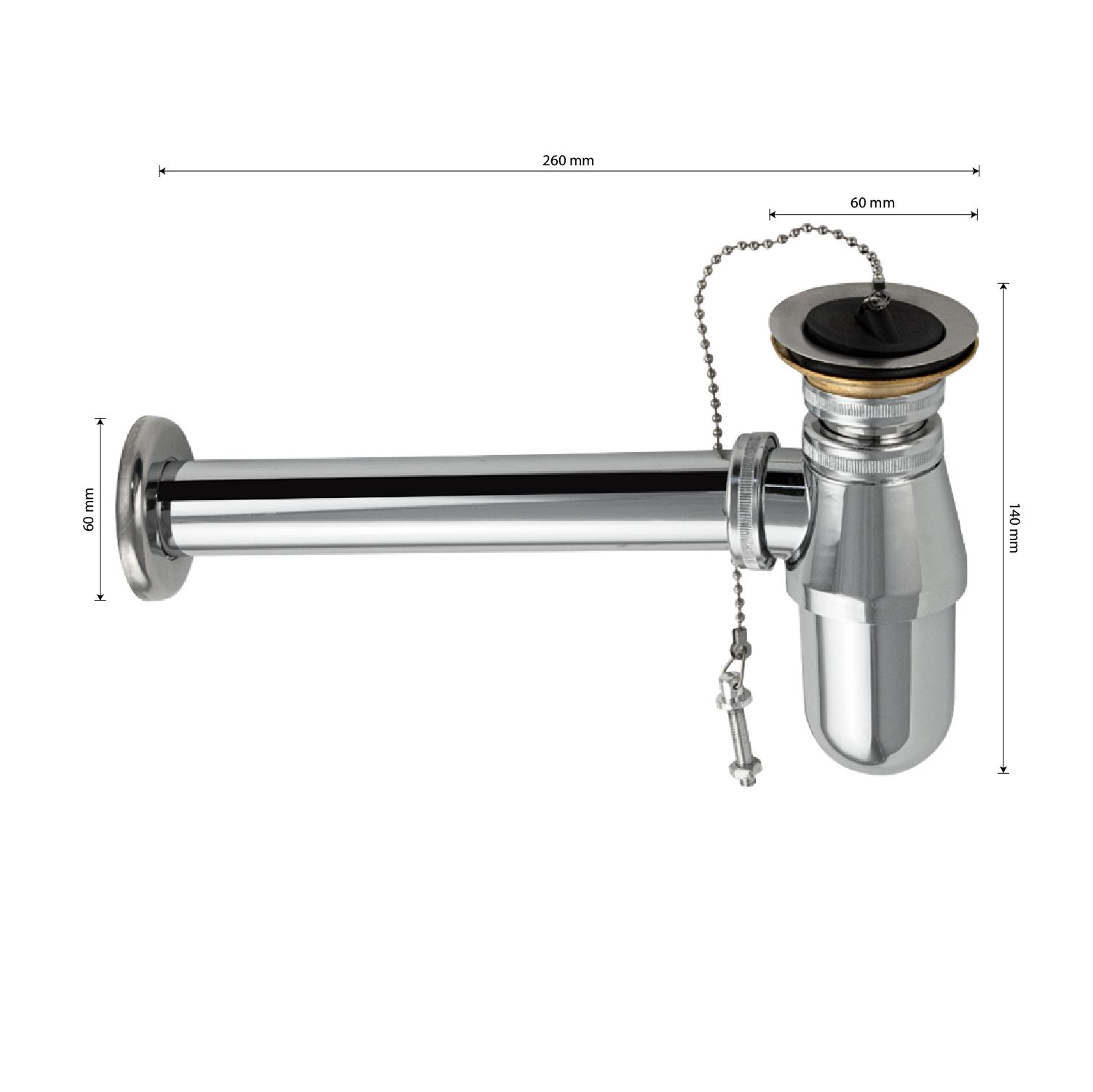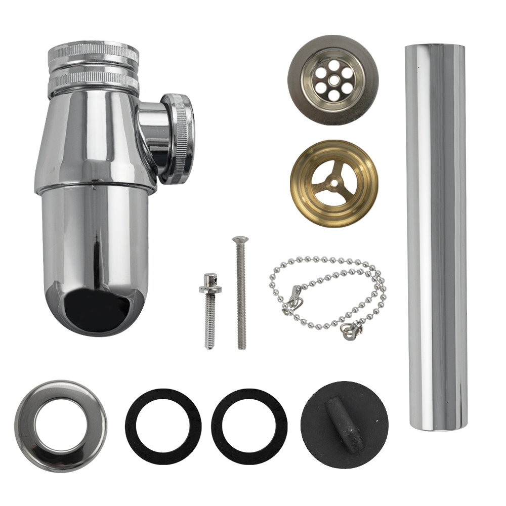 Сифон для раковины хромированный, с нержавеющей решеткой и пробкой это эстетичное и функциональное устройство для подключения раковины к системе канализации. Бутылочная модель изготовлена из нержавеющей стали, что обуславливает ее высокую прочность и долговечность. Она устойчива к перепаду температур, поэтому в раковину можно сливать кипяток. Хромированная поверхность сохраняет зеркальный блеск даже после длительной эксплуатации, поверхность не требует особого ухода – достаточно просто протереть. Изделие с фиксированной погружной трубкой легко собирается и монтируется. Габаритные размеры: высота 140 мм, длина 260, диаметр 32 мм. Вес - 0,400 кг, объём - 0,00276 м3. Габаритные размеры коробки: ширина 205 мм, высота 60 мм, глубина 110 мм.
