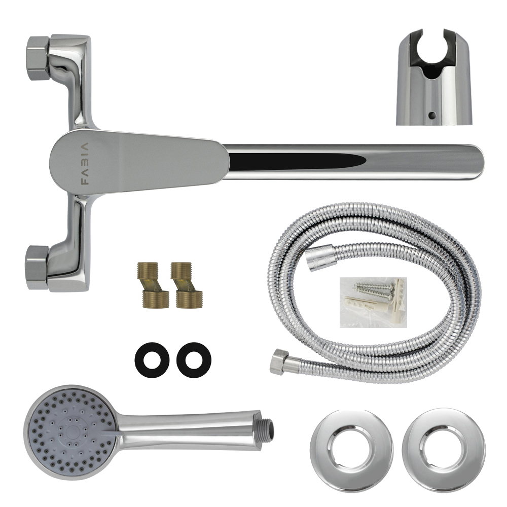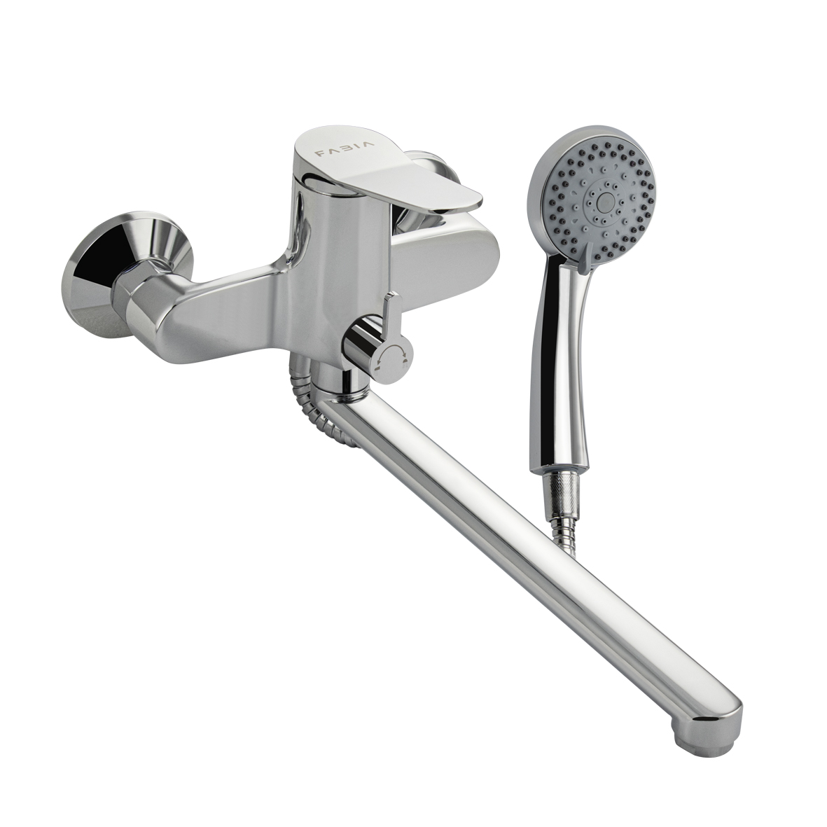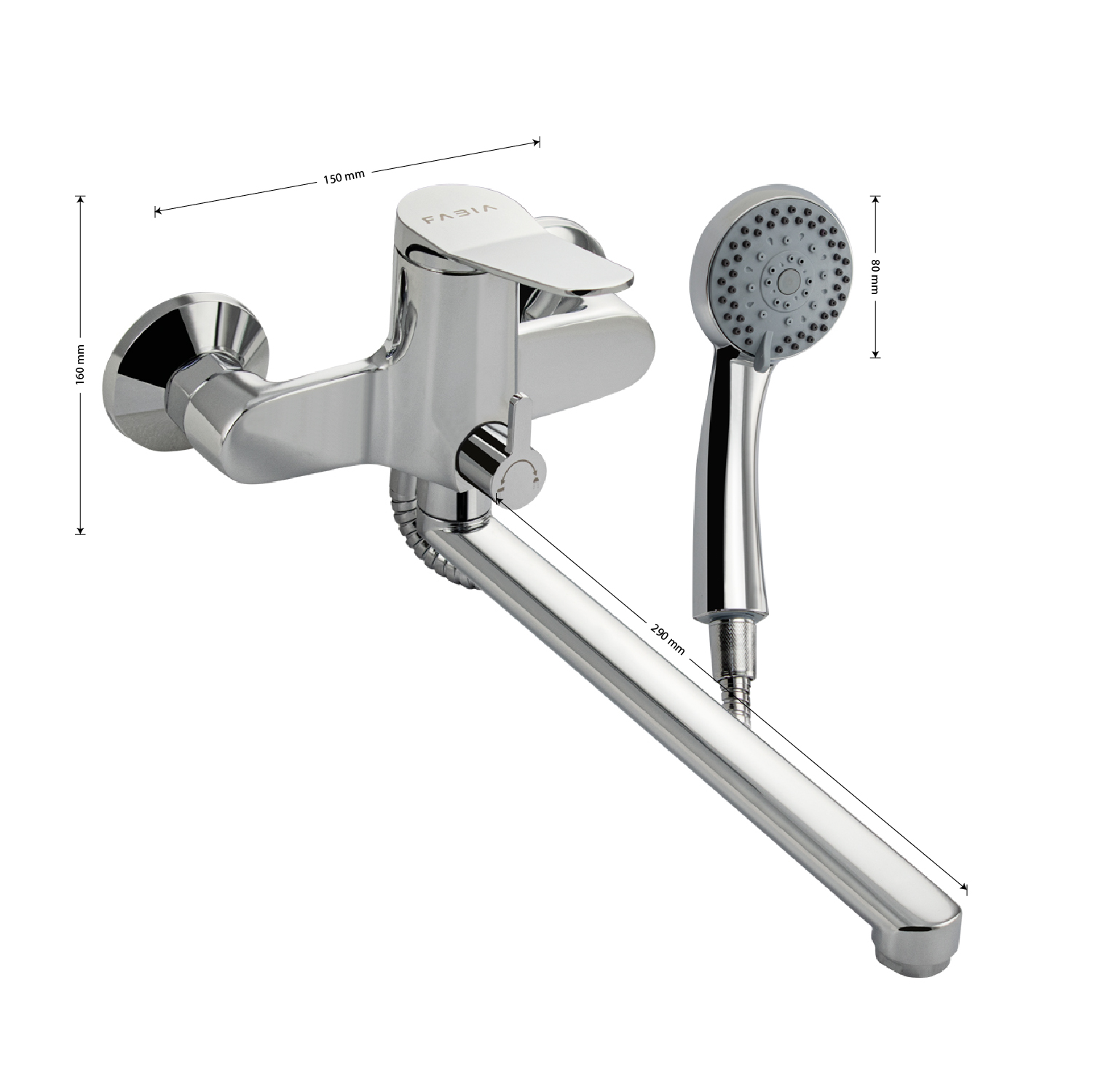 Смеситель хромированный в ванную / душевую комнату с длинным, плоским изливом, тяжёлый, массивный корпус, шаровый, с дивертором м/к на корпусе. Материал изготовления — ЦАМ (цинк-алюминий-медь) + нержавеющая сталь. Картридж d = мм, литая ручка, аэратор для экономии воды, чашки и эксцентрики из нержавеющей стали. Габаритные размеры: ширина 150 мм, высота корпуса 160 мм, длина излива 290 мм, душевая лейка 80 мм, шланг 150 см. Вес - 1,65 кг, объём - 0,00521 м3. В комплекте паспорт, корпус с изливом, дивертор, душевая лейка, шланг, кронштейн, комплект крепежа и прокладок.