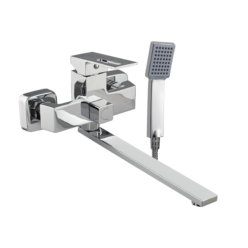 Смеситель хромированный в ванную / душевую комнату с длинным, плоским изливом, тяжёлый, массивный квадратный корпус, шаровый, с дивертором м/к на корпусе, ручка с прорезью. Материал изготовления — ЦАМ (цинк-алюминий-медь) + нержавеющая сталь. Картридж d = мм, литая ручка, аэратор для экономии воды, чашки и эксцентрики из нержавеющей стали. Габаритные размеры: ширина 150 мм, высота корпуса 105 мм, длина излива 300 мм, душевая лейка 210 мм, шланг 150 см. Вес - 1,8 кг, объём - 0,00508 м3. В комплекте паспорт, корпус с изливом, дивертор, душевая лейка, шланг, кронштейн, комплект крепежа и прокладок.