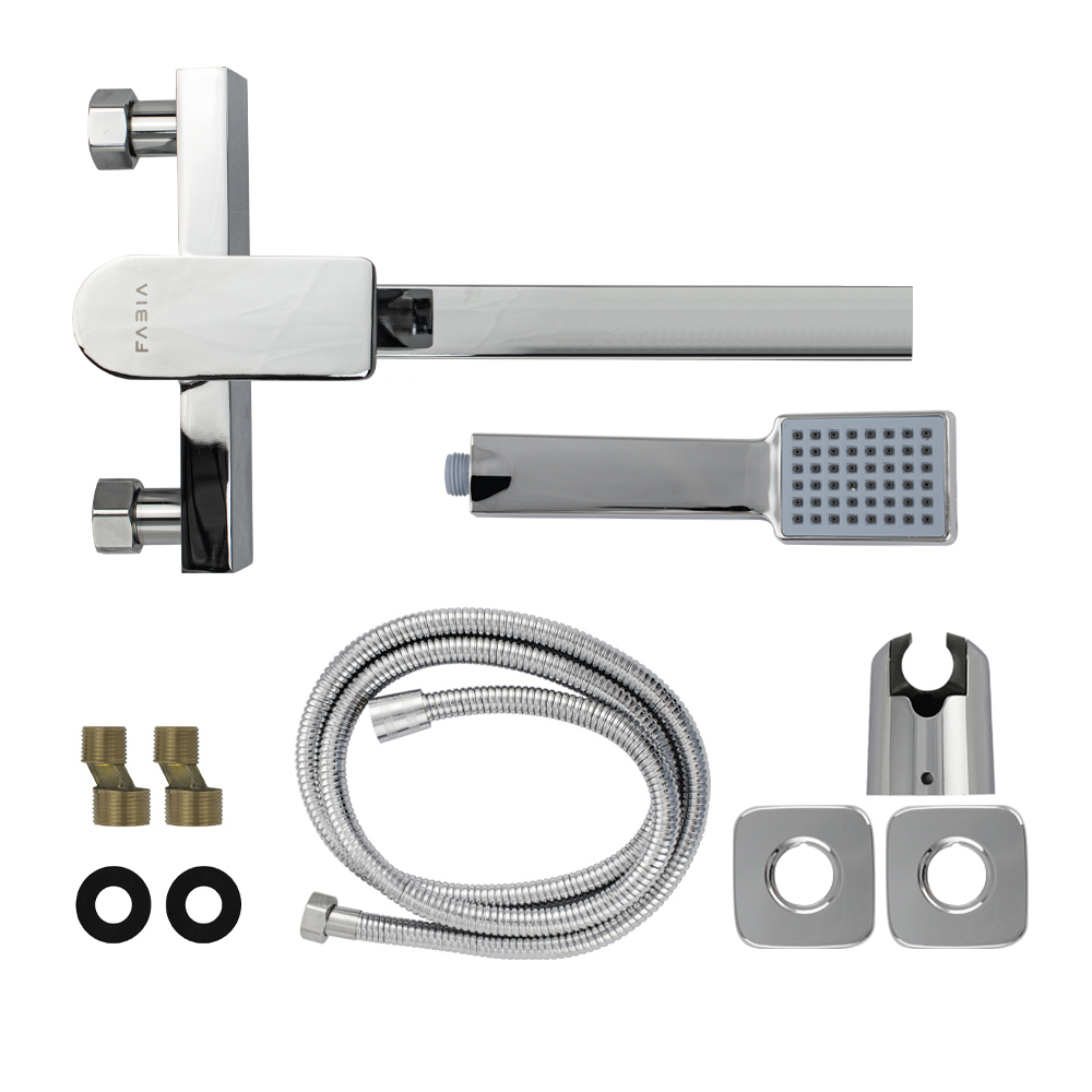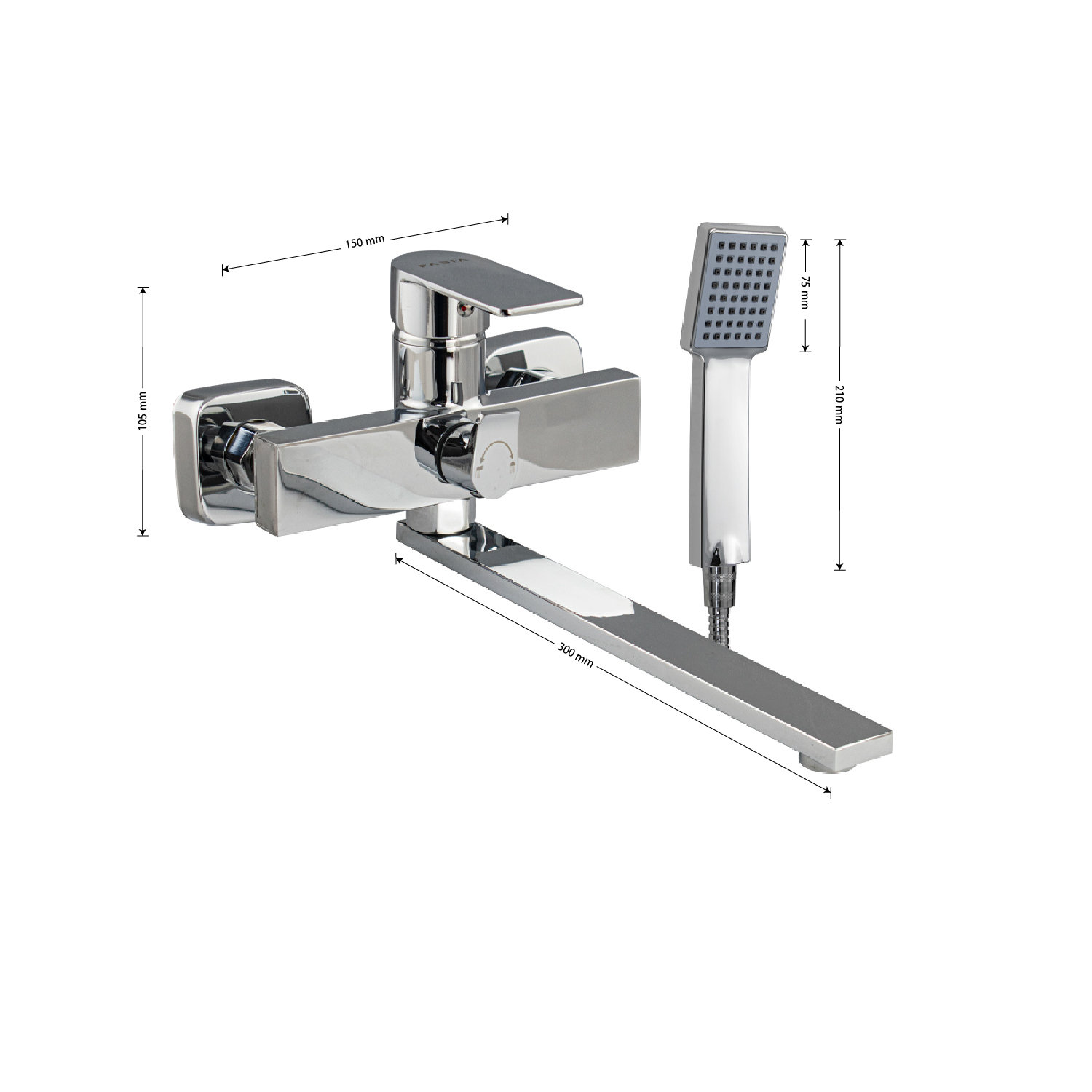 Смеситель хромированный в ванную / душевую комнату с длинным, плоским изливом, тяжёлый, массивный квадратный корпус, шаровый, с дивертором м/к на корпусе. Материал изготовления — ЦАМ (цинк-алюминий-медь) + нержавеющая сталь. Картридж d = мм, литая ручка, аэратор для экономии воды, чашки и эксцентрики из нержавеющей стали. Габаритные размеры: ширина 150 мм, высота корпуса 105 мм, длина излива 300 мм, душевая лейка 210 мм, шланг 150 см. Вес - 1,9 кг, объём - 0,00508 м3. В комплекте паспорт, корпус с изливом, дивертор, душевая лейка, шланг, кронштейн, комплект крепежа и прокладок.