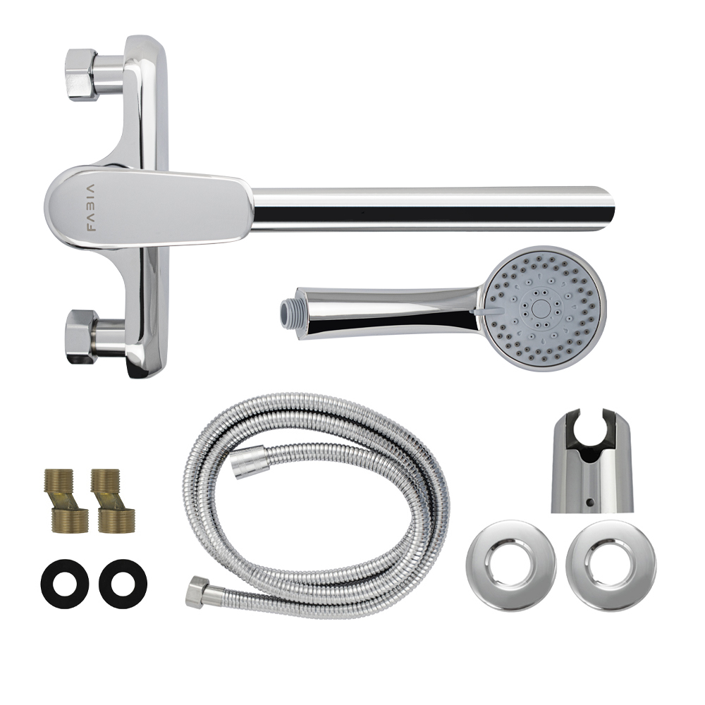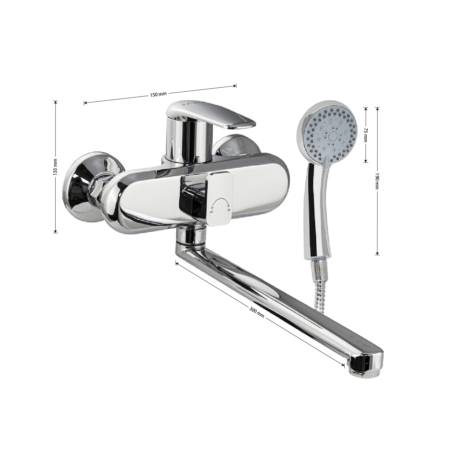 Смеситель хромированный в ванную / душевую комнату с длинным, плоским изливом, тяжёлый, массивный корпус, шаровый, с дивертором м/к на корпусе. Материал изготовления — ЦАМ (цинк-алюминий-медь) + нержавеющая сталь. Картридж d = мм, литая ручка, аэратор для экономии воды, чашки и эксцентрики из нержавеющей стали. Габаритные размеры: ширина 150 мм, высота корпуса 135 мм, длина излива 300 мм, душевая лейка 75 мм, шланг 150 см. Вес - 2 кг, объём - 0.0050 м3. В комплекте паспорт, корпус с изливом, дивертор, душевая лейка, шланг, кронштейн, комплект крепежа и прокладок.