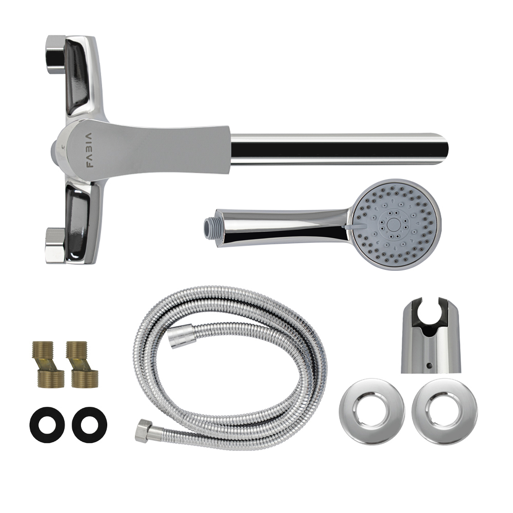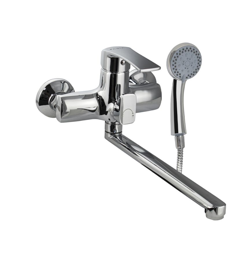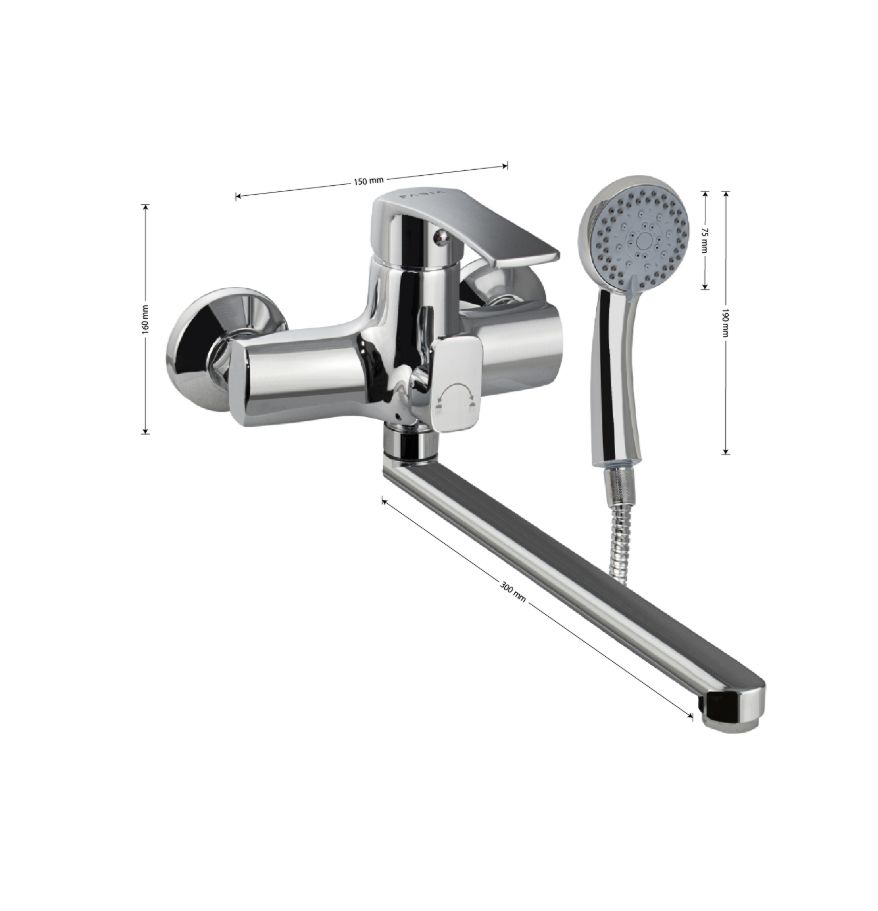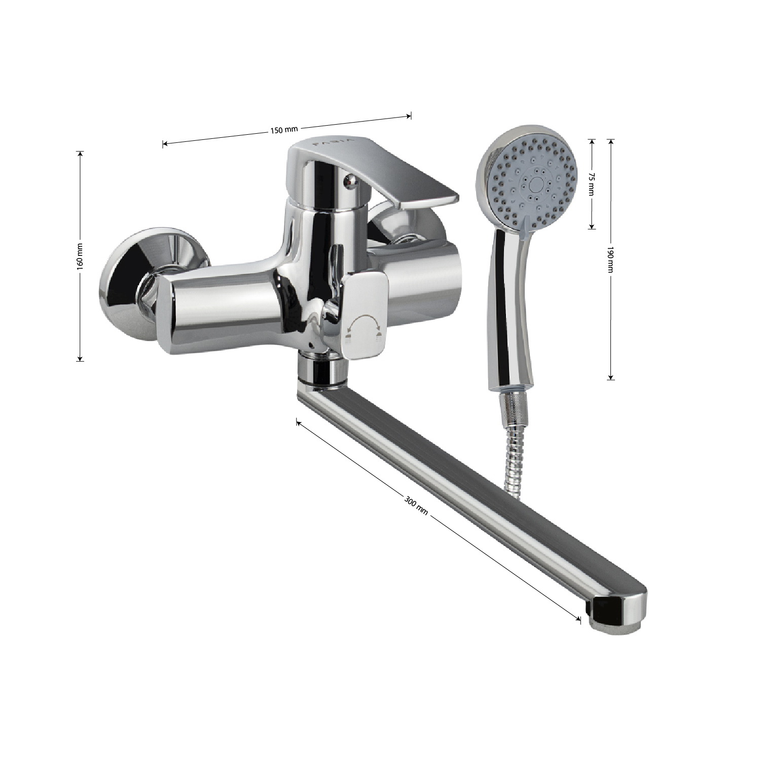 Смеситель хромированный в ванную / душевую комнату с длинным, плоским изливом, тяжёлый, массивный корпус, шаровый, с дивертором м/к на корпусе. Материал изготовления — ЦАМ (цинк-алюминий-медь) + нержавеющая сталь. Картридж d = мм, литая ручка, аэратор для экономии воды, чашки и эксцентрики из нержавеющей стали. Габаритные размеры: ширина 150 мм, высота корпуса 160 мм, длина излива 300 мм, душевая лейка 75 мм, шланг 150 см. Вес - 1.8 кг, объём - 0.0050 м3. В комплекте паспорт, корпус с изливом, дивертор, душевая лейка, шланг, кронштейн, комплект крепежа и прокладок.