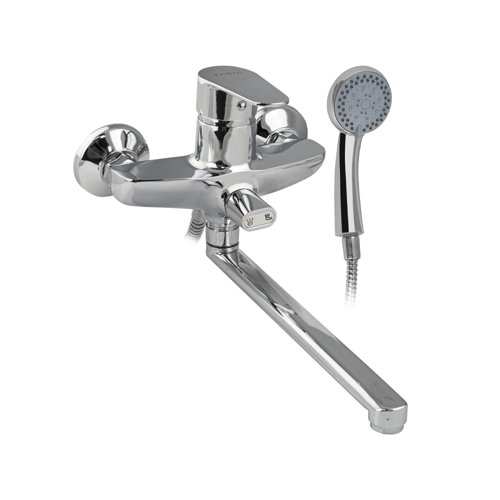 Смеситель хромированный в ванную / душевую комнату с длинным, плоским изливом, тяжёлый, массивный корпус, шаровый, с дивертором м/к на корпусе. Материал изготовления — ЦАМ (цинк-алюминий-медь). Картридж d = мм, ручка с прорезью, аэратор для экономии воды, чашки и эксцентрики из нержавеющей стали. Габаритные размеры: ширина мм, высота корпуса мм, длина излива мм, душевая лейка d = мм, шланг см. Вес - кг, объём - м3. В комплекте паспорт, корпус с изливом, дивертор, душевая лейка, шланг, кронштейн, комплект крепежа и прокладок.