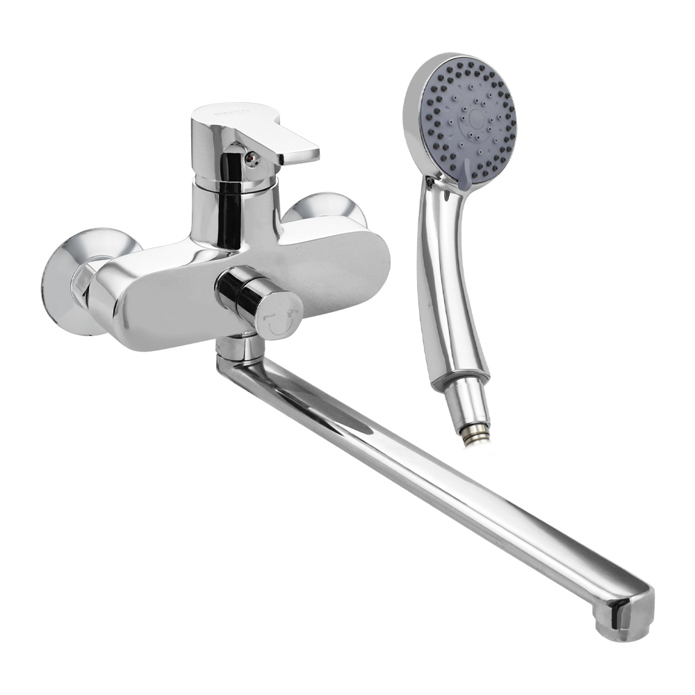 Смеситель хромированный в ванную / душевую комнату с длинным, плоским изливом, тяжёлый, массивный корпус, шаровый с дивертором м/к на корпусе. Материал изготовления — ЦАМ (цинк-алюминий-медь). Картридж d = 40 мм, литая ручка, аэратор для экономии воды, чашки и эксцентрики из нержавеющей стали. Габаритные размеры: ширина 150 мм, высота корпуса 165 мм, длина излива 340 мм, трёхрежимная душевая лейка d = 100 мм, шланг 150 см. Вес - 2,000 кг, объём - 0,00702 м3. В комплекте паспорт, корпус с изливом, дивертор, душевая лейка, шланг, кронштейн, комплект крепежа и прокладок.