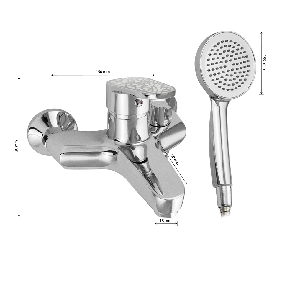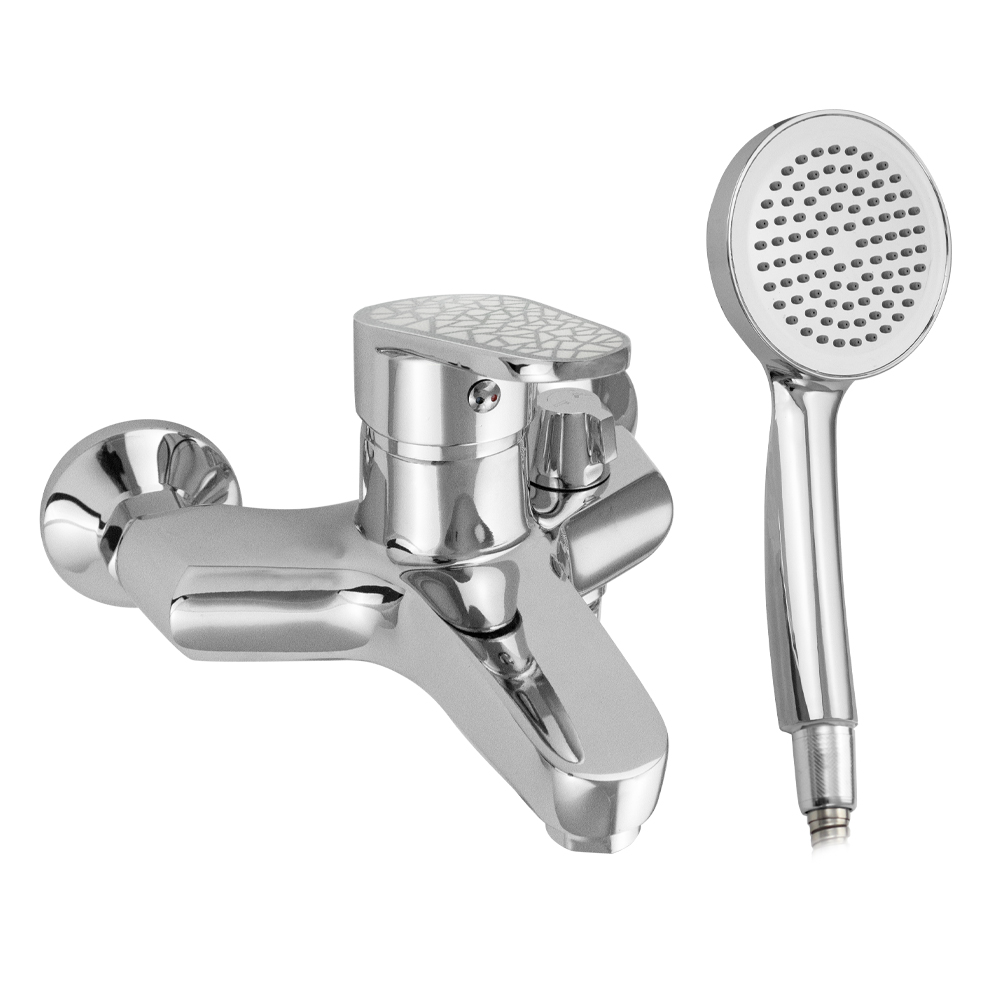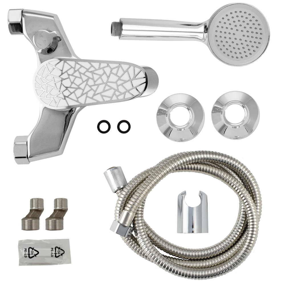Смеситель в ванную / душевую комнату хромированный, с коротким изливом, литой корпус, шаровый, с поворотным дивертором м/к на корпусе. Материал изготовления — ЦАМ (цинк-алюминий-медь). Картридж d = 40 мм, ручка с белой мозаикой, аэратор для экономии воды, чашки и эксцентрики из нержавеющей стали. Габаритные размеры: ширина 150 мм, высота корпуса 120 мм, длина излива 90 мм, круглая душевая лейка d = 100 мм, шланг 150 см. Вес - 2,000 кг, объём - 0,00430 м3. В комплекте паспорт, корпус с изливом, дивертор, душевая лейка, шланг, кронштейн, комплект крепежа и прокладок.