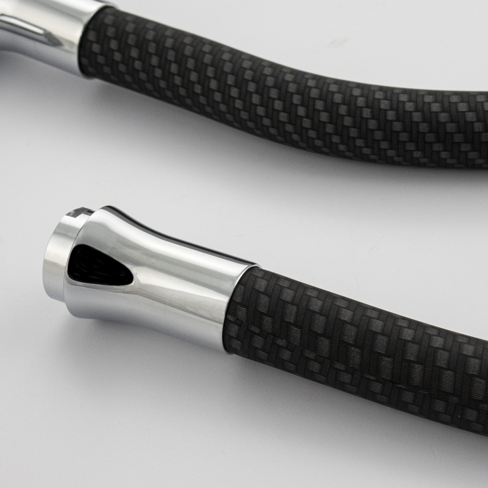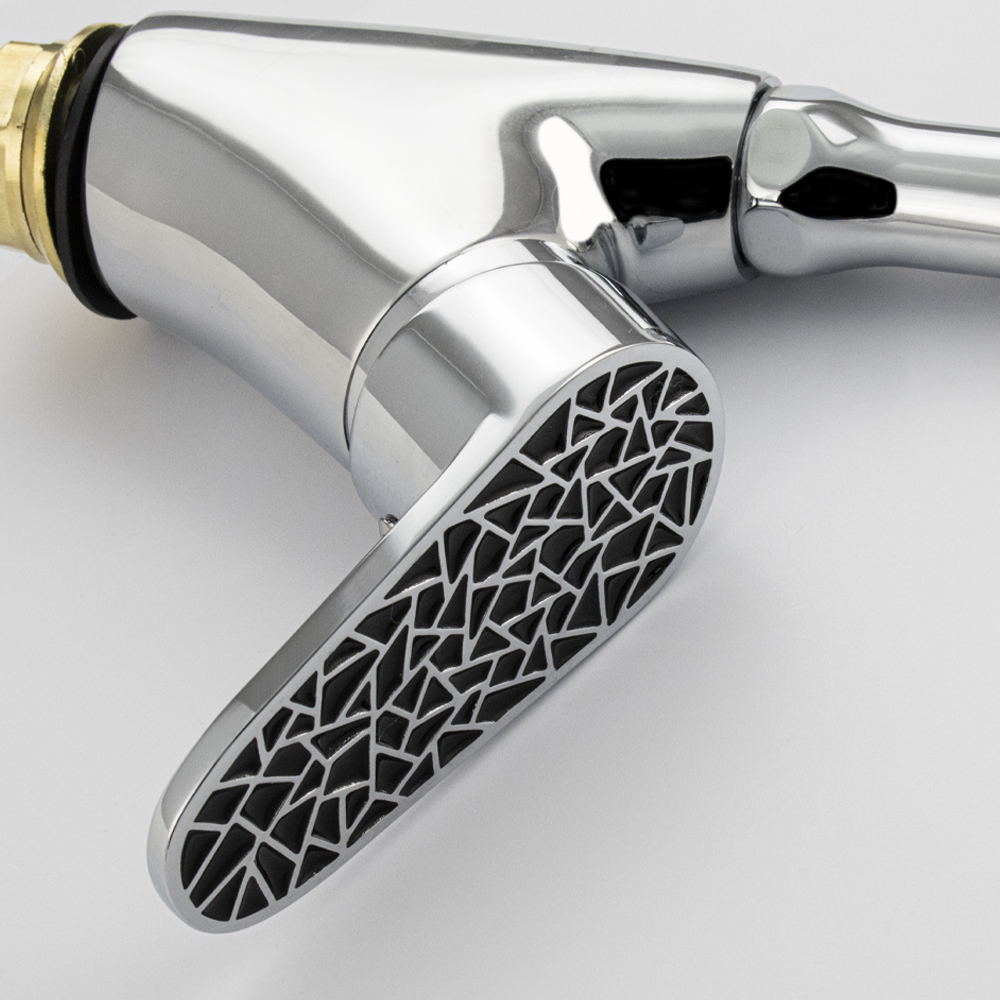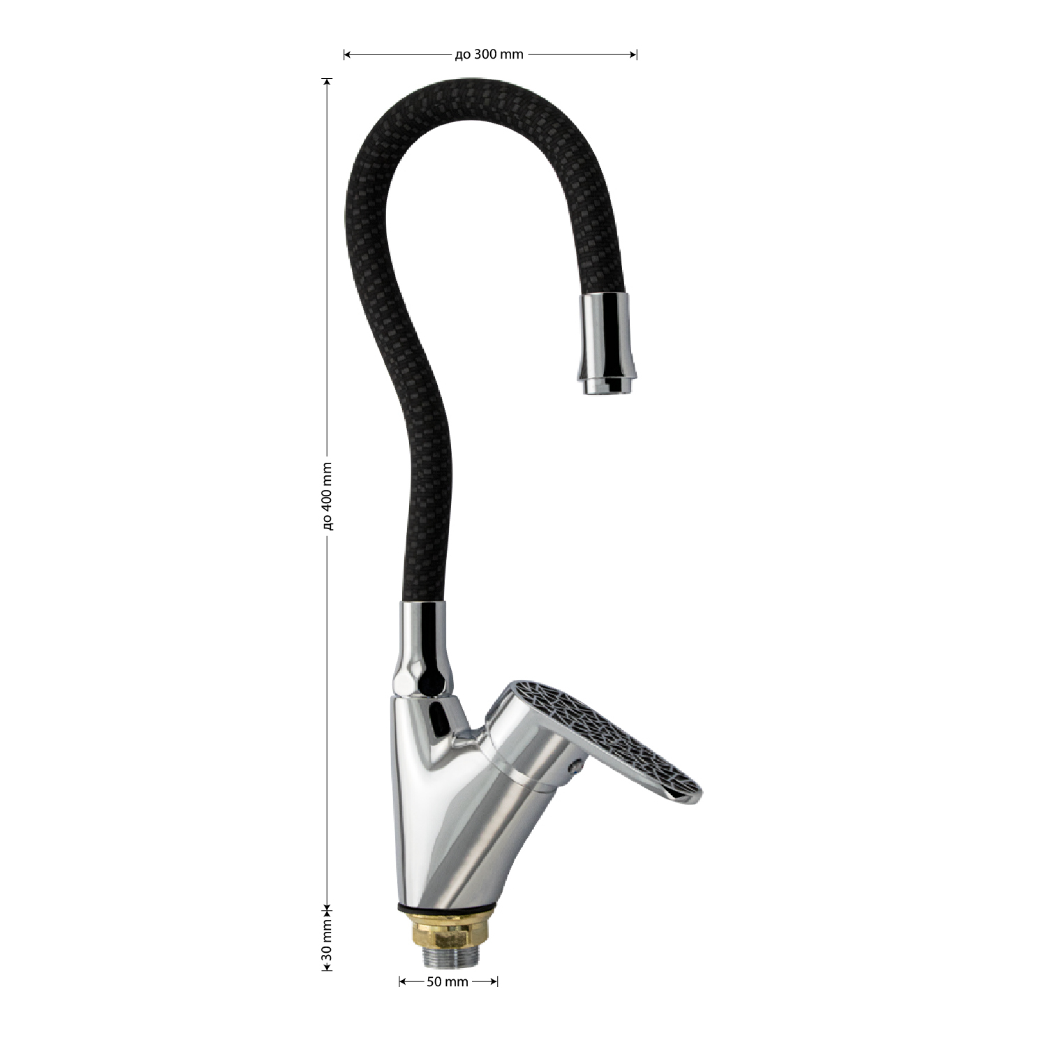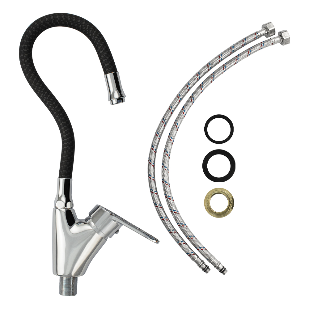 Смеситель для кухонной мойки и раковин, корпус хромированный, боковой, с высоким гибким изливом чёрного цвета, шаровый. Материал изготовления — ЦАМ (цинк-алюминий-медь) + нержавеющая сталь. Крепление резьба - гайка, картридж d = 40 мм, черная ручка с узором мозаики. Аэратор для экономии воды. Габаритные размеры: высота 400 мм, длина от 300 мм, диаметр посадочного седла 50 мм, длина резьбы 30 мм, длина подводки 500 мм. Вес - 1,600 кг, объём - 0,00550 м3. В комплекте паспорт, корпус с изливом, подводка 1/2, крепеж, набор прокладок.