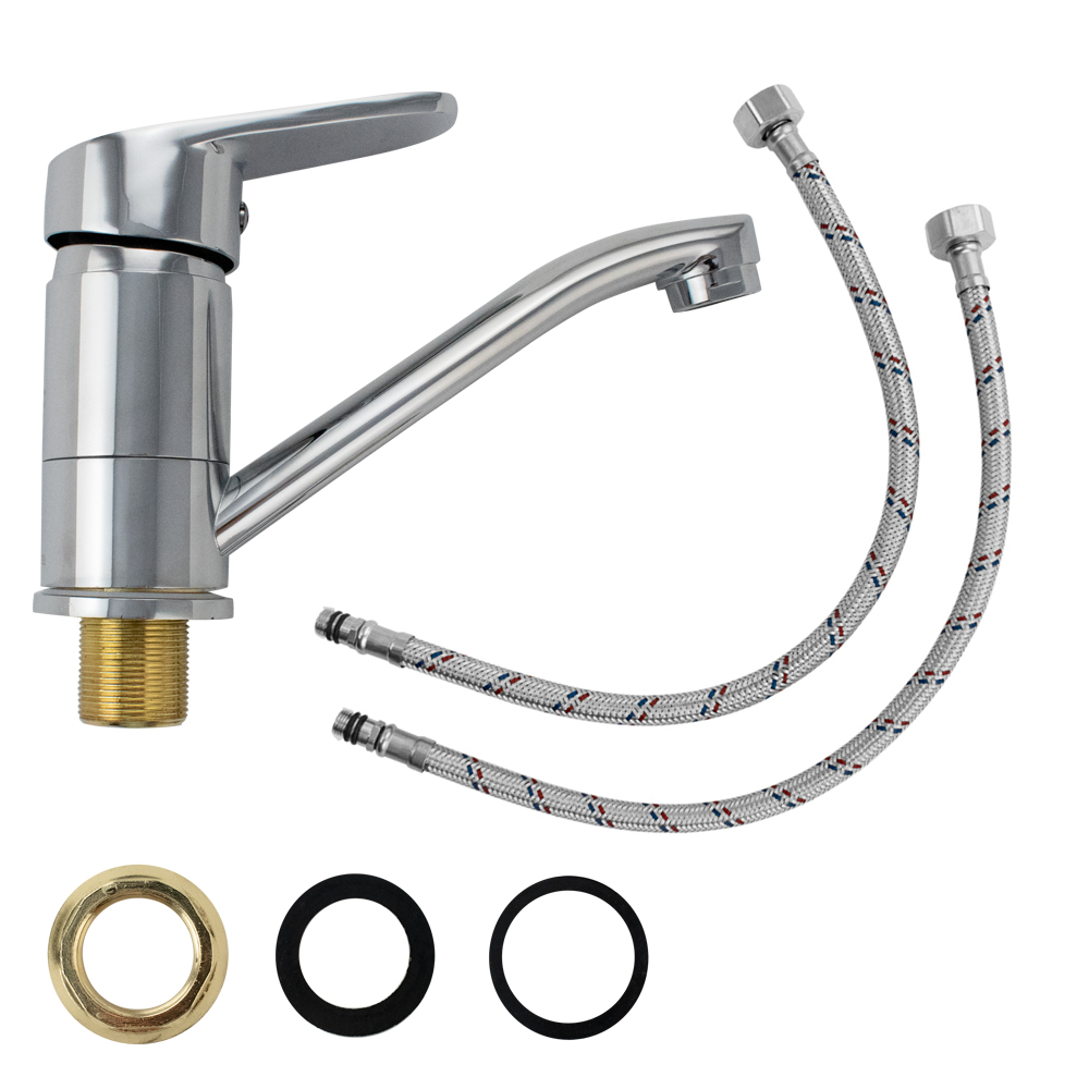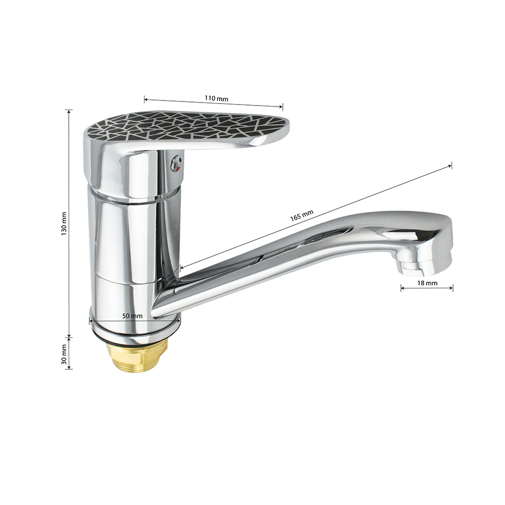 Смеситель для кухонной мойки и раковины, хромированный, с коротким, поворотным изливом, шаровый, ручка с чёрной мозаикой. Материал изготовления — ЦАМ (цинк-алюминий-медь). Крепление резьба - гайка, картридж d = 40 мм. Аэратор для экономии воды. Габаритные размеры: высота 130 мм, длина 185 мм, длина излива150 мм, диаметр посадочного седла 50 мм, длина резьбы 30 мм, длина подводки 400 мм. Вес - 1,100 кг, объём - 0,00350 м3. В комплекте паспорт, корпус, подводка 1/2, крепеж, набор прокладок.