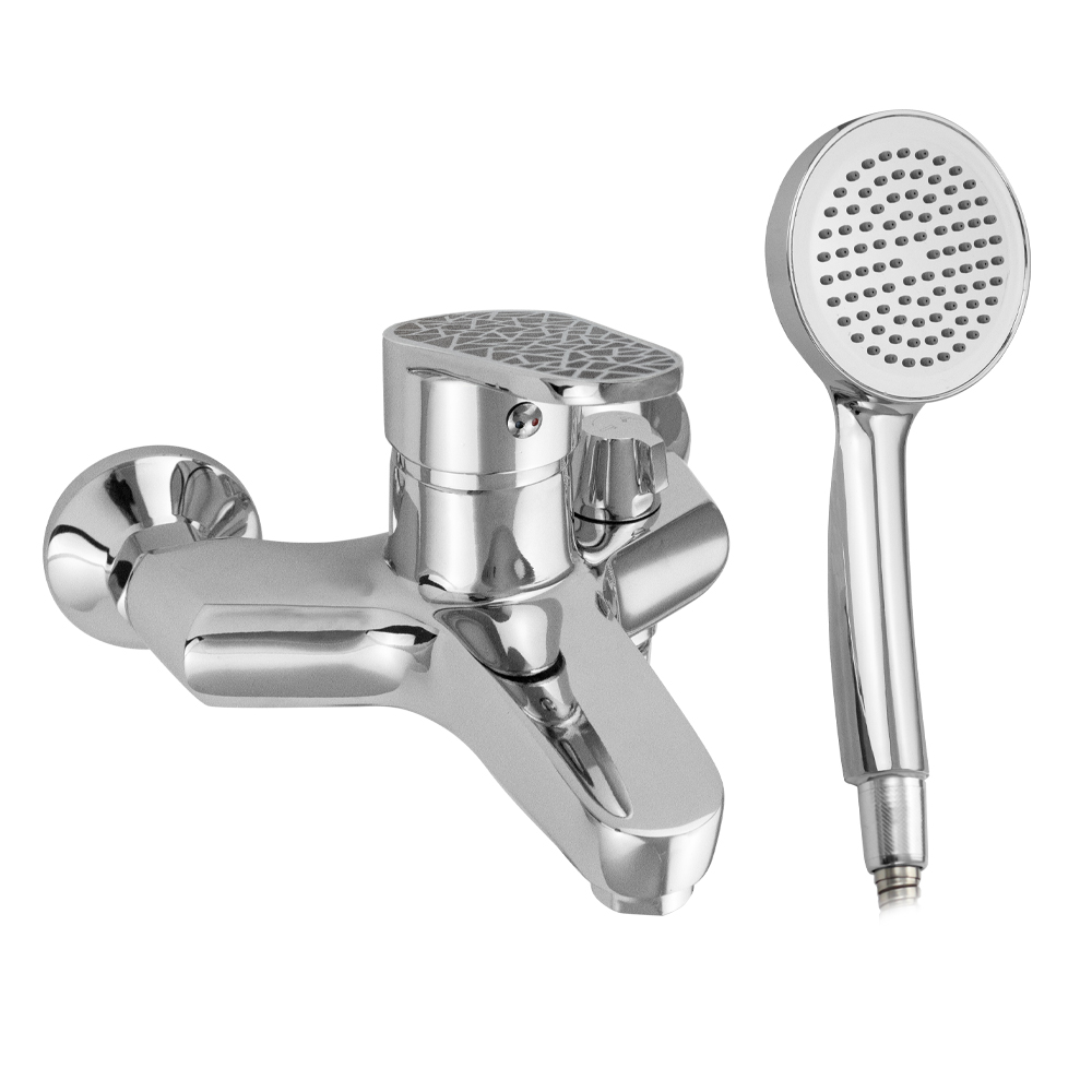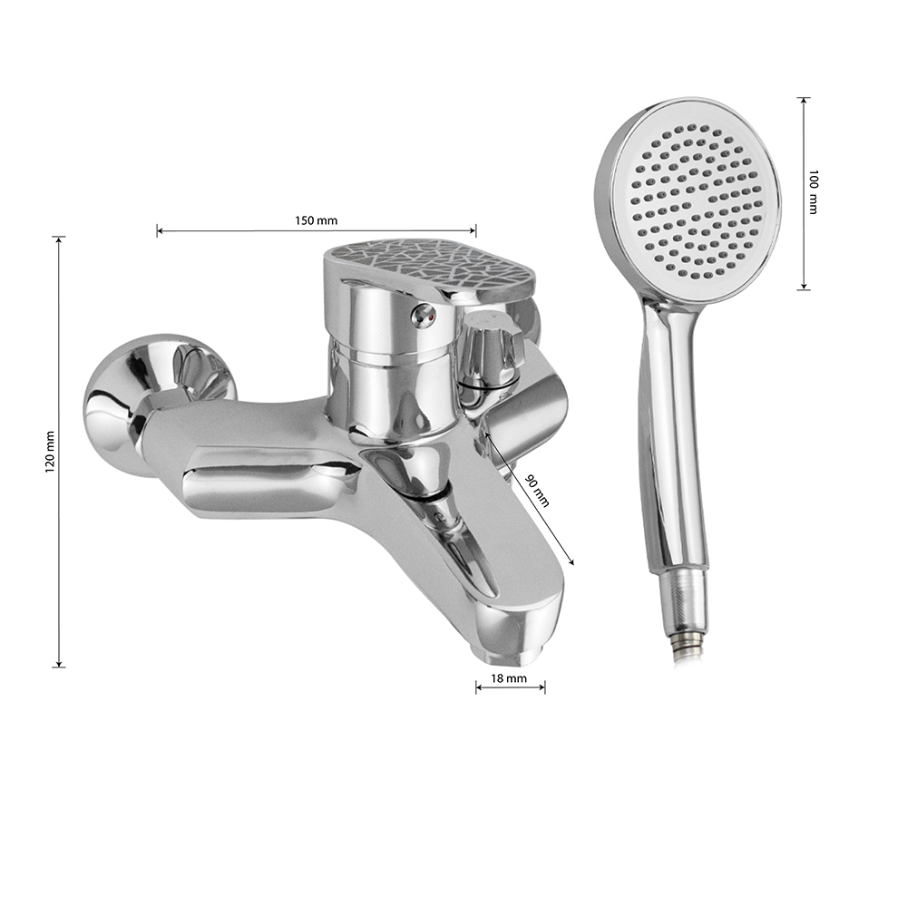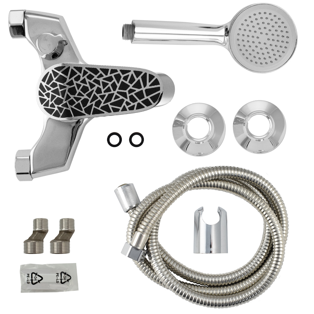 Смеситель в ванную / душевую комнату, хромированный с коротким изливом, литой корпус, шаровый, с поворотным дивертором м/к на корпусе. Материал изготовления — ЦАМ (цинк-алюминий-медь). Картридж d = 40 мм, ручка с чёрной мозаикой, аэратор для экономии воды, чашки и эксцентрики из нержавеющей стали. Габаритные размеры: ширина 150 мм, высота корпуса 120 мм, длина излива 90 мм, круглая душевая лейка d = 100 мм, шланг 150 см. Вес - 2,000 кг, объём - 0,00430 м3. В комплекте паспорт, корпус с изливом, дивертор, душевая лейка, шланг, кронштейн, комплект крепежа и прокладок.