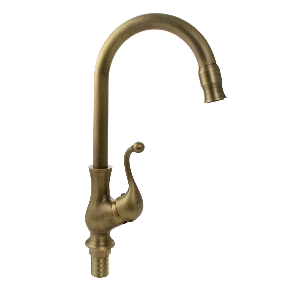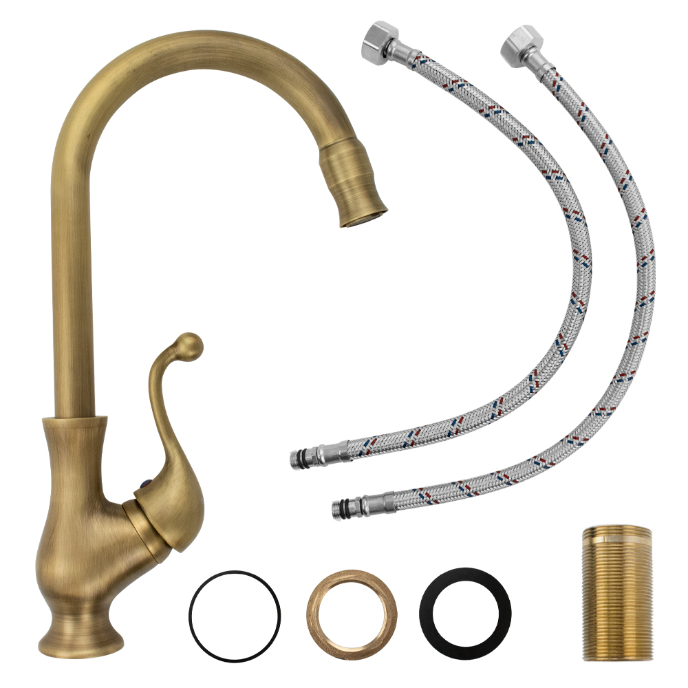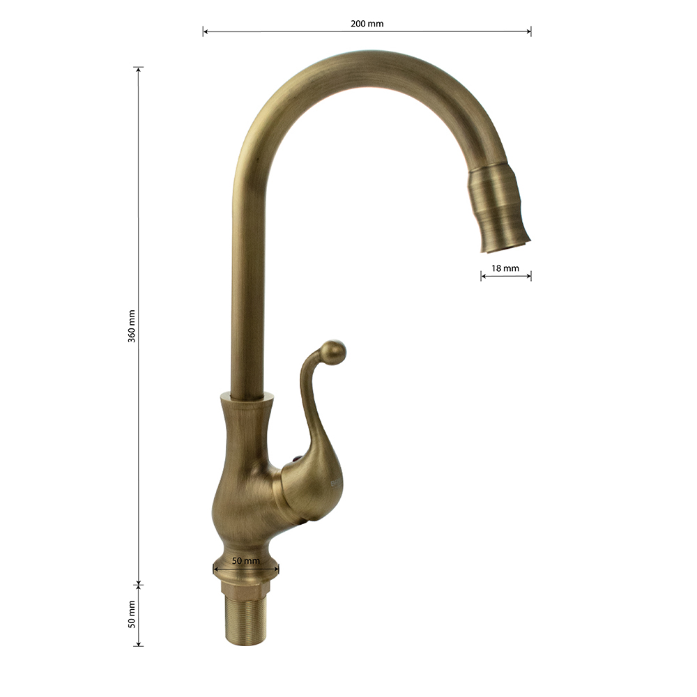 Смеситель для кухонной мойки и раковин, боковой, шаровый, корпус под состаренную бронзу, с высоким С-образным изливом, Материал изготовления — ЦАМ (цинк-алюминий-медь) + нержавеющая сталь , Крепление резьба - гайка, картридж d = 40 мм, литая ручка, Аэратор для экономии воды. Габаритные размеры: высота 360 мм, длина 200 мм, диаметр посадочного седла 50 мм, длина резьбы 50 мм, длина подводки 400 мм, вес - 1,350 кг, объём - 0,00563 м3. В комплекте паспорт, корпус с изливом, подводка 1/2, крепеж, набор прокладок