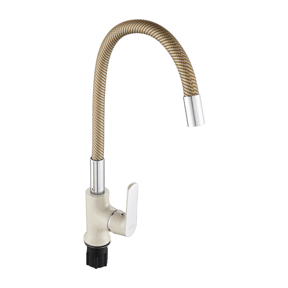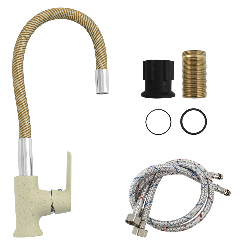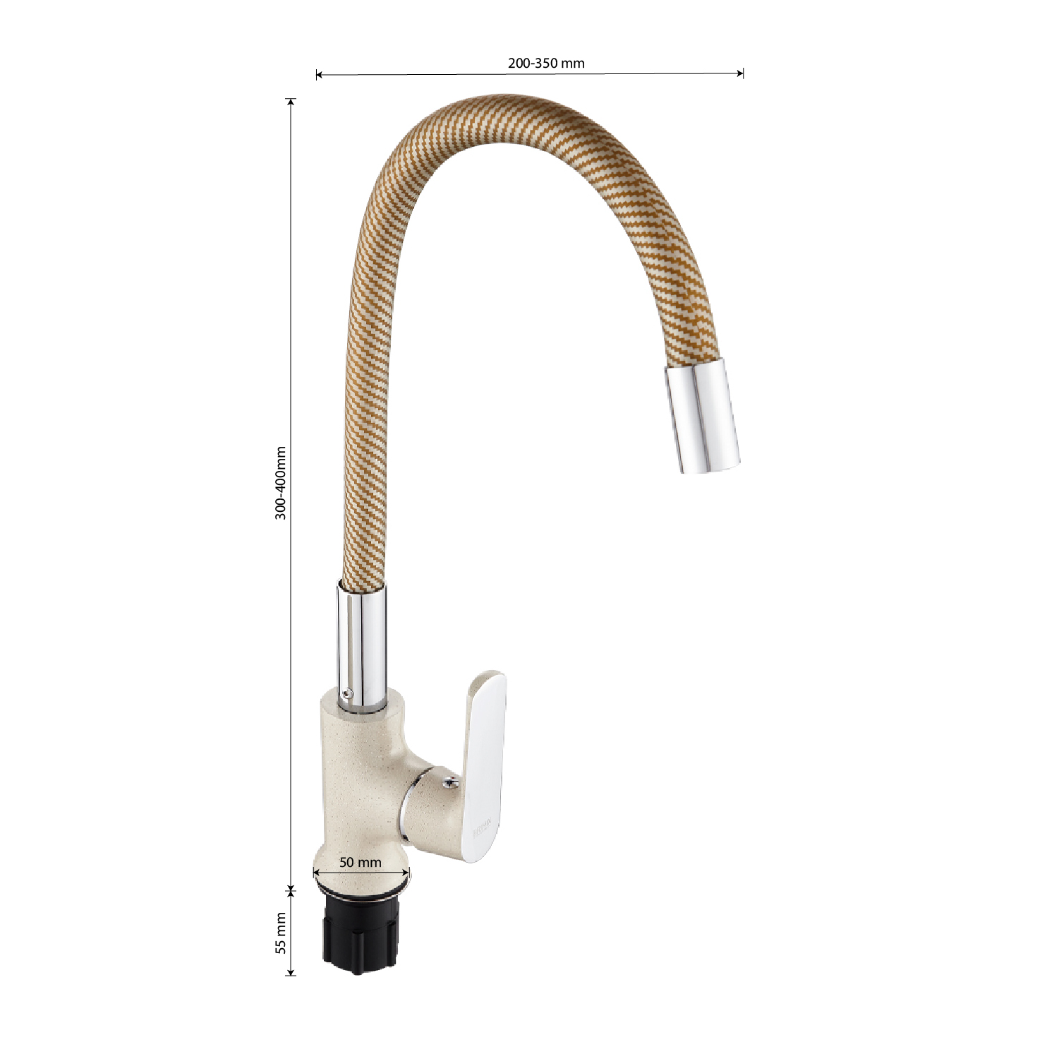 Смеситель для кухонной мойки и раковин, литой корпус бежевого цвета, с высоким гибким изливом бежевого цвета, полосатый, с аэратором для экономии воды, шаровый. Материал изготовления — ЦАМ (цинк-алюминий-медь) + нержавеющая сталь. Крепление резьба - гайка, картридж d = 35 мм, ручка литая. Такая модель может использоваться на домашней кухне, на даче, в медицинских учреждениях и общественных местах. Габаритные размеры: высота 300 - 400 мм, длина 200 - 350 мм, диаметр посадочного седла 50 мм, длина резьбы 55 мм, длина подводки 400 мм. Вес - 1,500 кг, объём - 0,00500 м3. В комплекте паспорт, корпус с изливом, подводка 1/2, крепеж, набор прокладок.