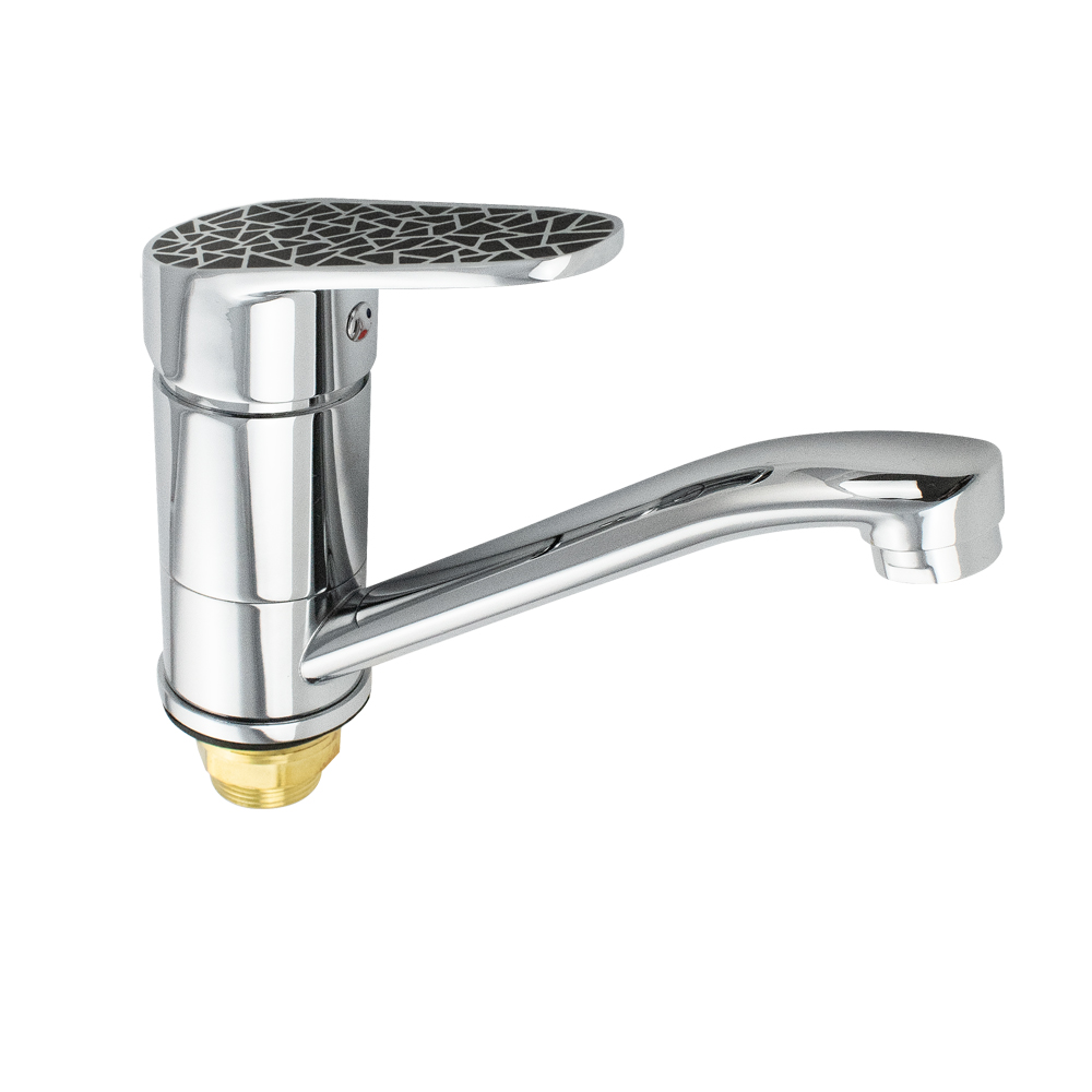 Смеситель для кухонной мойки и раковины, хромированный, с коротким, поворотным изливом, шаровый, ручка с чёрной мозаикой. Материал изготовления — ЦАМ (цинк-алюминий-медь). Крепление резьба - гайка, картридж d = 40 мм. Аэратор для экономии воды. Габаритные размеры: высота 130 мм, длина 185 мм, длина излива150 мм, диаметр посадочного седла 50 мм, длина резьбы 30 мм, длина подводки 400 мм. Вес - 1,100 кг, объём - 0,00350 м3. В комплекте паспорт, корпус, подводка 1/2, крепеж, набор прокладок.