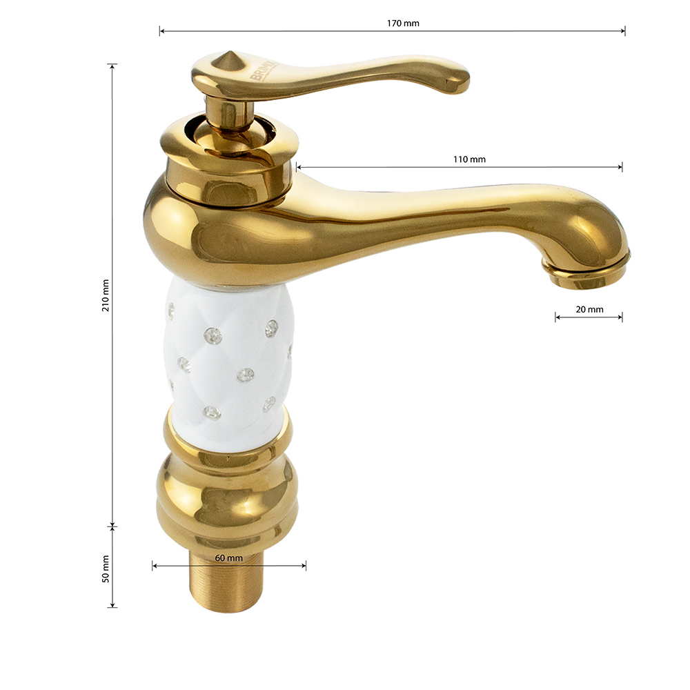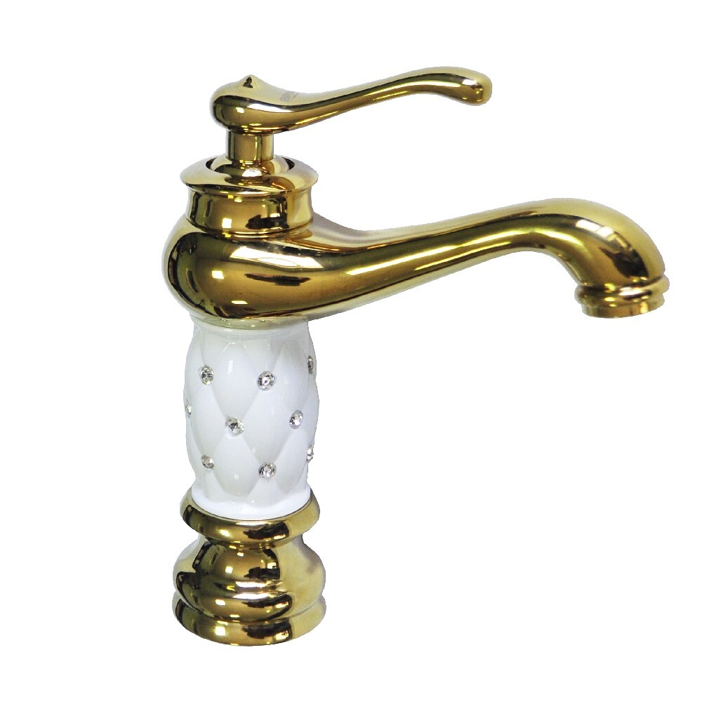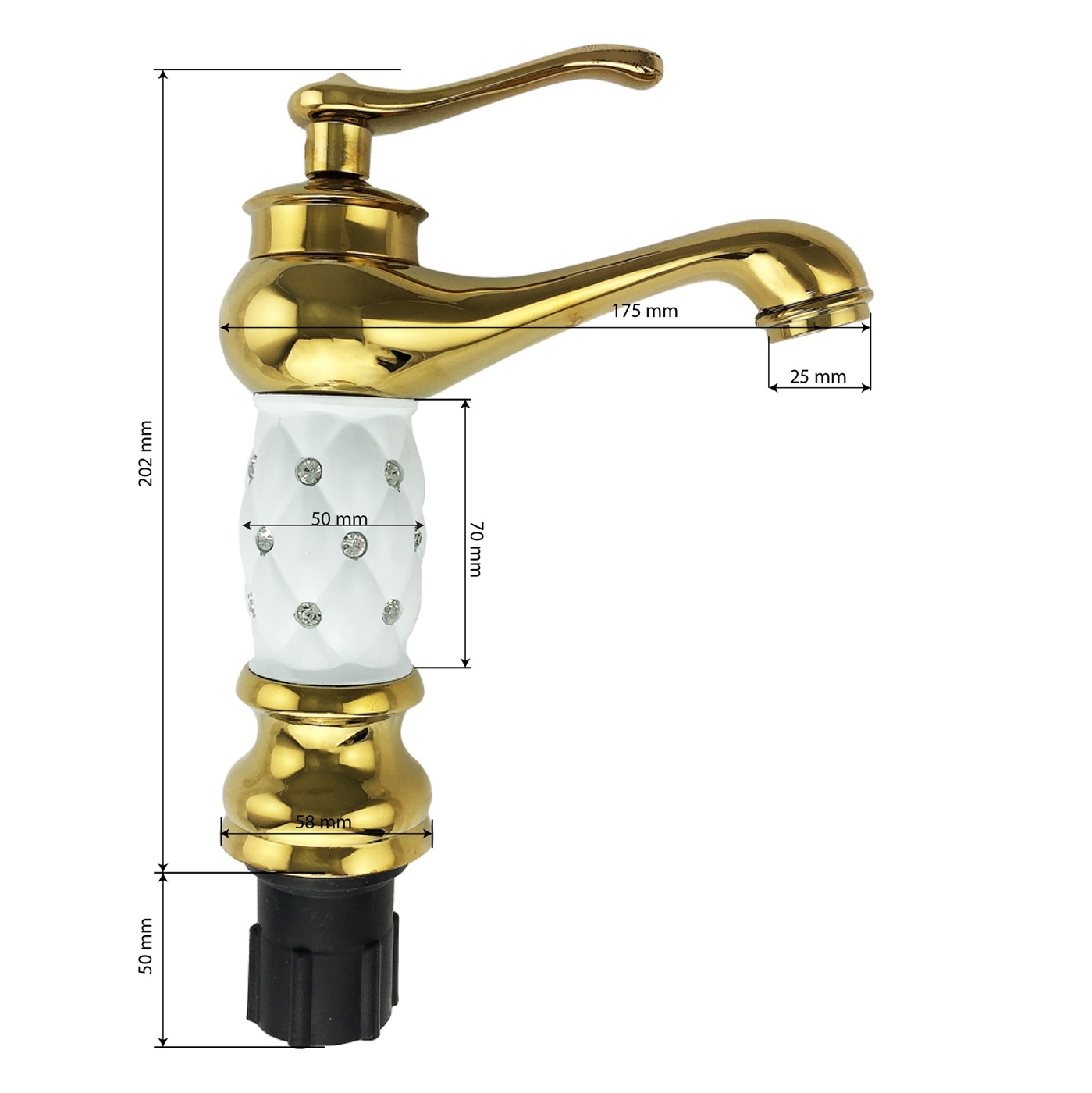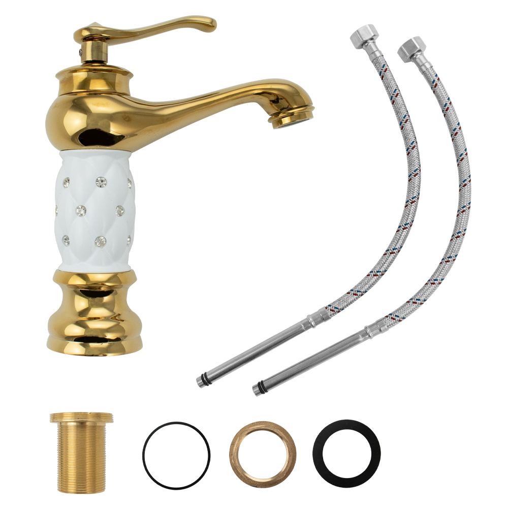 Смеситель для раковины, светлое золото с белой керамичекой вставкой, со стразами на корпусе, с коротким литым изливом, литой корпус, литая ручка, шаровый. Материал изготовления — ЦАМ (цинк-алюминий-медь) + нержавеющая сталь. Крепление резьба - гайка, картридж d = 40 мм. Аэратор для экономии воды. Габаритные размеры: высота 210 мм, длина 170 мм, длина излива 110 мм, диаметр посадочного седла 60 мм, длина резьбы 50 мм, длина подводки 400 мм. Вес - 1,150 кг, объём - 0,00346 м3. В комплекте паспорт, корпус, подводка 1/2, крепеж, набор прокладок.