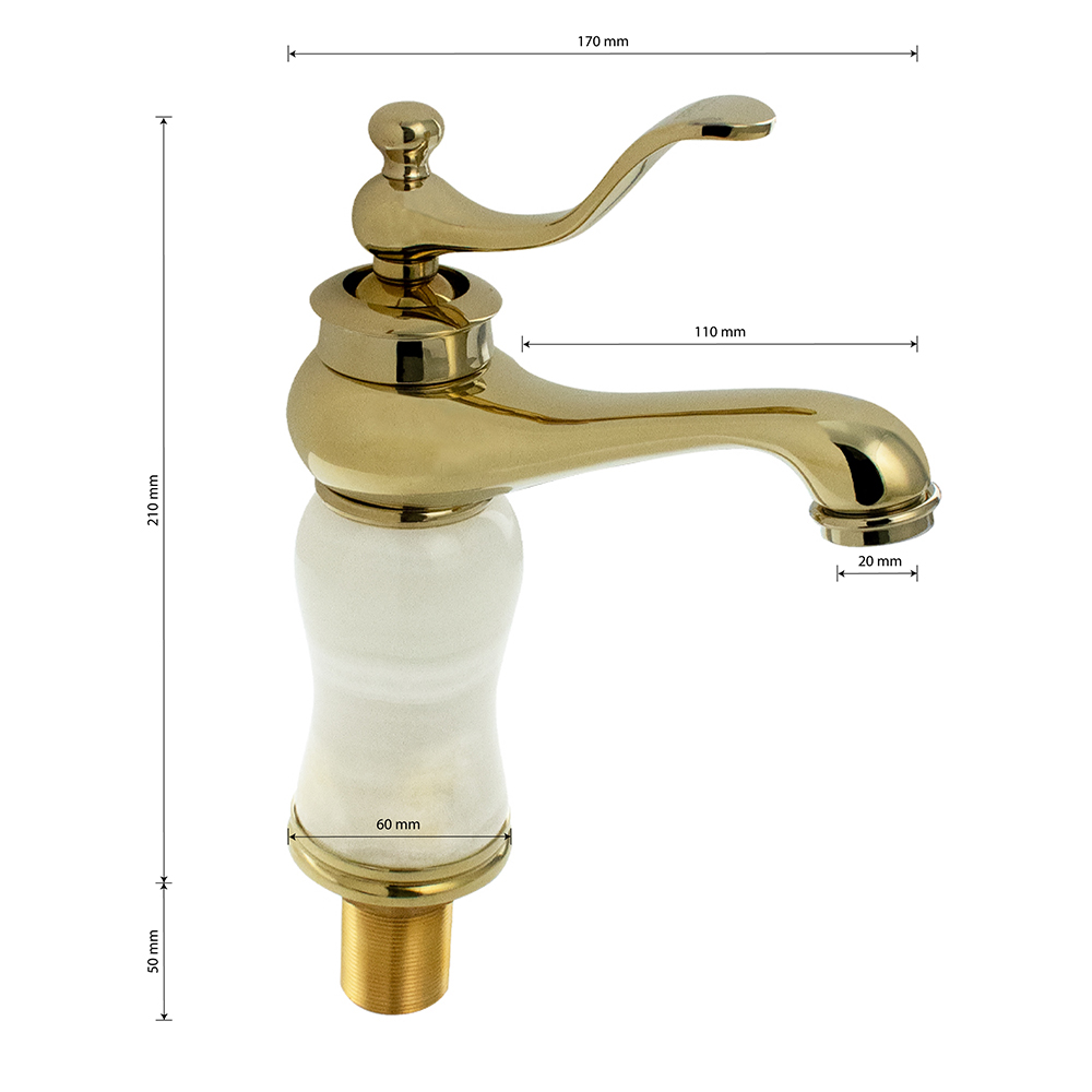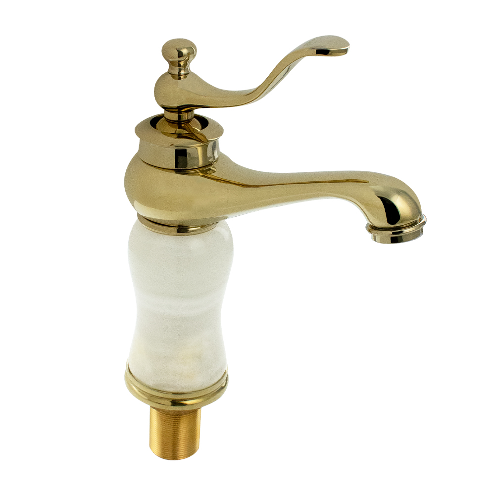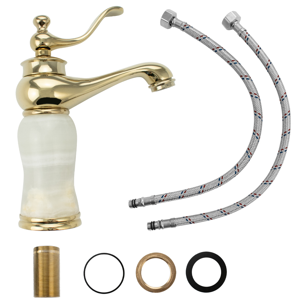 Смеситель для раковины, корпус светлый мрамор с элементами золота, с коротким литым изливом, литой корпус, литая ручка, шаровый, Крепление резьба- гайка, картридж d= 40 мм. Аэратор для экономии воды. Габаритные размеры: высота 210 мм, длина 170 мм, длина излива 110 мм, диаметр посадочного седла 60 мм, длина резьбы 50 мм, длина подводки 300 мм, вес - 1,650 кг, объём - 0,00754 м3. В комплекте паспорт, корпус, подводка 1/2, крепеж, набор прокладок.