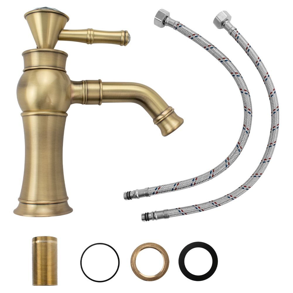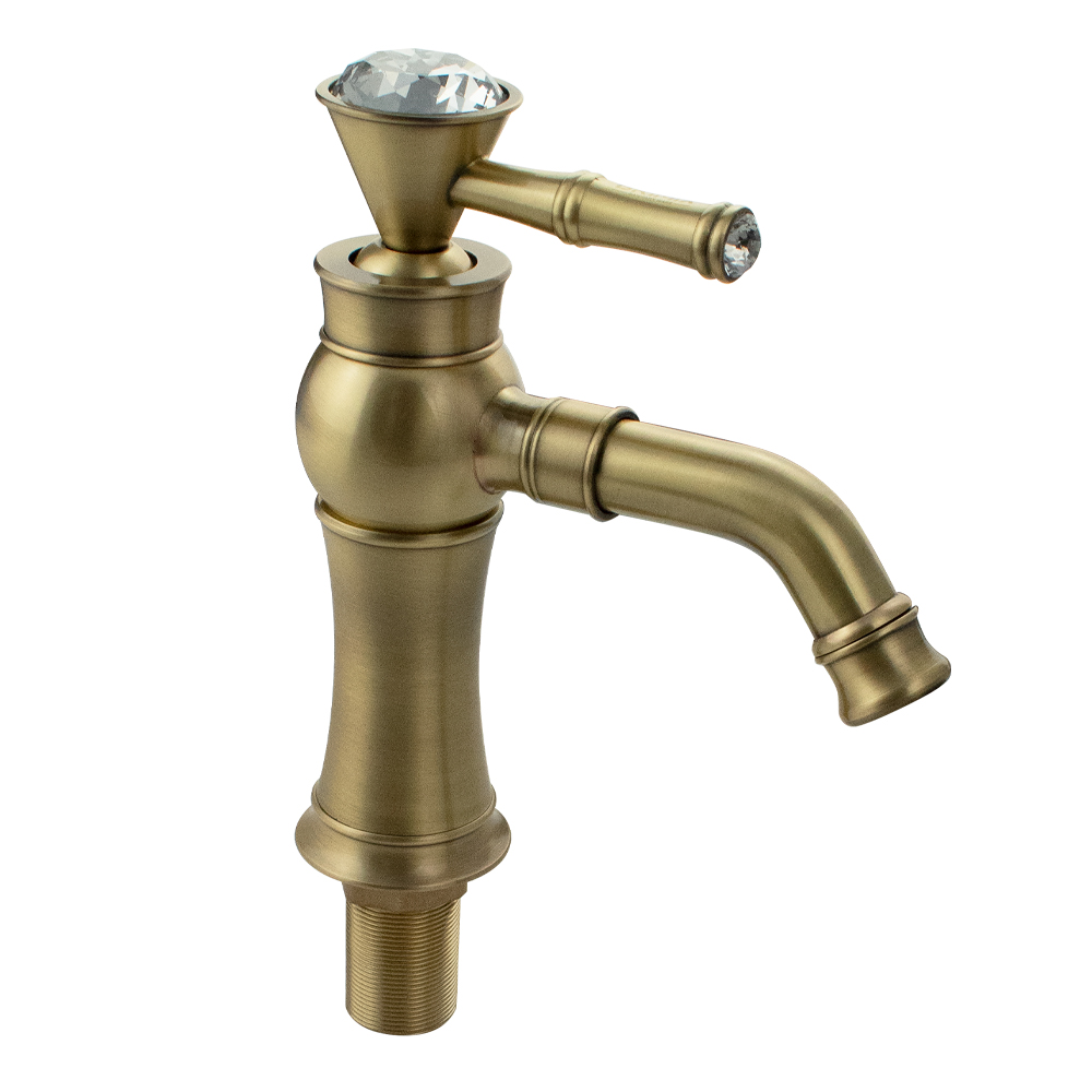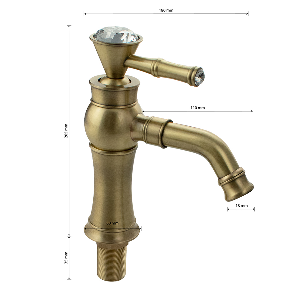 Смеситель для раковины, корпус под состаренную бронзу, с коротким поворотным вокруг оси изливом, литой корпус, ручка с большим кристаллом, шаровый. Материал изготовления — латунь. Крепление резьба - гайка, картридж d = 40 мм. Аэратор для экономии воды. Габаритные размеры: высота 205 мм, длина 180 мм, длина излива 110 мм, диаметр посадочного седла 60 мм, длина резьбы 55 мм, длина подводки 300 мм. Вес - 1,250 кг, объём - 0,00350 м3. В комплекте паспорт, корпус, подводка 1/2, крепеж, набор прокладок.