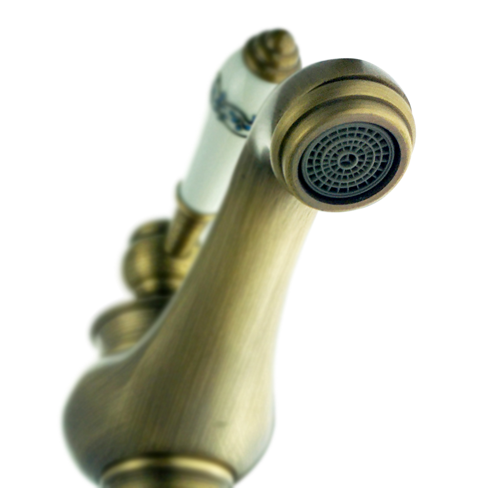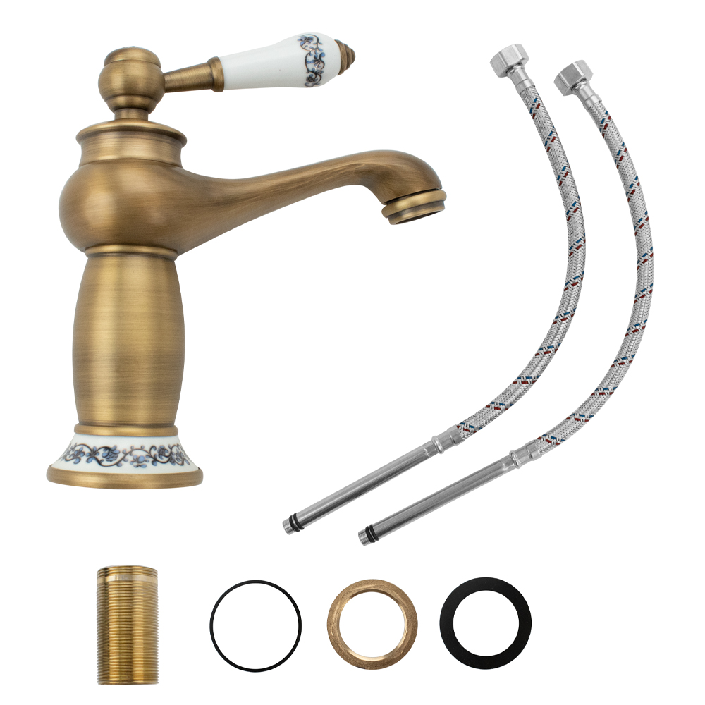 Смеситель для раковины, корпус под состаренную бронзу с вставками белой керамики, с коротким литым изливом, литой корпус, ручка с большим кристаллом, шаровый. Материал изготовления — ЦАМ (цинк-алюминий-медь) + нержавеющая сталь. Крепление резьба - гайка, картридж d = 40 мм. Аэратор для экономии воды. Габаритные размеры: высота 190 мм, длина 170 мм, длина излива 110 мм, диаметр посадочного седла 65 мм, длина резьбы 50 мм, длина подводки 400 мм. Вес - 1,100 кг, объём - 0,00335 м3. В комплекте паспорт, корпус, подводка 1/2, крепеж, набор прокладок.