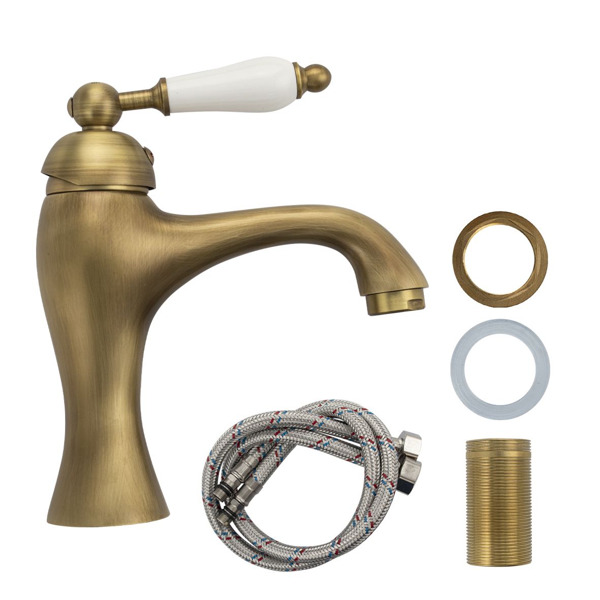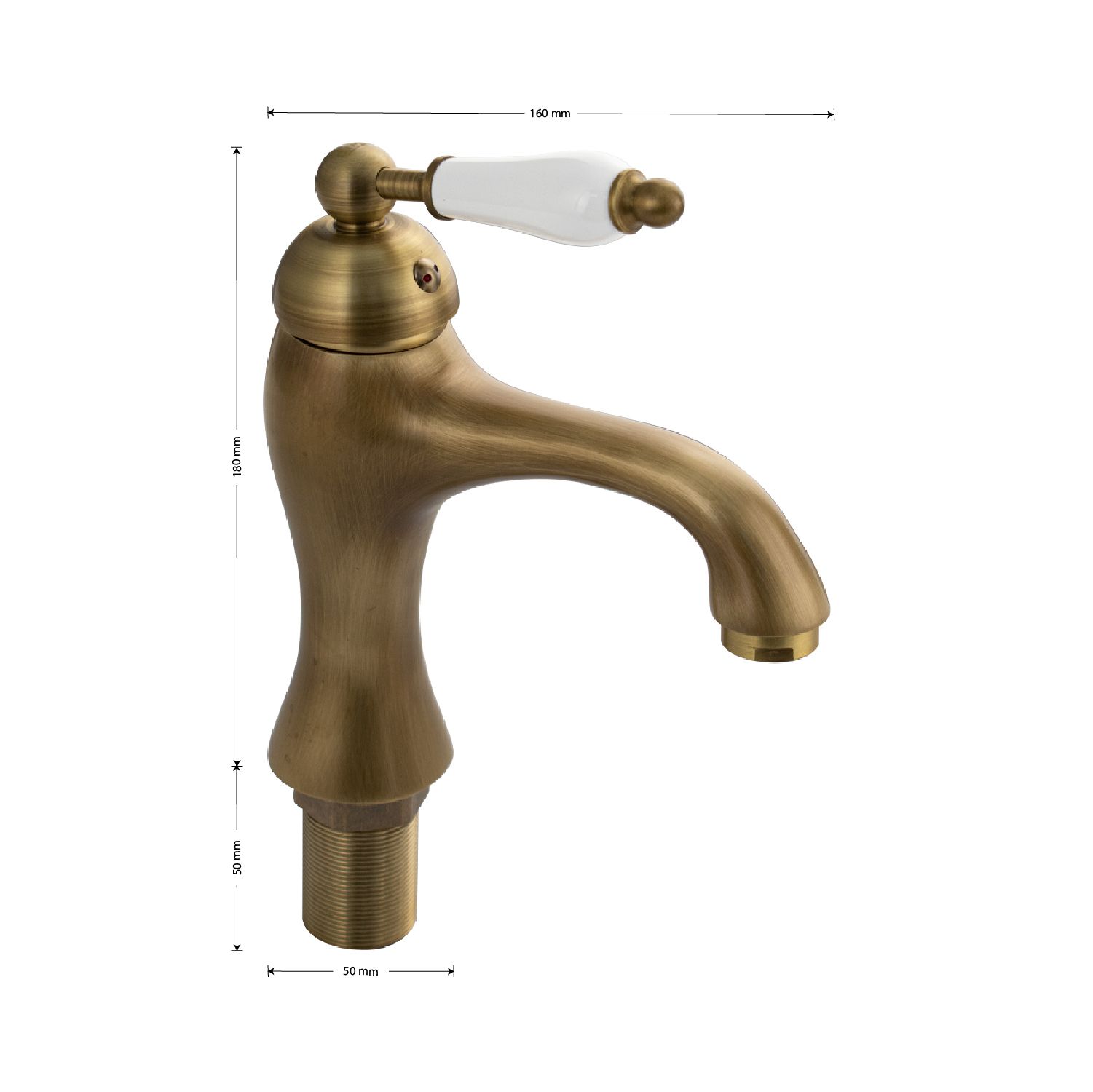 Смеситель для раковины, под бронзу, шаровый из латуни. Габаритные размеры: высота 180 мм, ширина 160 мм, диаметр посадочного седла 50 мм, длина резьбы 50 мм, длина подводки 500 мм. Вес - 1,1 кг, объем - 0,004 м3.