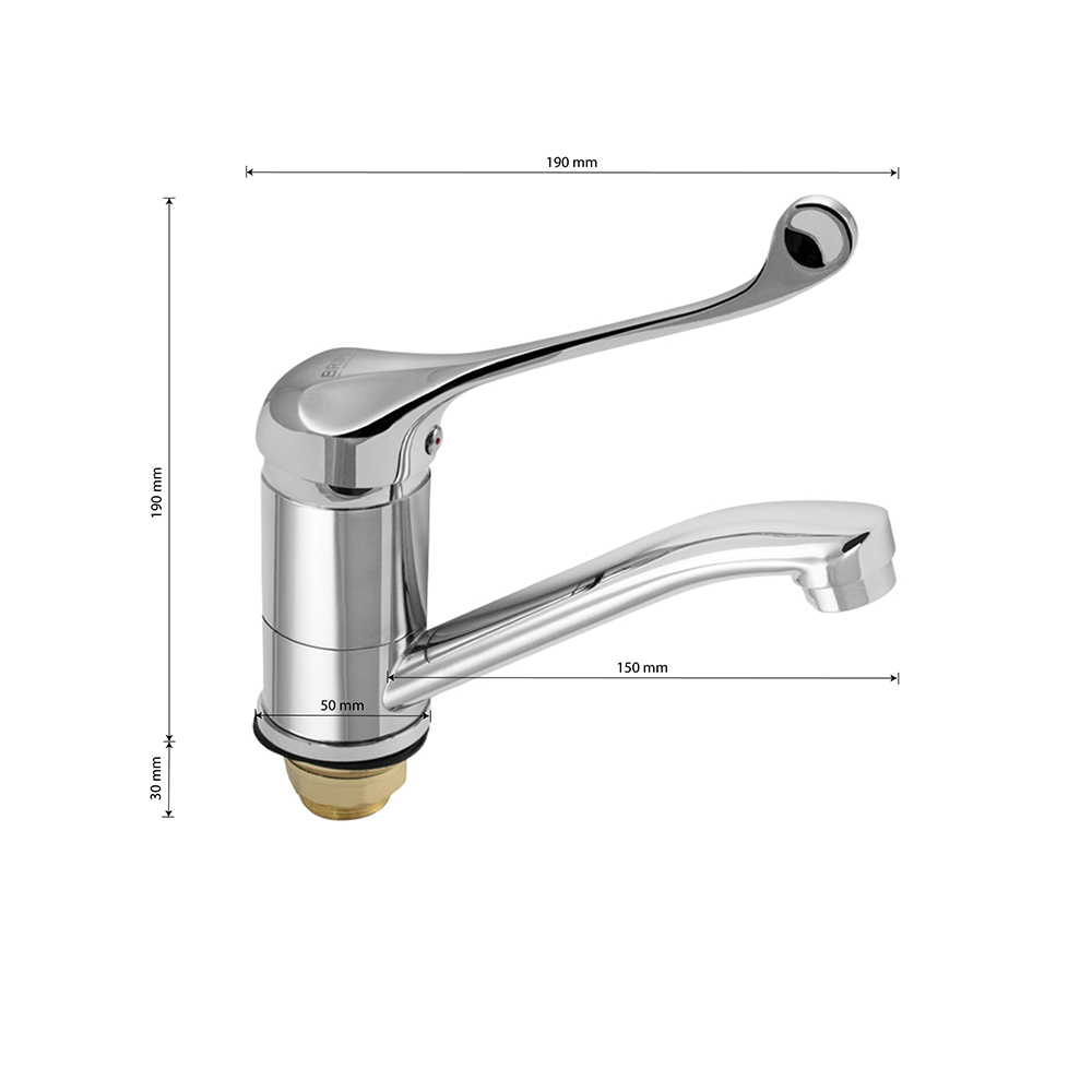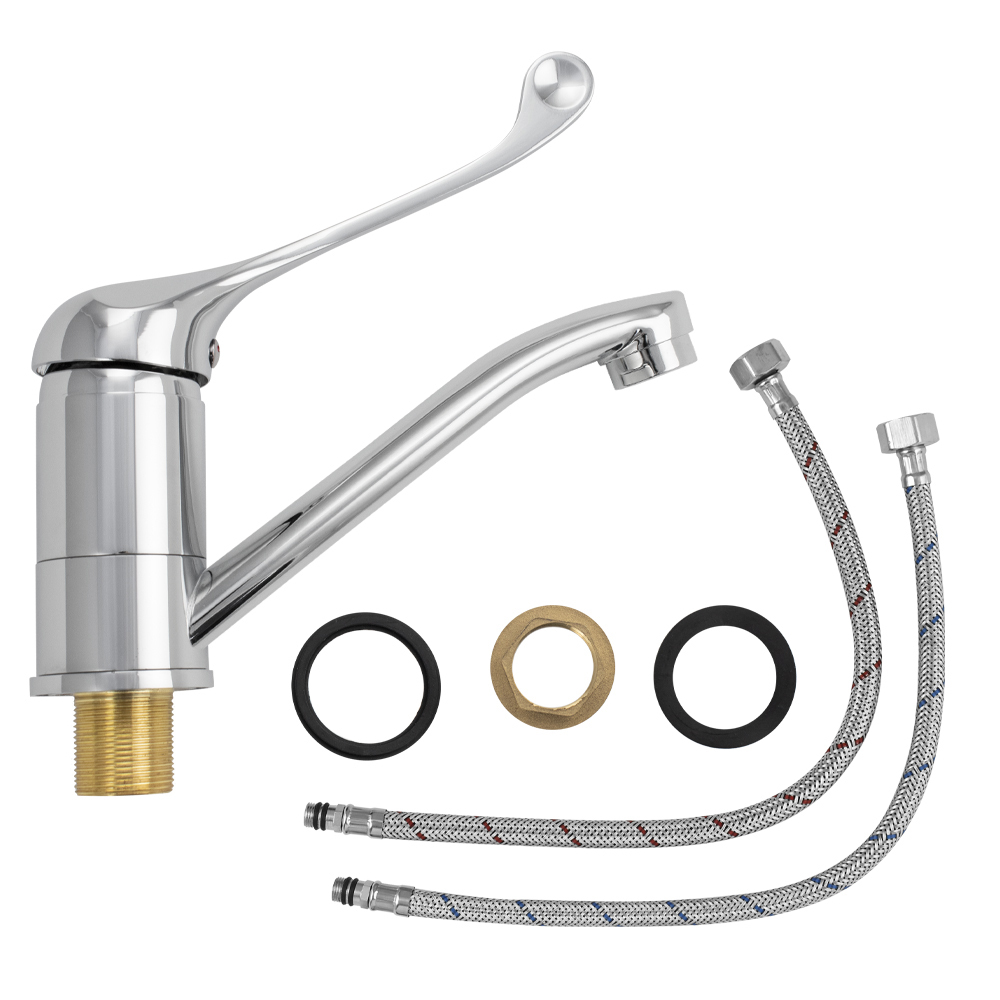Смеситель для кухонной мойки и раковины, латунь, хромированный, с коротким, поворотным изливом, шаровый, медицинская длинная ручка. Материал изготовления — ЦАМ (цинк-алюминий-медь) + нержавеющая сталь. Крепление резьба - гайка, картридж d = 40 мм. Аэратор для экономии воды. Габаритные размеры: высота 190 мм, длина 190 мм, длина излива 150 мм, диаметр посадочного седла 50 мм, длина резьбы 30 мм, длина подводки 400 мм. Вес - 1,000 кг, объём - 0,00376 м3. Такая модель может использоваться на домашней кухне, на даче, в медицинских учреждениях и общественных местах. В комплекте паспорт, корпус, подводка 1/2, крепеж, набор прокладок.