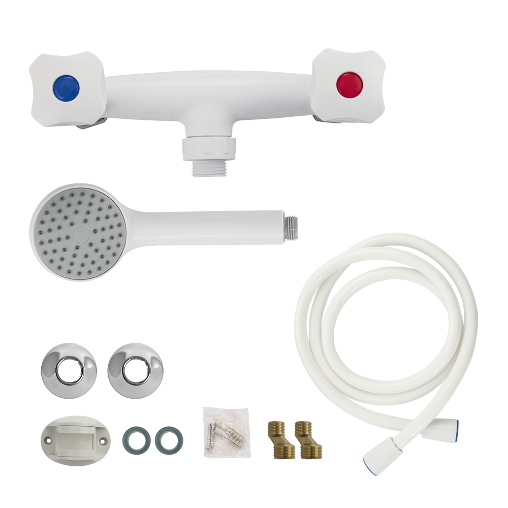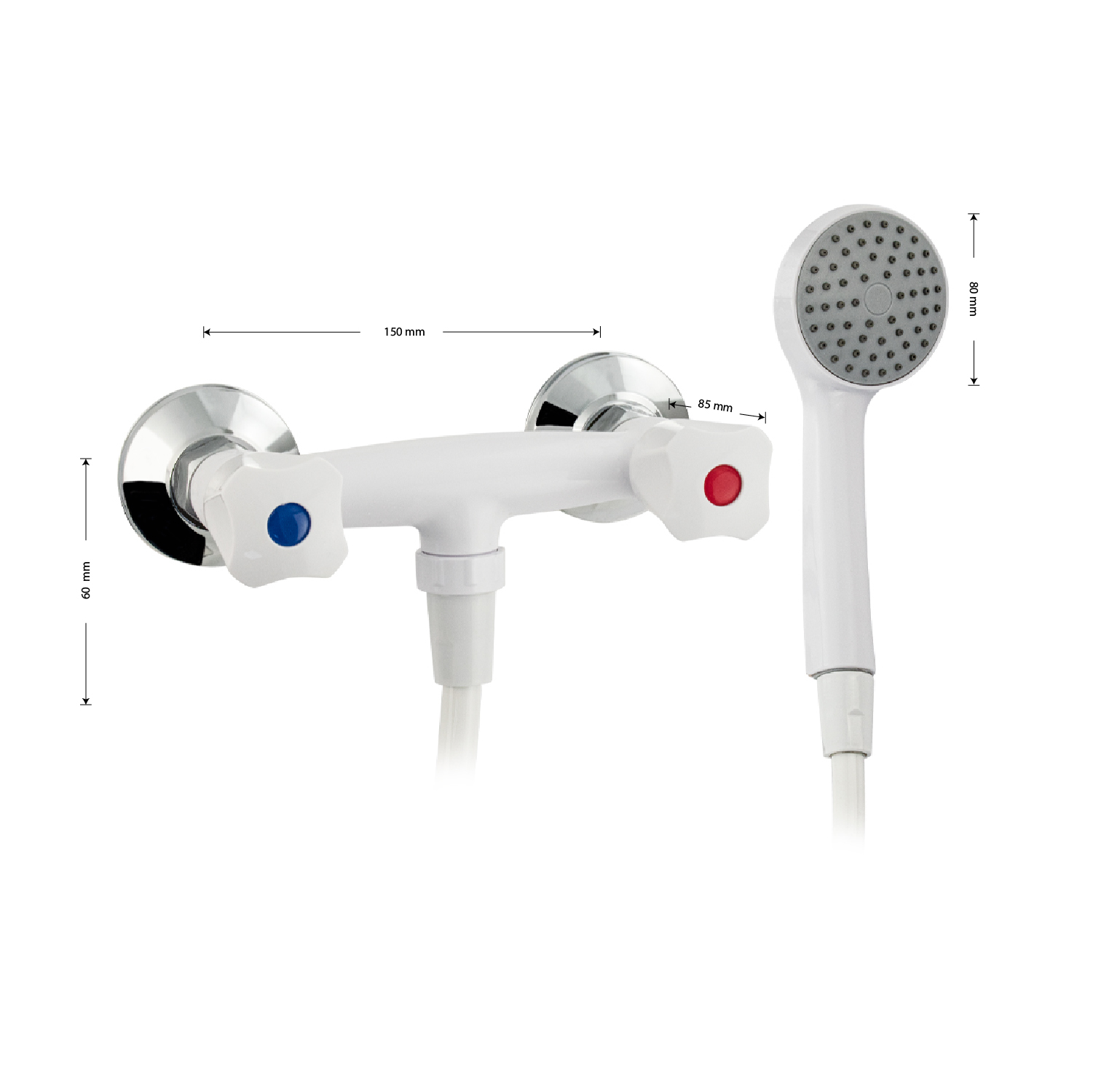 Смеситель из высокопрочного пластика АБС - белый, в ванную/душевую комнату, без излива, литой корпус, металлокерамика. Материал изготовления — пластик. Кранбуксы металлокерамика 1/2, ручки ромб поворот на 90˚. Габаритные размеры: ширина 150 мм, высота корпуса 60 мм, душевая лейка d = 80 мм, пластиковый шланг 150 см, диаметр чашки 65 мм. Вес - 0,800 кг, объём - 0,00600 м3. В комплекте паспорт, корпус, душевая лейка, шланг, кронштейн, комплект крепежа и прокладок.