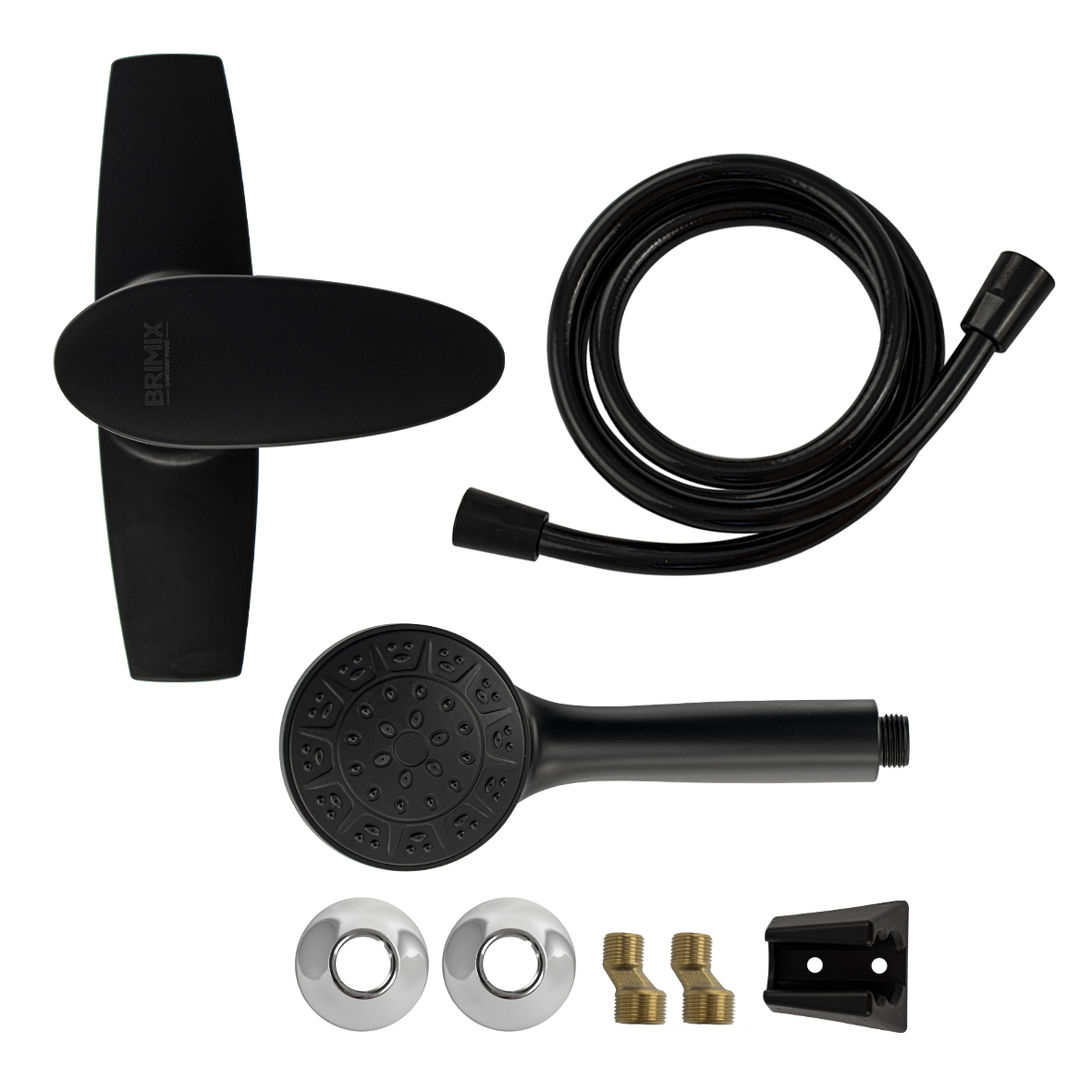 Смеситель из высокопрочного пластика АБС, ЧЕРНЫЙ в ванную / душевую комнату без излива, литой корпус, шаровый. Картридж d = 40 мм, литая ручка, хромированные чашки и эксцентрики. Габаритные размеры: ширина 150 мм, высота корпуса 120 мм, глубина 100 мм, душевая лейка d = 75 мм, пластиковый шланг 150 см. Вес - 0.88 кг, объём - 0.00442 м3. В комплекте паспорт, корпус, душевая лейка, шланг, кронштейн, комплект крепежа и прокладок.