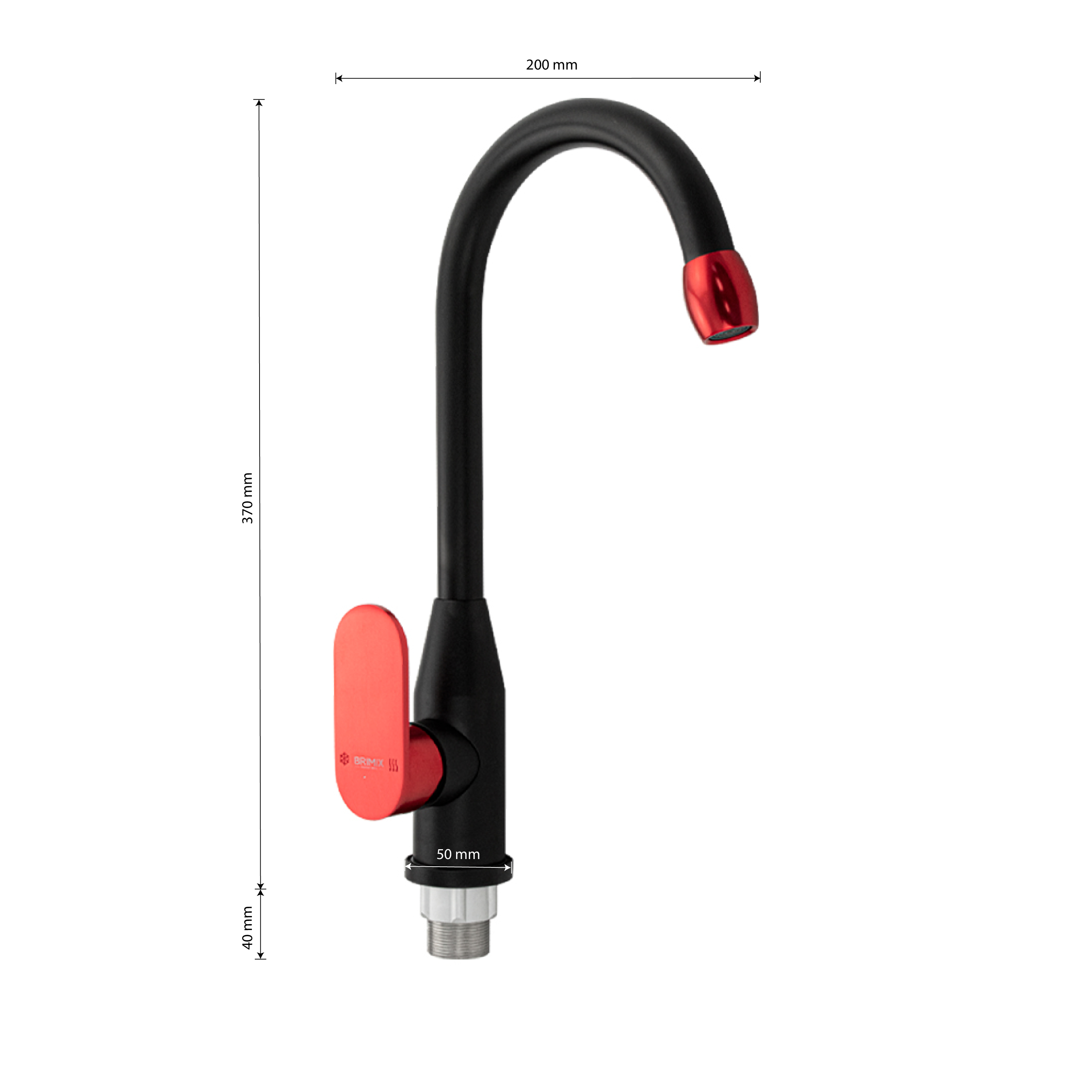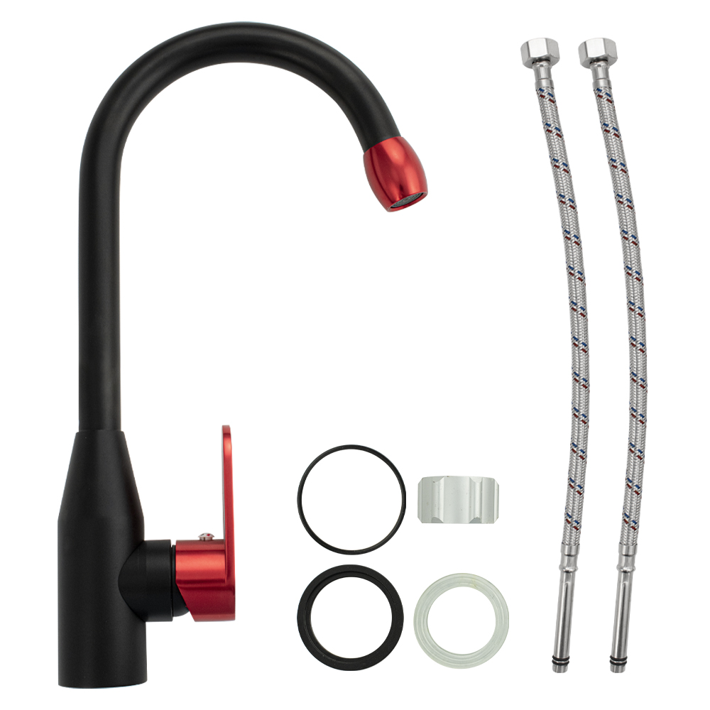 Смеситель для кухонной мойки и раковины, из авиационного алюминия, черного цвета с красной ручкой и аэратором, боковой, с высоким С-образным изливом, шаровый. Крепление резьба - гайка, картридж d = 35 мм, литая красная ручка. Большой аэратор для экономии воды. Габаритные размеры: высота 370 мм, длина 200 мм, диаметр посадочного седла 50 мм, длина резьбы 40 мм, длина подводки 350 мм. Вес - 1,500 кг, объём - 0,00627 м3. В комплекте паспорт, корпус с изливом, подводка 1/2, крепеж, набор прокладок.