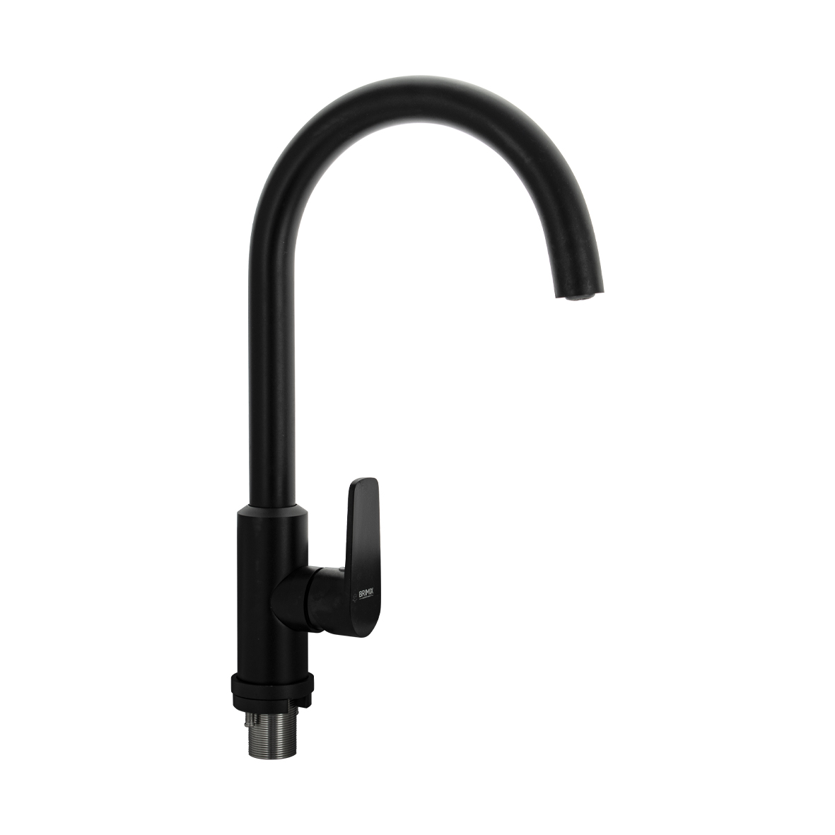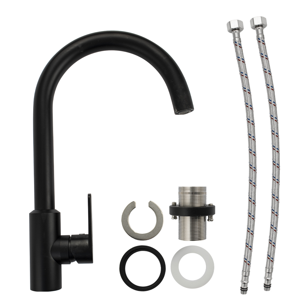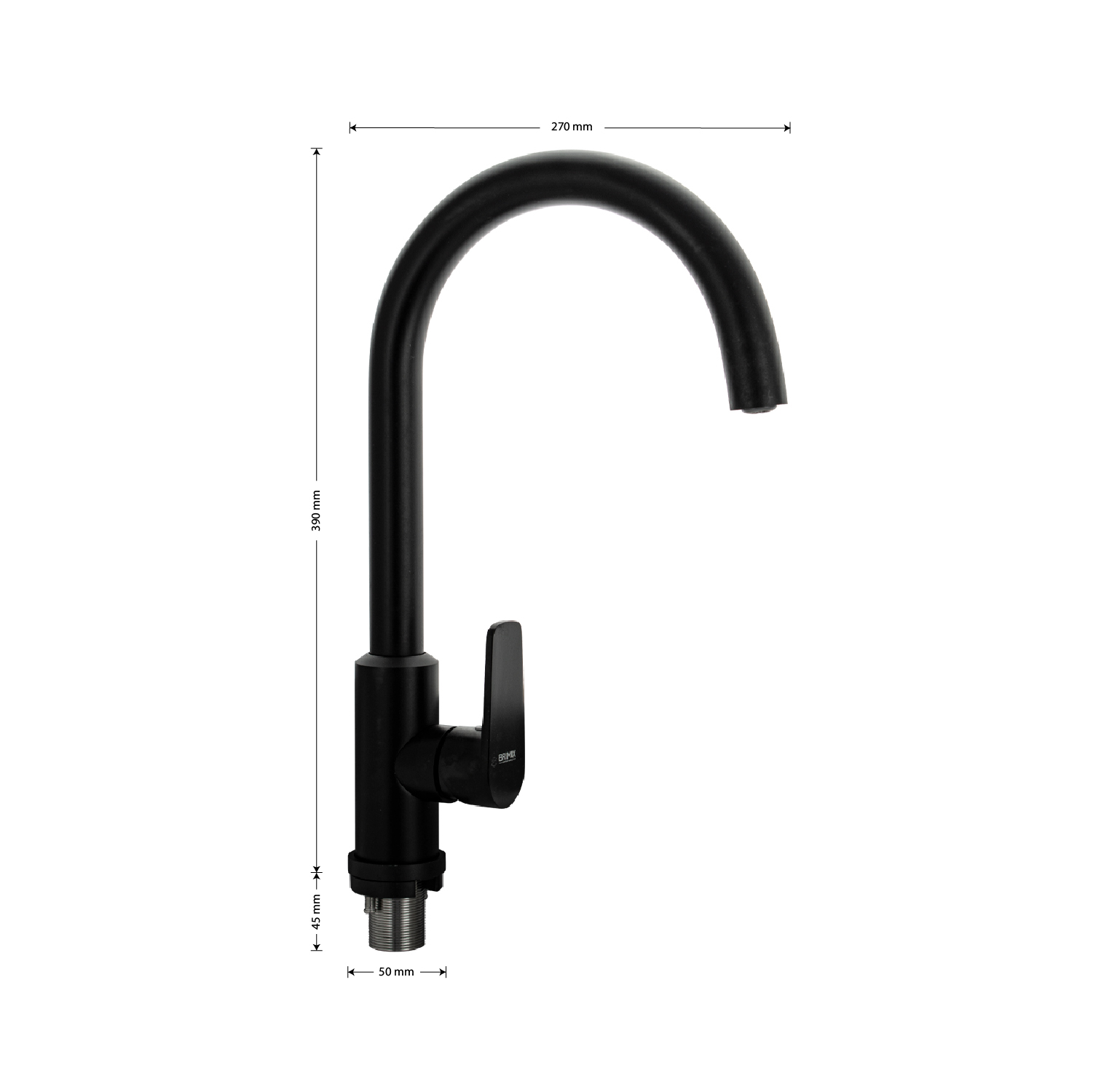Смеситель для кухонной мойки и раковины, из авиационного алюминия, черный, боковой, с высоким С- образным изливом, шаровый. Крепление резьба - гайка, картридж d = 40 мм, литая ручка. Большой аэратор для экономии воды. Габаритные размеры: высота 390 мм, длина 270 мм, диаметр посадочного седла 50 мм, длина резьбы 45 мм, длина подводки мм. Вес - 1,47 кг, объём - 0,0066 м3. В комплекте паспорт, корпус с изливом, подводка 1/2, крепеж, набор прокладок.