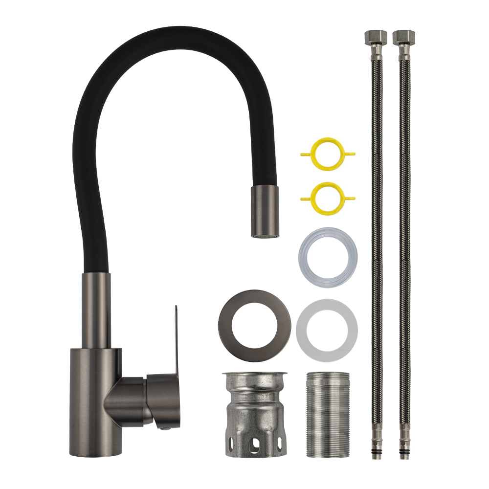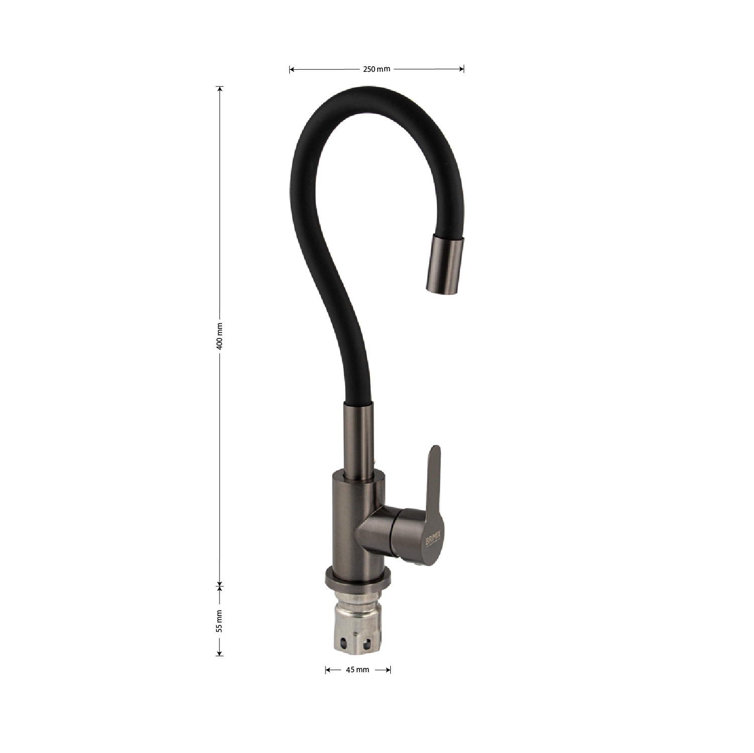 Смеситель для кухонной мойки и раковин, литой корпус цвета графит, из нержавеющей стали марки SUS 304, с высоким гибким изливом, чёрного цвета, с аэратором для экономии воды, шаровый. Крепление резьба - гайка, картридж d = 35 мм, ручка литая. Такая модель может использоваться на домашней кухне, на даче, в медицинских учреждениях и общественных местах. Габаритные размеры: высота до 400 мм, длина до 250 мм, диаметр посадочного седла 45 мм, длина резьбы 55 мм, длина подводки 400 мм. Вес - 1,700 кг, объём - 0,004 м3. В комплекте паспорт, корпус с изливом, подводка 1/2, крепеж, набор прокладок.