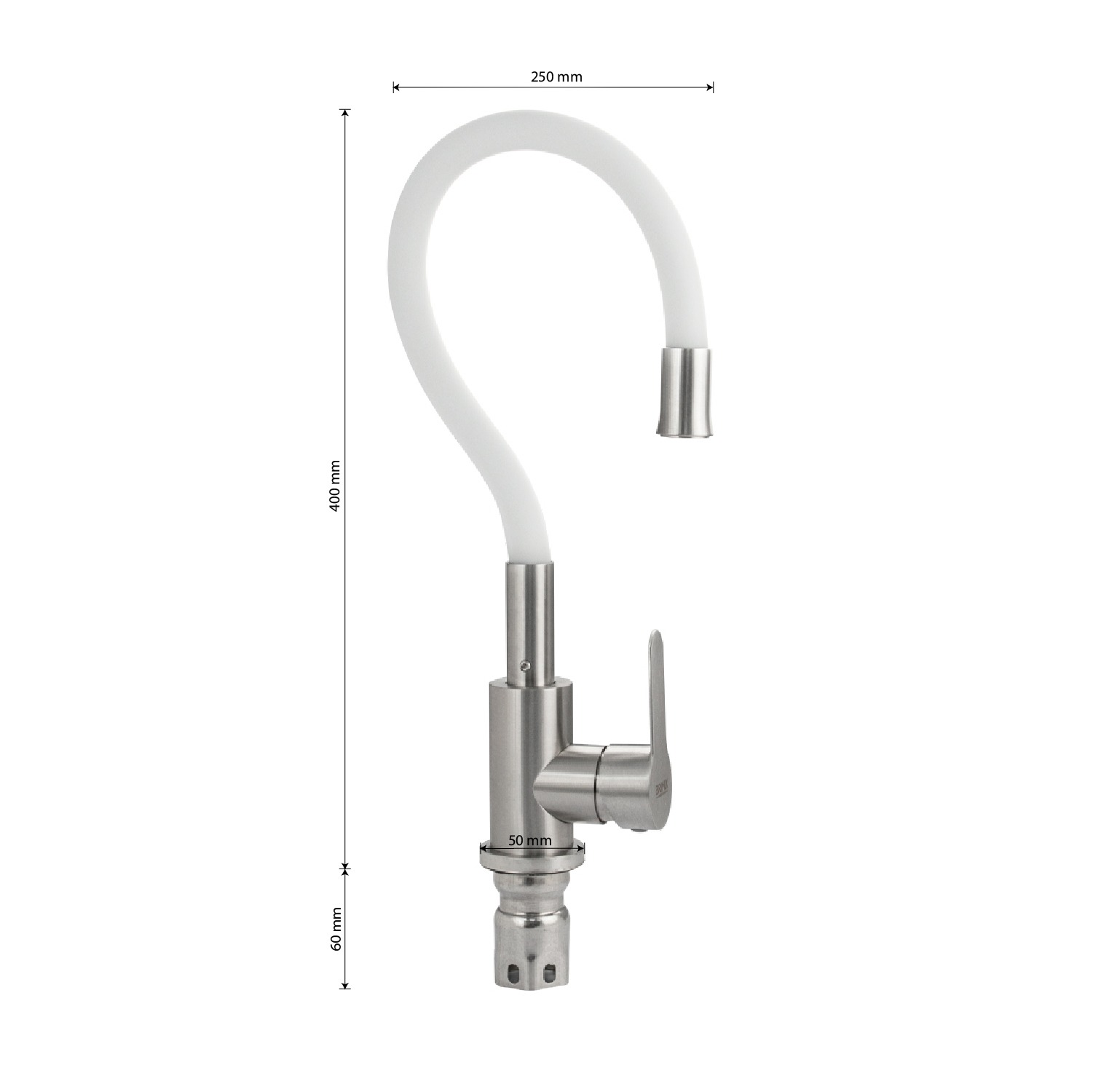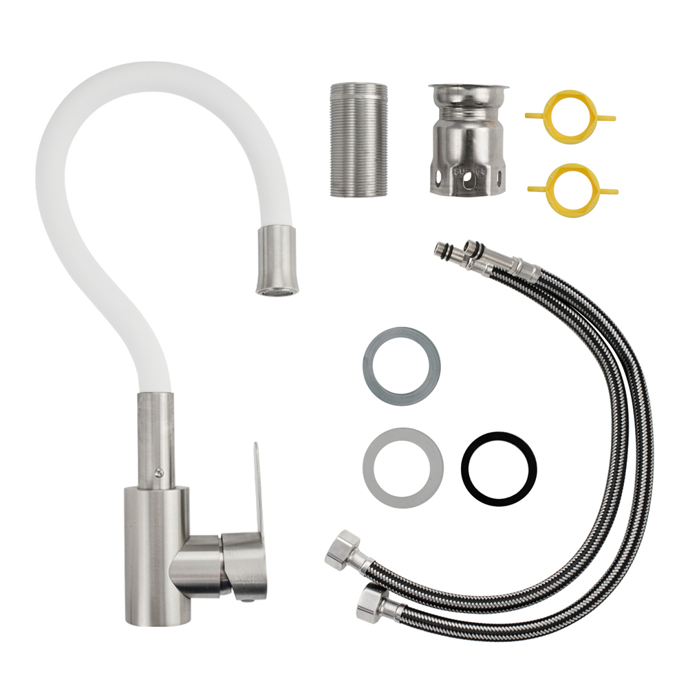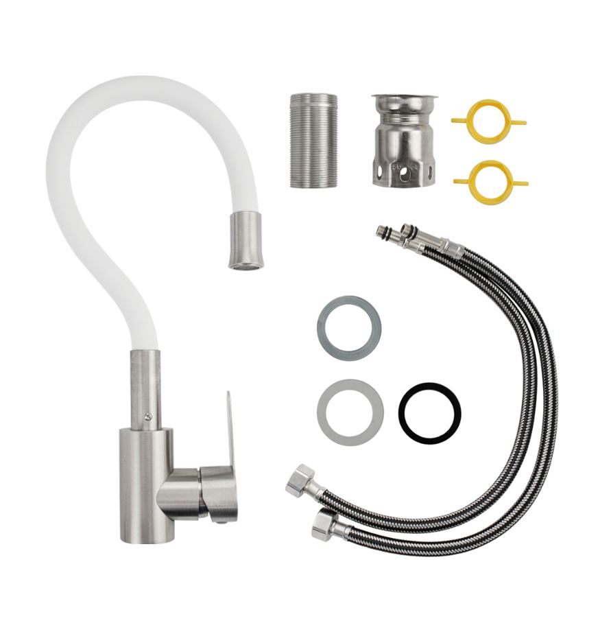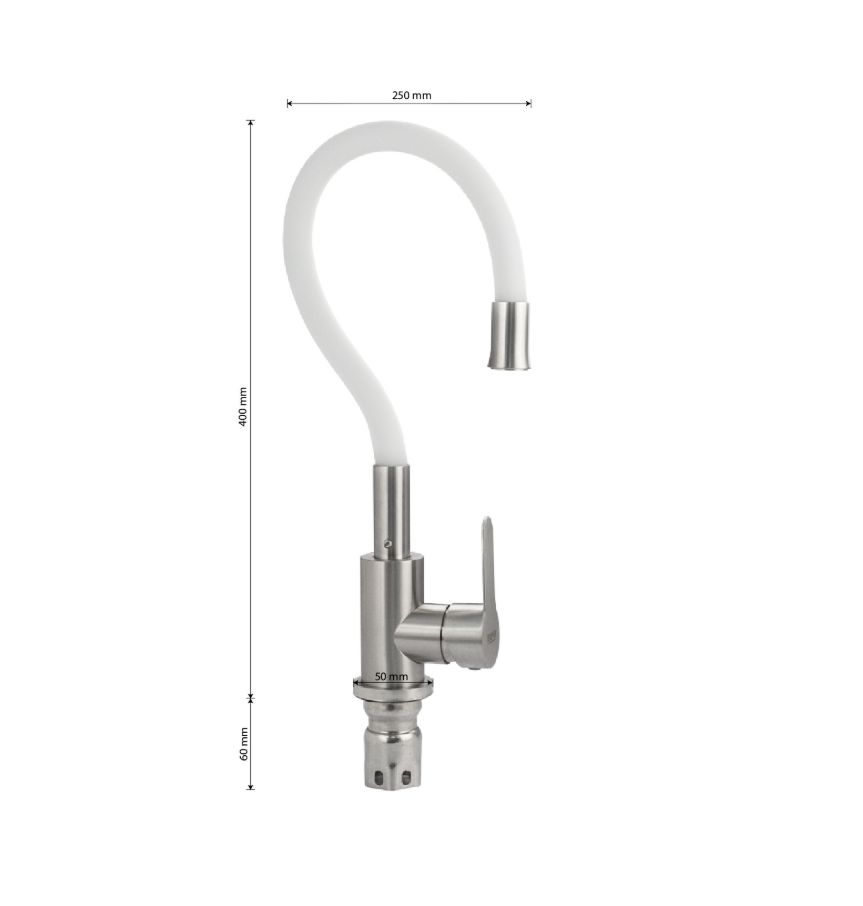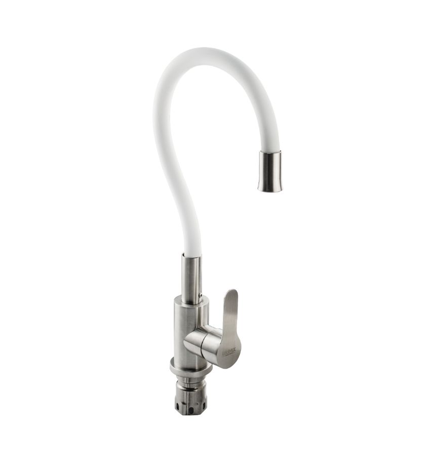 Смеситель для кухонной мойки и раковин, литой матовый корпус, из нержавеющей стали марки 304, с высоким гибким изливом белого цвета на трещётке, с аэратором для экономии воды, шаровый. Крепление резьба - гайка, картридж d = 35 мм, ручка литая. Такая модель может использоваться на домашней кухне, на даче, в медицинских учреждениях и общественных местах. Габаритные размеры: высота 400 мм, длина 250 мм, диаметр посадочного седла 50 мм, длина резьбы 60 мм, длина подводки 450 мм. Вес - 1,800 кг, объём - 0,00546 м3. В комплекте паспорт, корпус с изливом, подводка 1/2, крепеж, набор прокладок.