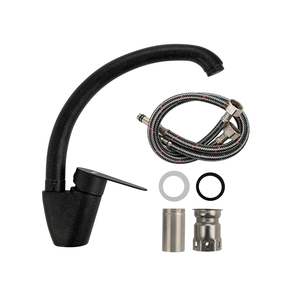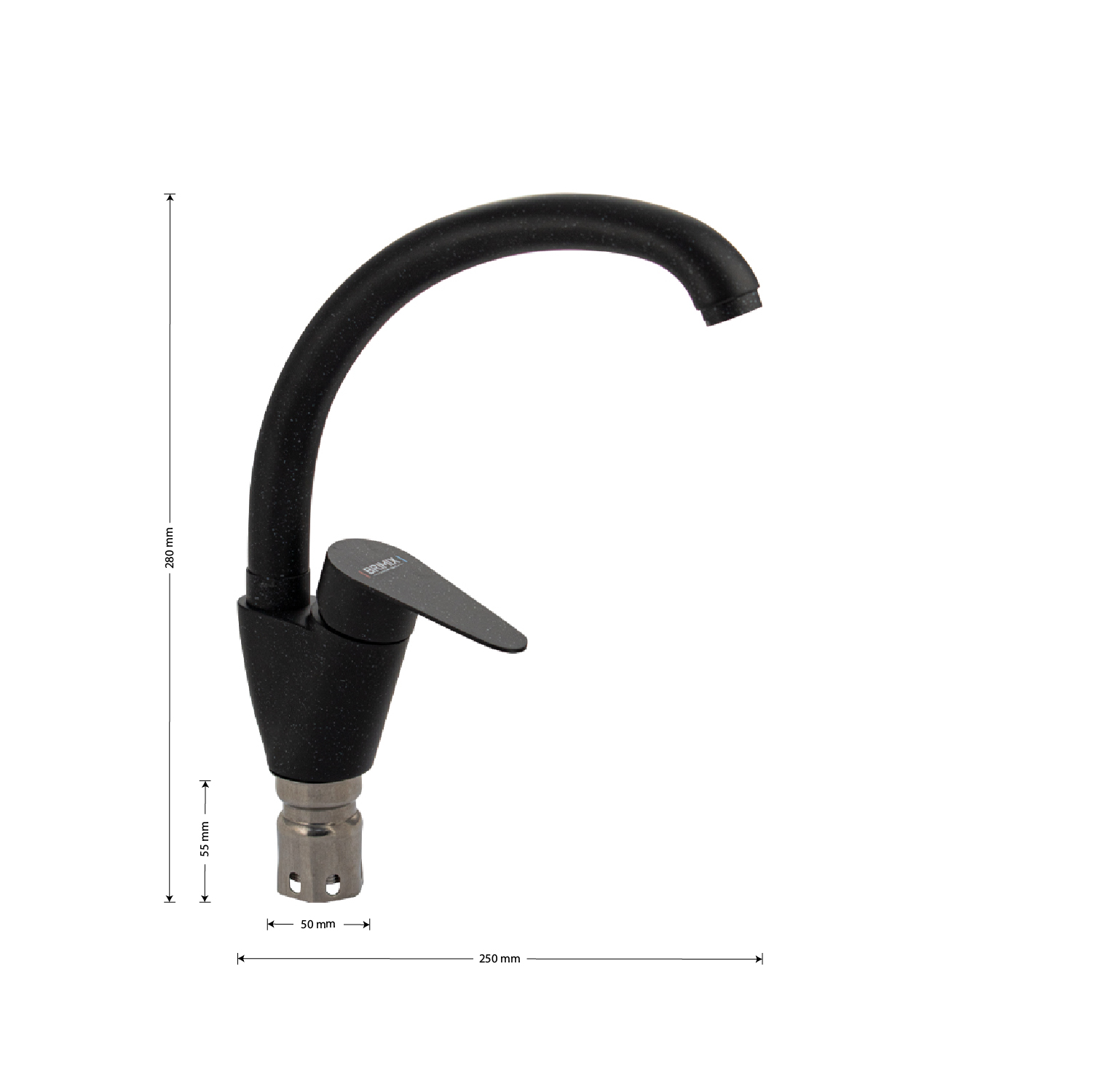 Смеситель для кухонной мойки и раковин, боковой, шаровый, корпус комбинированный, чёрная матовая эмаль с вкраплениями и с хромом, с высоким С-образным изливом, Материал изготовления — нержавеющая сталь. Крепление резьба - гайка, картридж d = 40 мм, ручка с прорезью. Аэратор для экономии воды. Габаритные размеры: высота 280 мм, длина 250 мм, диаметр посадочного седла 50 мм, длина резьбы 55 мм, длина подводки 500 мм. Вес - 1,100 кг, объём - 0,00420 м3. В комплекте паспорт, корпус с изливом, подводка 1/2, крепеж, набор прокладок.