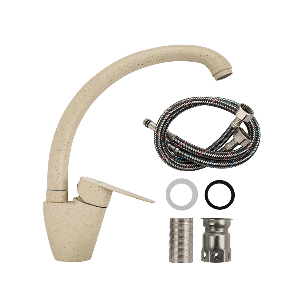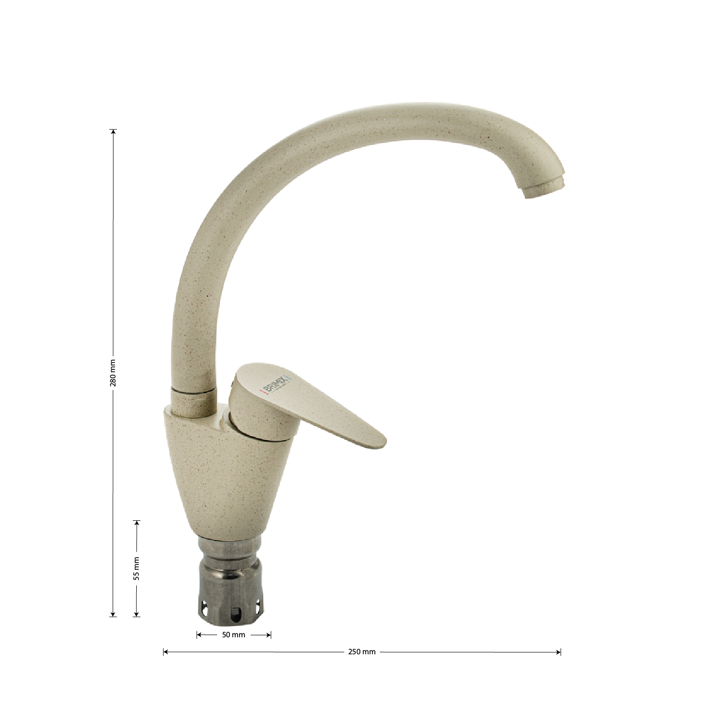 Смеситель для кухонной мойки и раковин, боковой, шаровый, корпус комбинированный, тёмно-бежевая матовая эмаль с вкраплениями и с хромом, с высоким С-образным изливом. Материал изготовления — нержавеющая сталь. Крепление резьба - гайка, картридж d = 40 мм, ручка с прорезью. Аэратор для экономии воды. Габаритные размеры: высота 280 мм, длина 250 мм, диаметр посадочного седла 50 мм, длина резьбы 55 мм, длина подводки 500 мм. Вес - 1,110 кг, объём - 0,00420 м3. В комплекте паспорт, корпус с изливом, подводка 1/2, крепеж, набор прокладок.