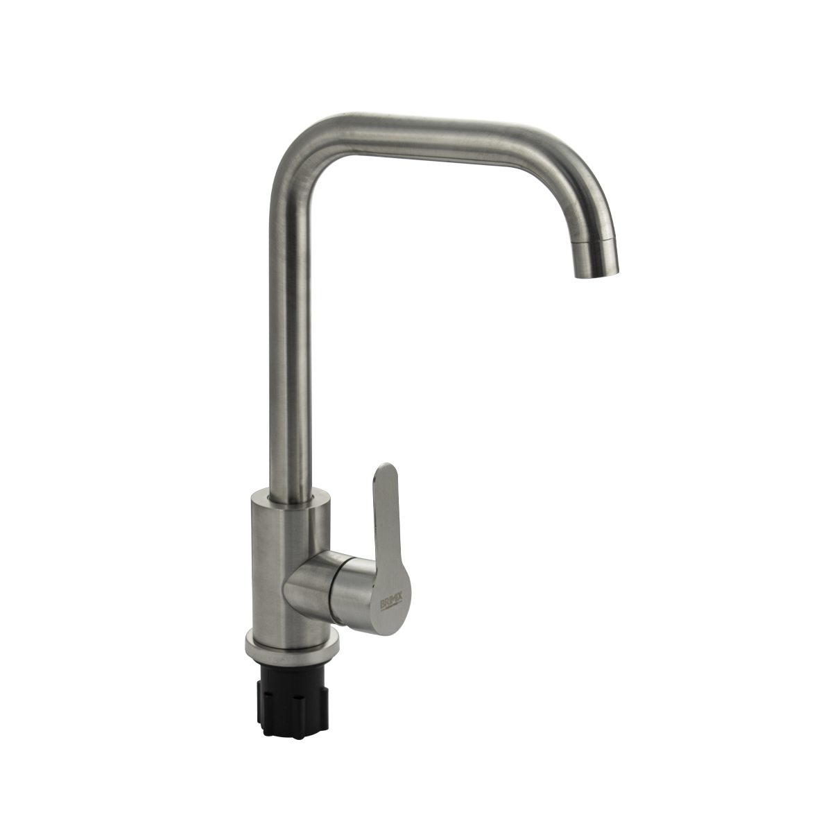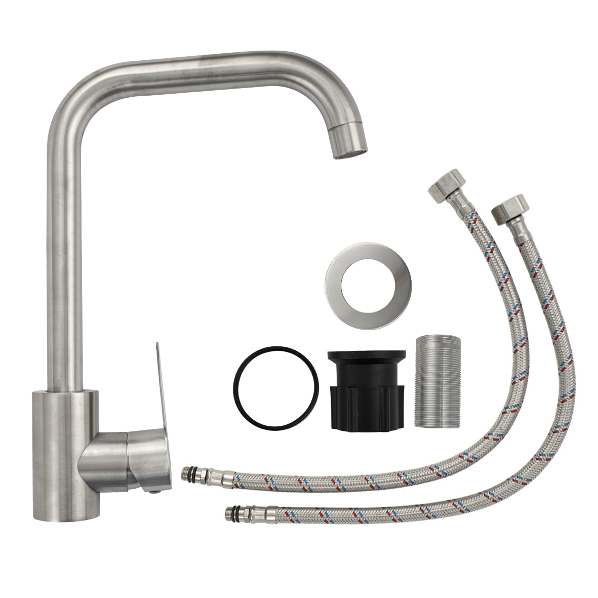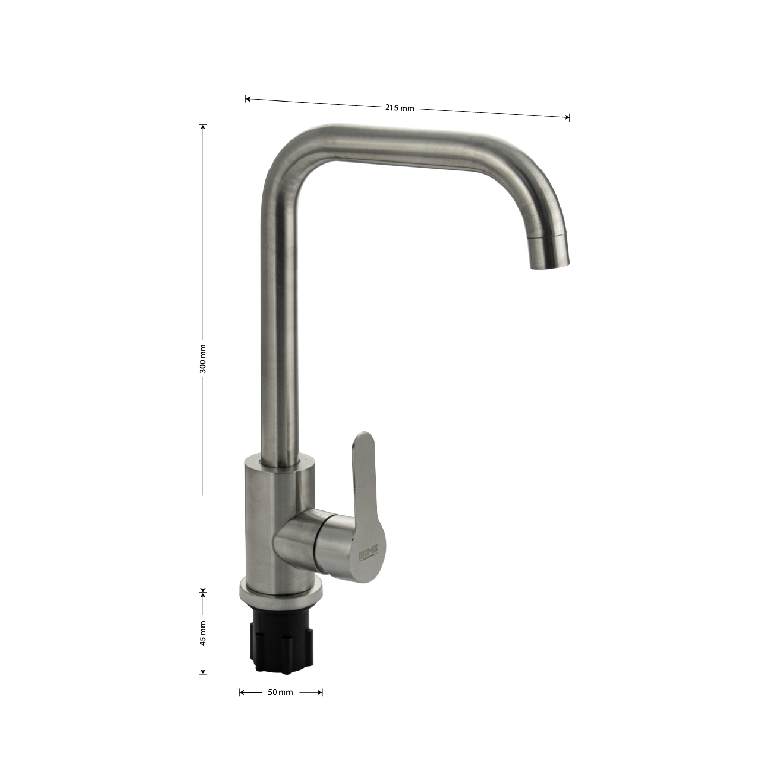 Смеситель для кухонной мойки и раковин, литой матовый корпус, из нержавеющей стали марки 304, с высоким Г-образным изливом, шаровый, Крепление резьба - гайка, картридж d = 35 мм, ручка литая. Аэратор для экономии воды. Такая модель может использоваться на домашней кухне, на даче, в медицинских учреждениях и общественных местах. Габаритные размеры: высота 300 мм, длина 215 мм, диаметр посадочного седла 50 мм, длина резьбы 45 мм, длина подводки 450 мм. Вес - 1,40 кг, объём - 0,005 м3. В комплекте паспорт, корпус с изливом, подводка 1/2, крепеж, набор прокладок.