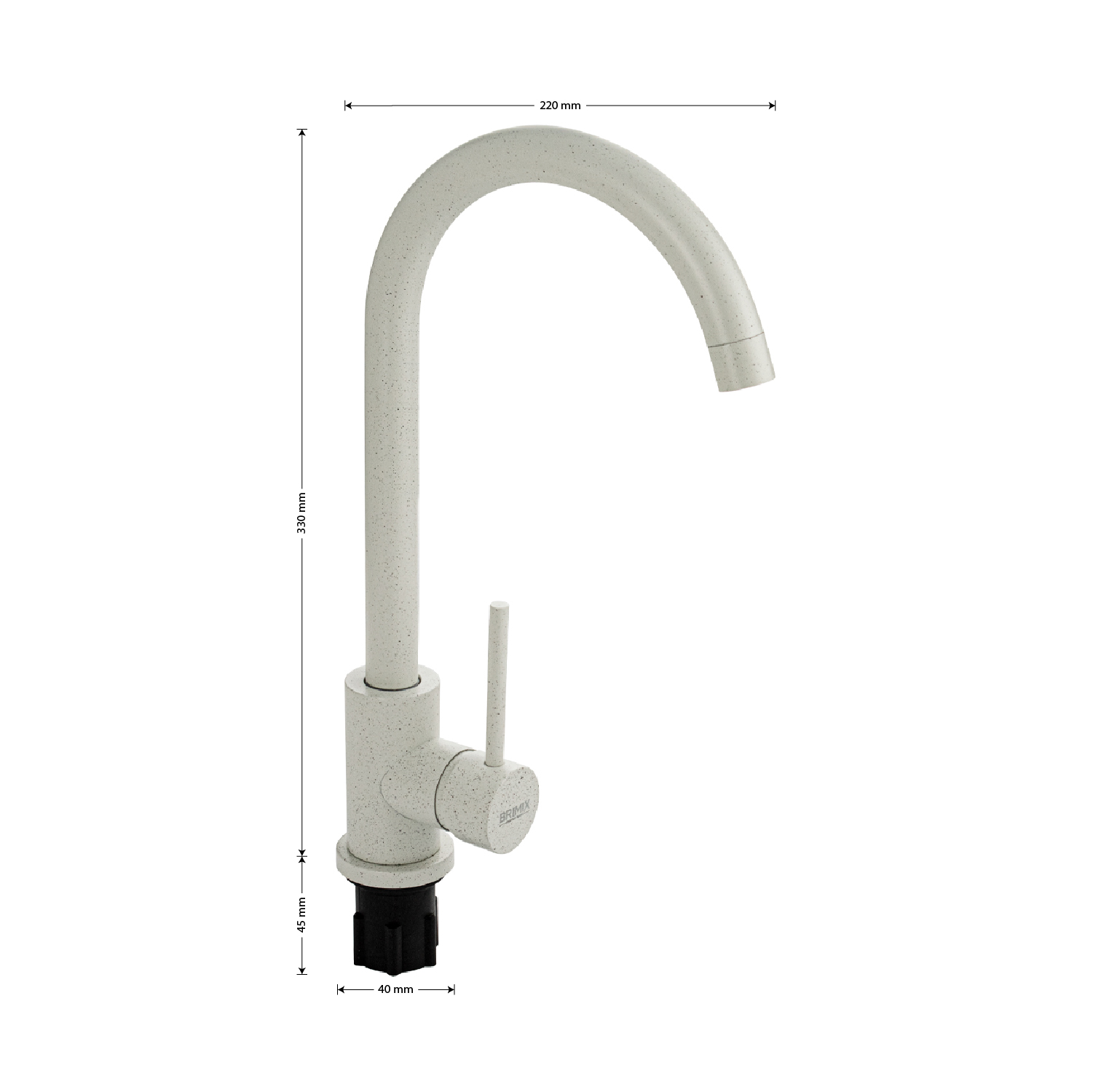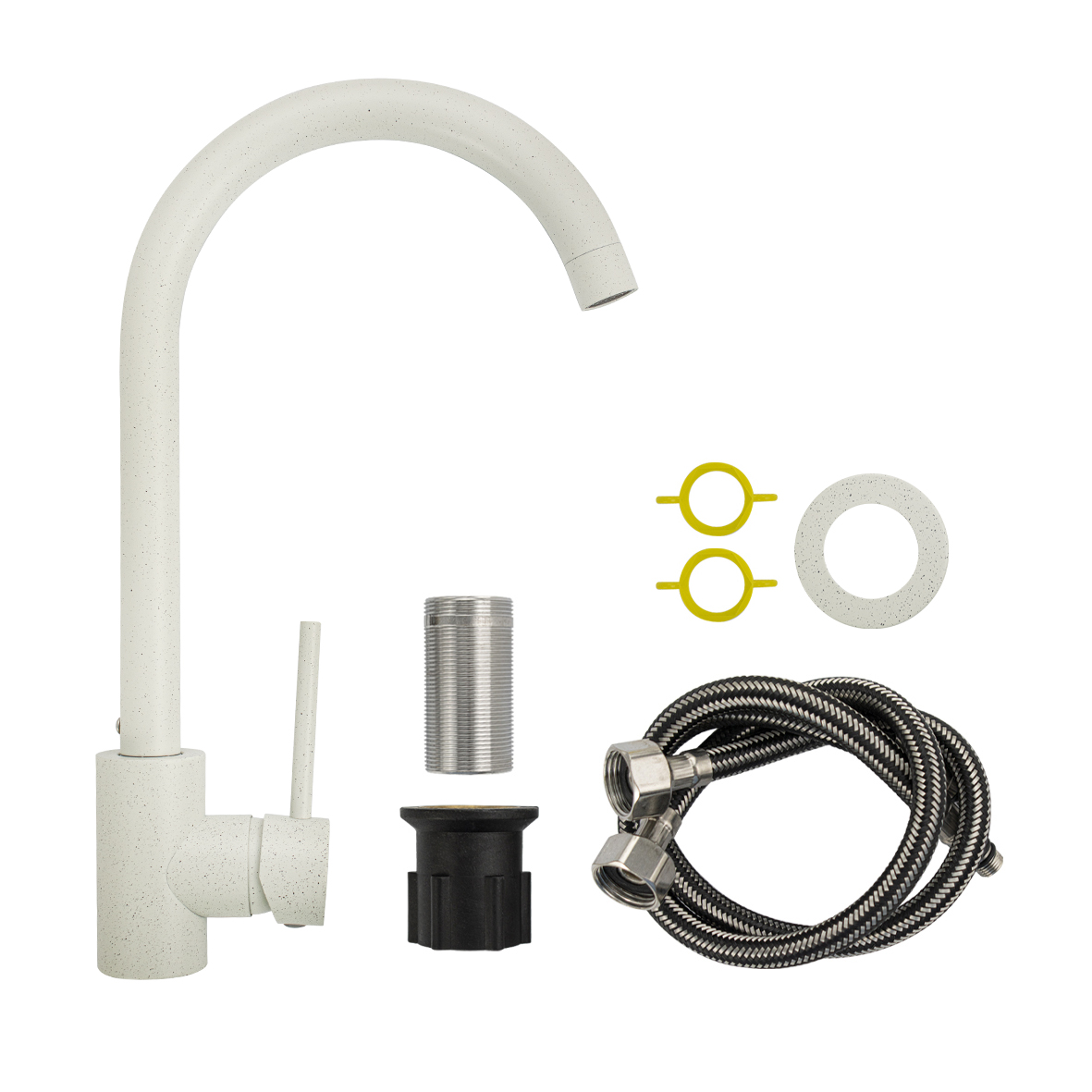 Смеситель для кухонной мойки и раковин, литой матовый корпус, из нержавеющей стали марки 304, с высоким С-образным изливом, шаровый. Цвет белая эмаль с вкраплениями. Крепление резьба - гайка, картридж d = 35 мм, ручка литая. Аэратор для экономии воды. Такая модель может использоваться на домашней кухне, на даче, в медицинских учреждениях и общественных местах. Габаритные размеры: высота 330 мм, длина 220 мм, диаметр посадочного седла 40 мм, длина резьбы 450 мм, длина подводки 450 мм. Вес - 1.38 кг, объём - 0.0055 м3. В комплекте паспорт, корпус с изливом, подводка 1/2, крепеж, набор прокладок.