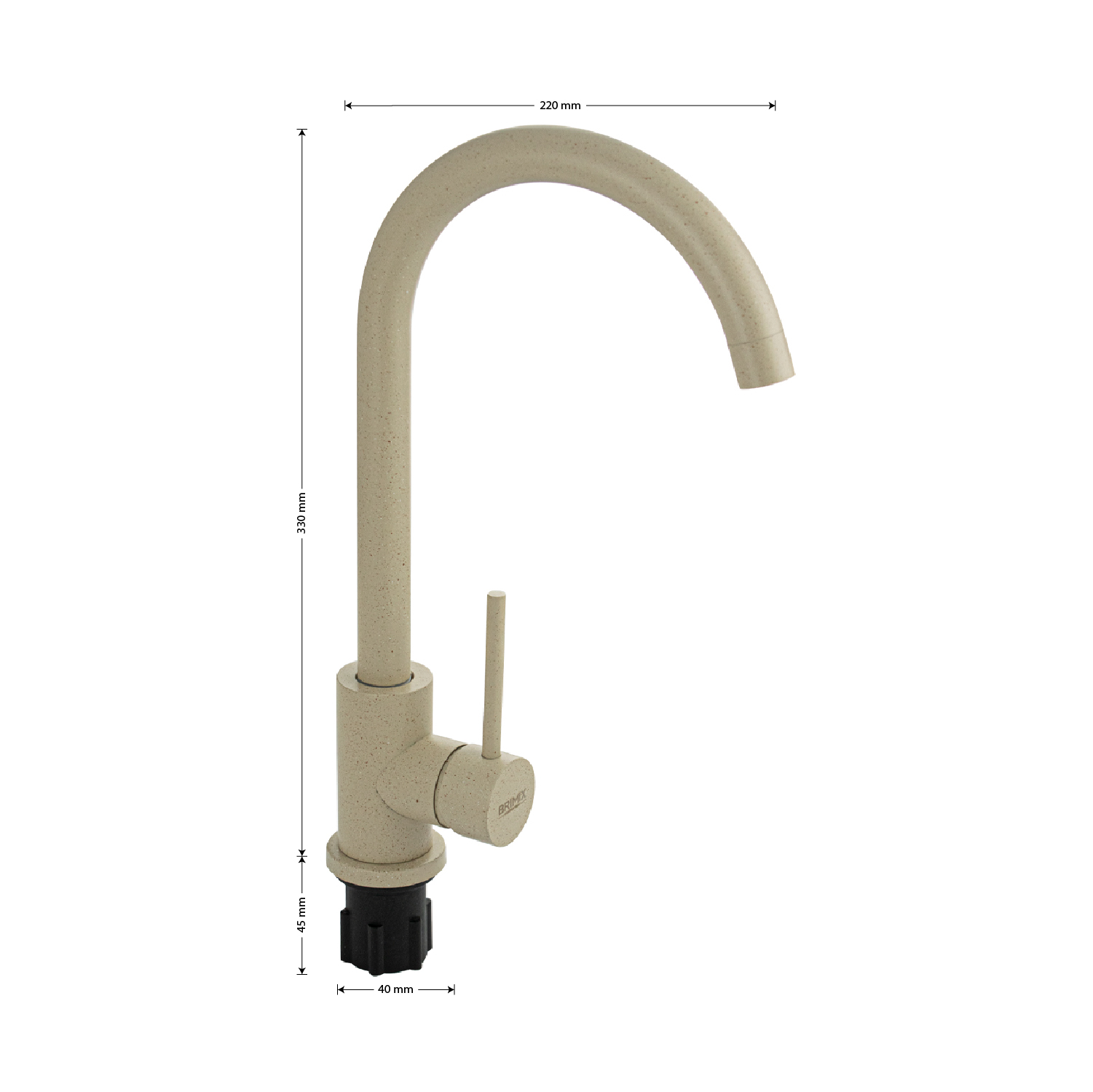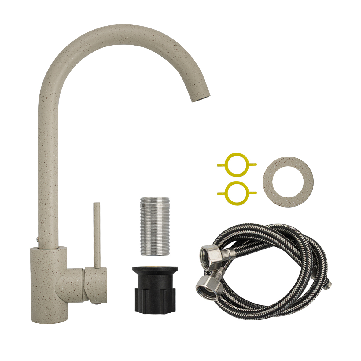Смеситель для кухонной мойки и раковин, литой матовый корпус, из нержавеющей стали марки 304, с высоким С-образным изливом, шаровый. Цвет светло-бежевая эмаль с вкраплениями. Крепление резьба - гайка, картридж d = 35 мм, ручка литая. Аэратор для экономии воды. Такая модель может использоваться на домашней кухне, на даче, в медицинских учреждениях и общественных местах. Габаритные размеры: высота 330 мм, длина 220 мм, диаметр посадочного седла 40 мм, длина резьбы 45 мм, длина подводки 450 мм. Вес - 1.37 кг, объём - 0.0055 м3. В комплекте паспорт, корпус с изливом, подводка 1/2, крепеж, набор прокладок.