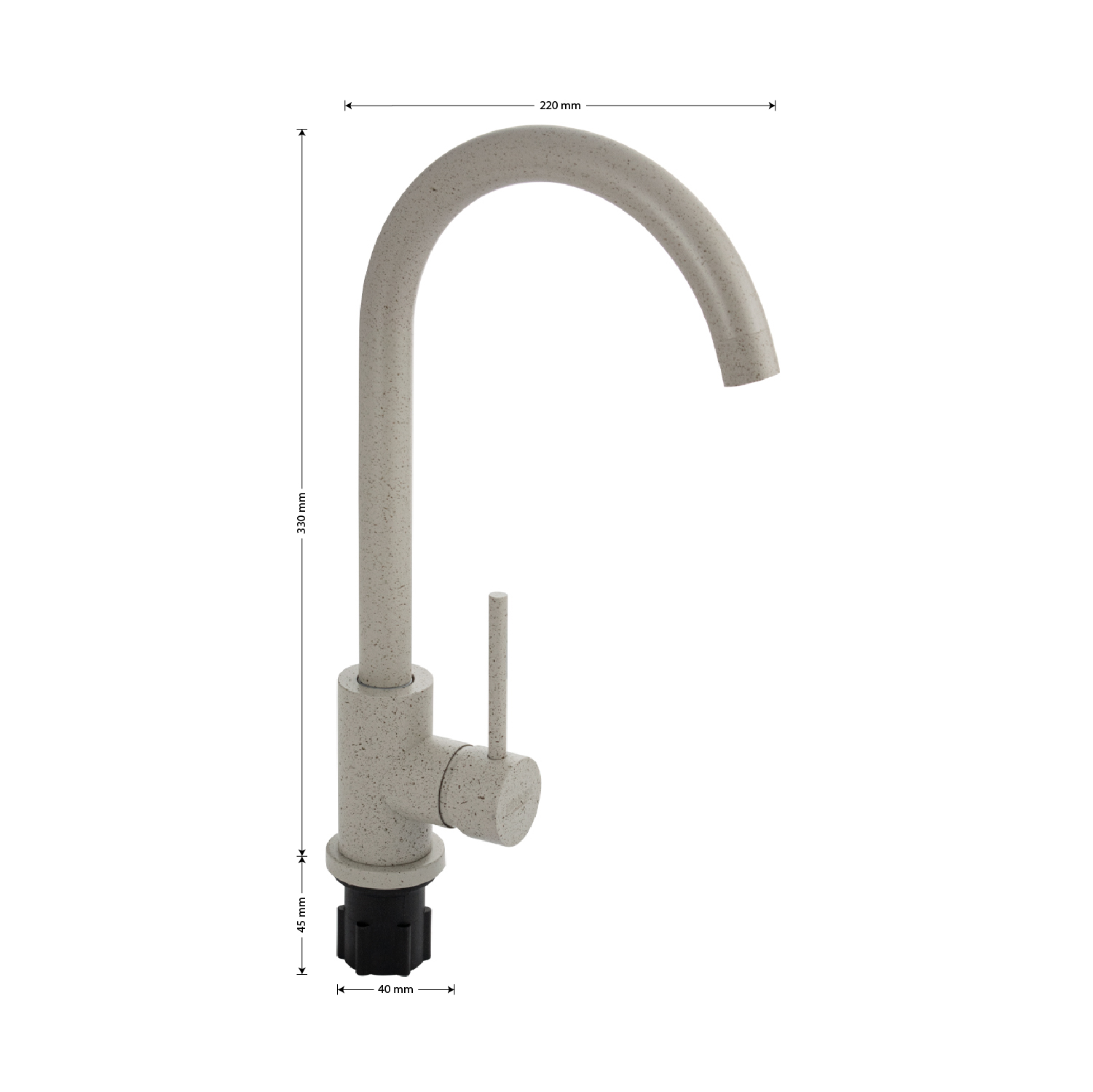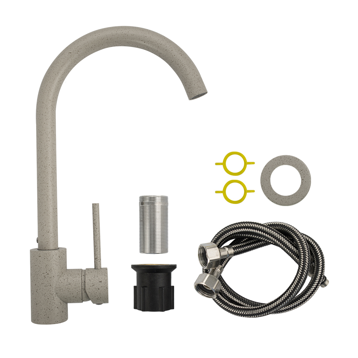 Смеситель для кухонной мойки и раковин, литой матовый корпус, из нержавеющей стали марки 304, с высоким С-образным изливом, шаровый. Цвет тёмно-бежевая эмаль с вкраплениями. Крепление резьба - гайка, картридж d = 35 мм, ручка литая. Аэратор для экономии воды. Такая модель может использоваться на домашней кухне, на даче, в медицинских учреждениях и общественных местах. Габаритные размеры: высота 330 мм, длина 220 мм, диаметр посадочного седла 40 мм, длина резьбы 45 мм, длина подводки 450 мм. Вес - 1.38 кг, объём - 0.0055 м3. В комплекте паспорт, корпус с изливом, подводка 1/2, крепеж, набор прокладок.