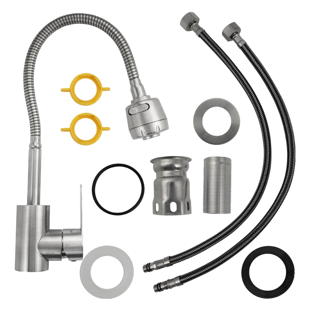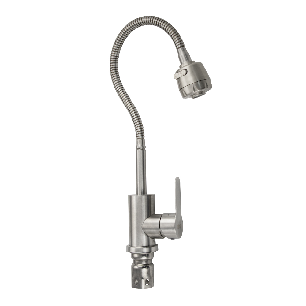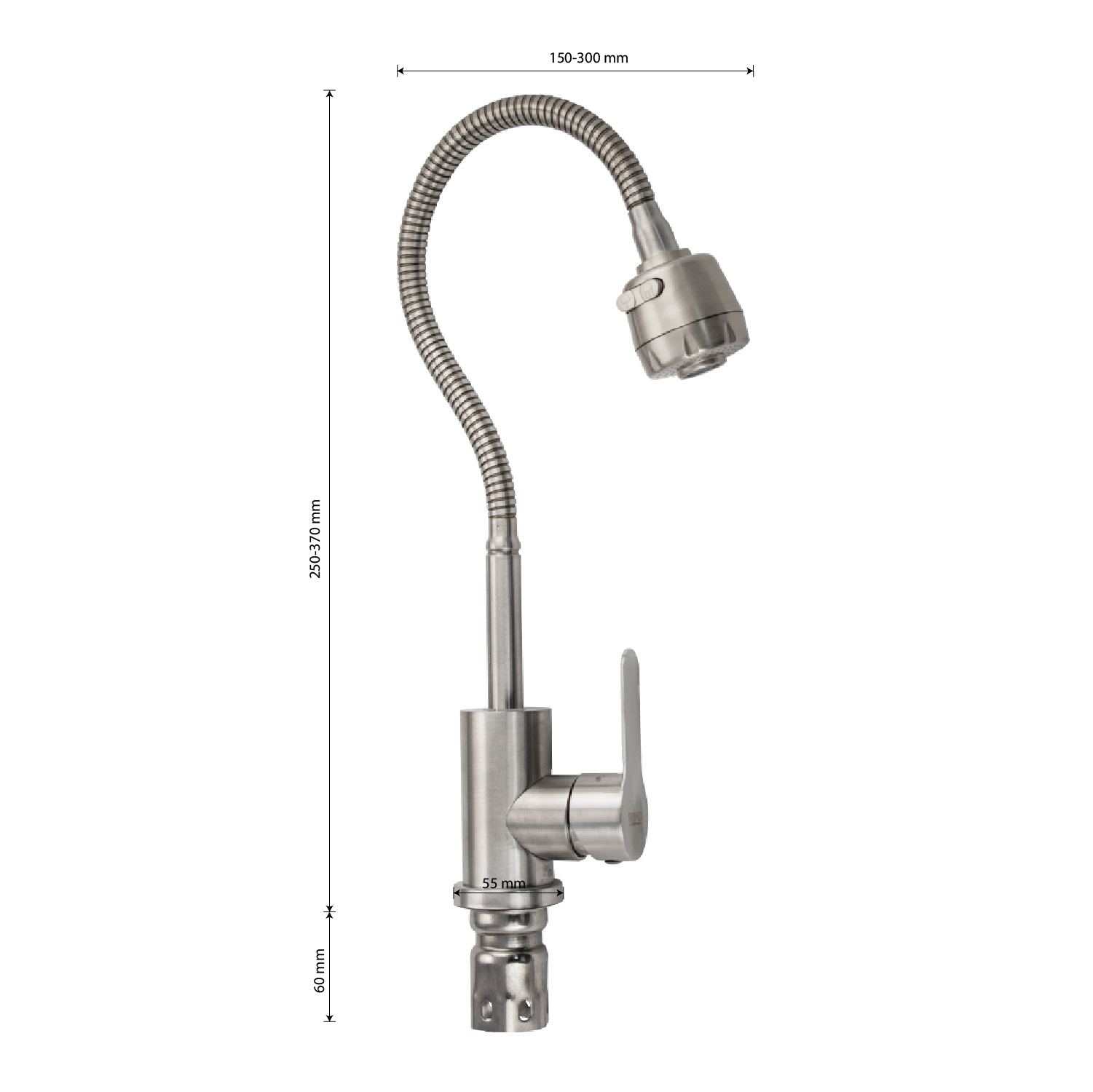 Смеситель для кухонной мойки и раковин, литой матовый корпус, из нержавеющей стали марки 304, с высоким гибким изливом, с большим двухрежимным аэратором для экономии воды, шаровый. Крепление резьба - гайка, картридж d = 35 мм, ручка литая. Такая модель может использоваться на домашней кухне, на даче, в медицинских учреждениях и общественных местах. Габаритные размеры: высота 250 - 370 мм, длина 150 - 300 мм, диаметр посадочного седла 55 мм, длина резьбы 60 мм, длина подводки 450 мм. Вес - 1,740 кг, объём - 0,006 м3. В комплекте паспорт, корпус с изливом, подводка 1/2, крепеж, набор прокладок.